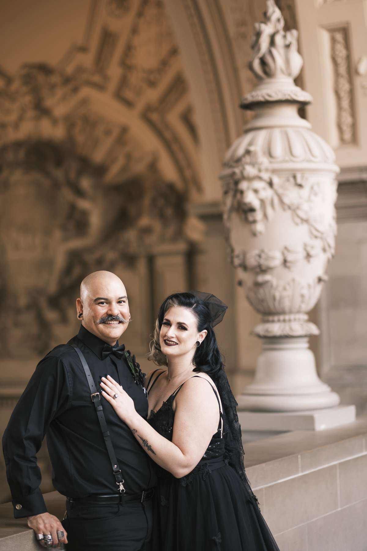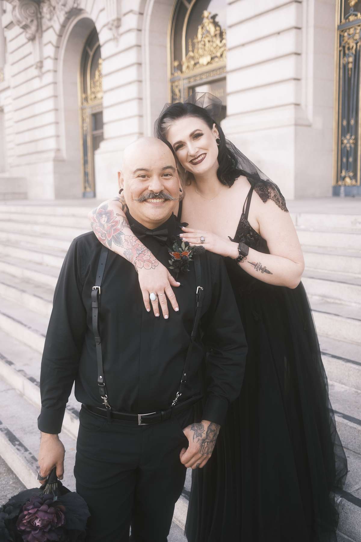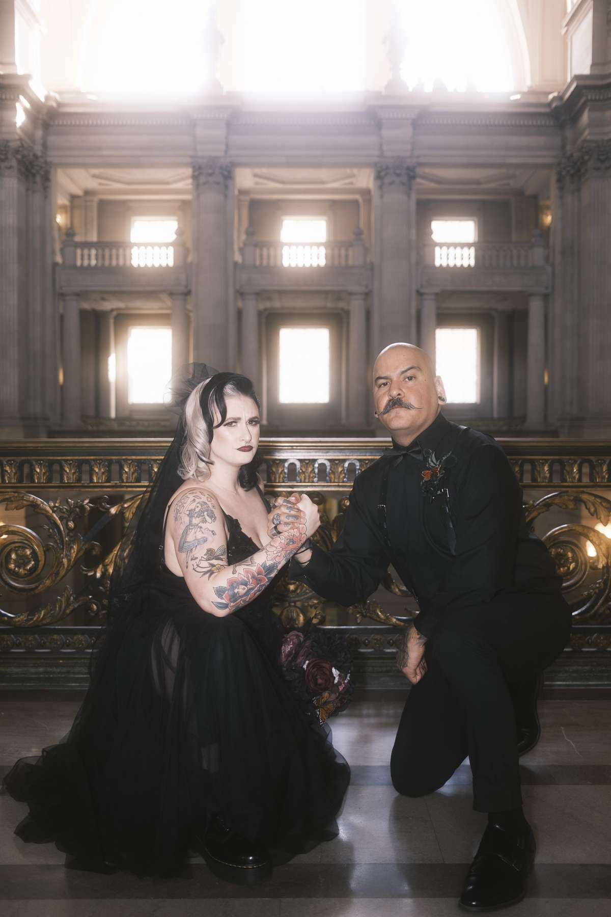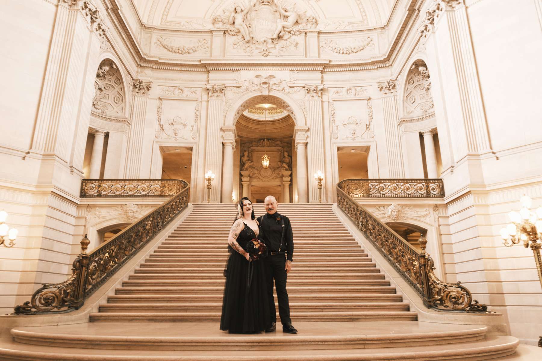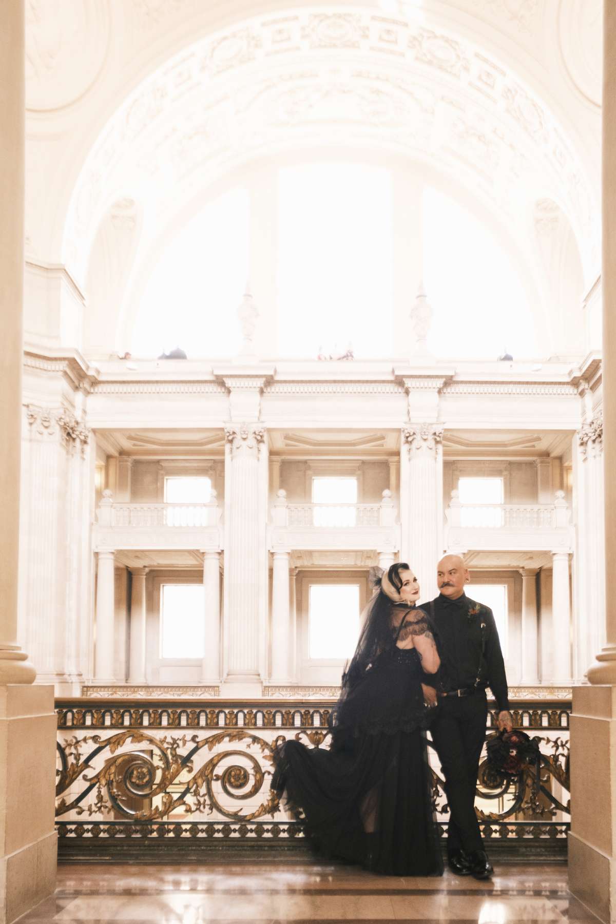 The couple chose San Francisco City Hall as their venue, a refreshing departure from the conventional church setting. It wasn’t without it’s challenges though as Meghan explains, “The biggest challenge of our wedding was the venue as we could only book it 90 days in advanced. This made it very difficult to lock down the date. We had been trying to get a Halloween wedding there since 2018 and we finally got lucky for Halloween 2022! The only problem was we then only had three months to plan everything!” Luckily, they had a general idea of the theme and who they wanted there.