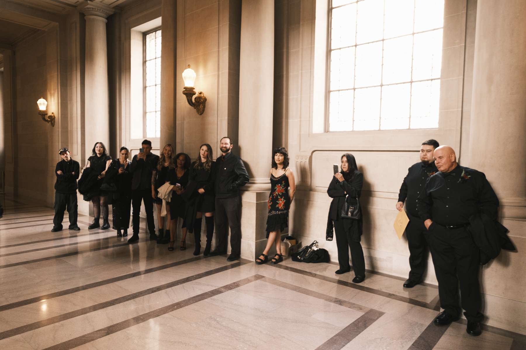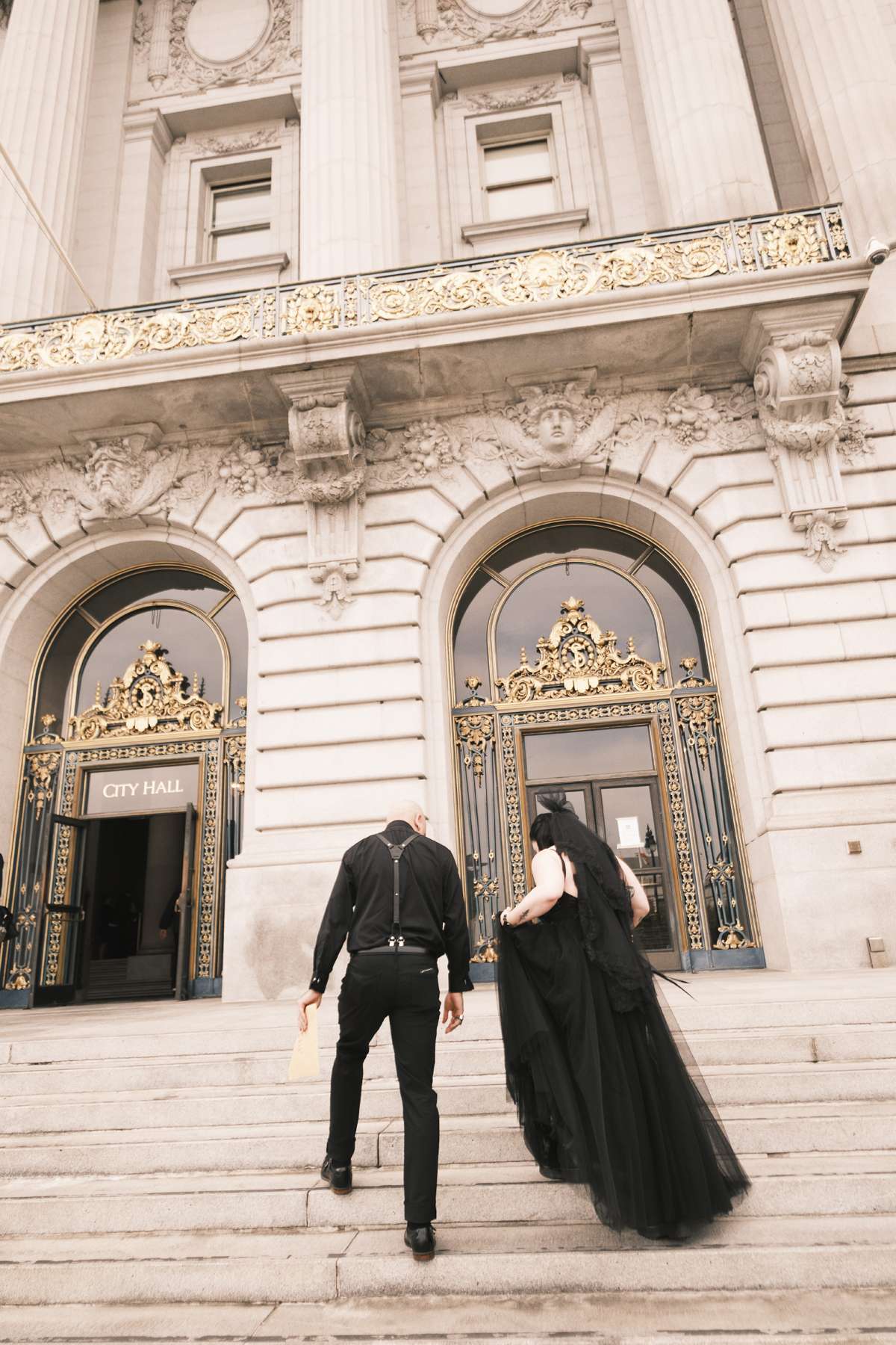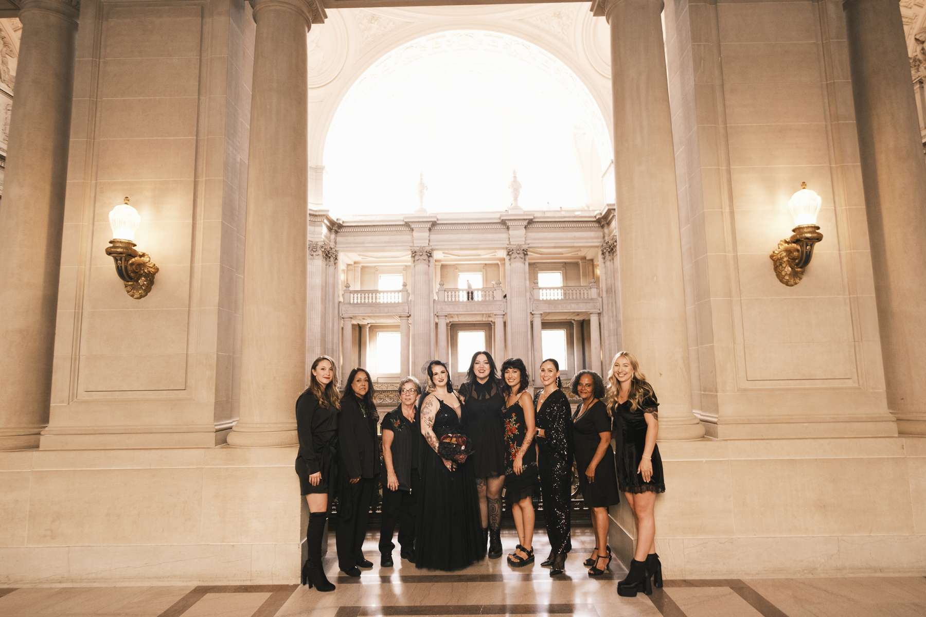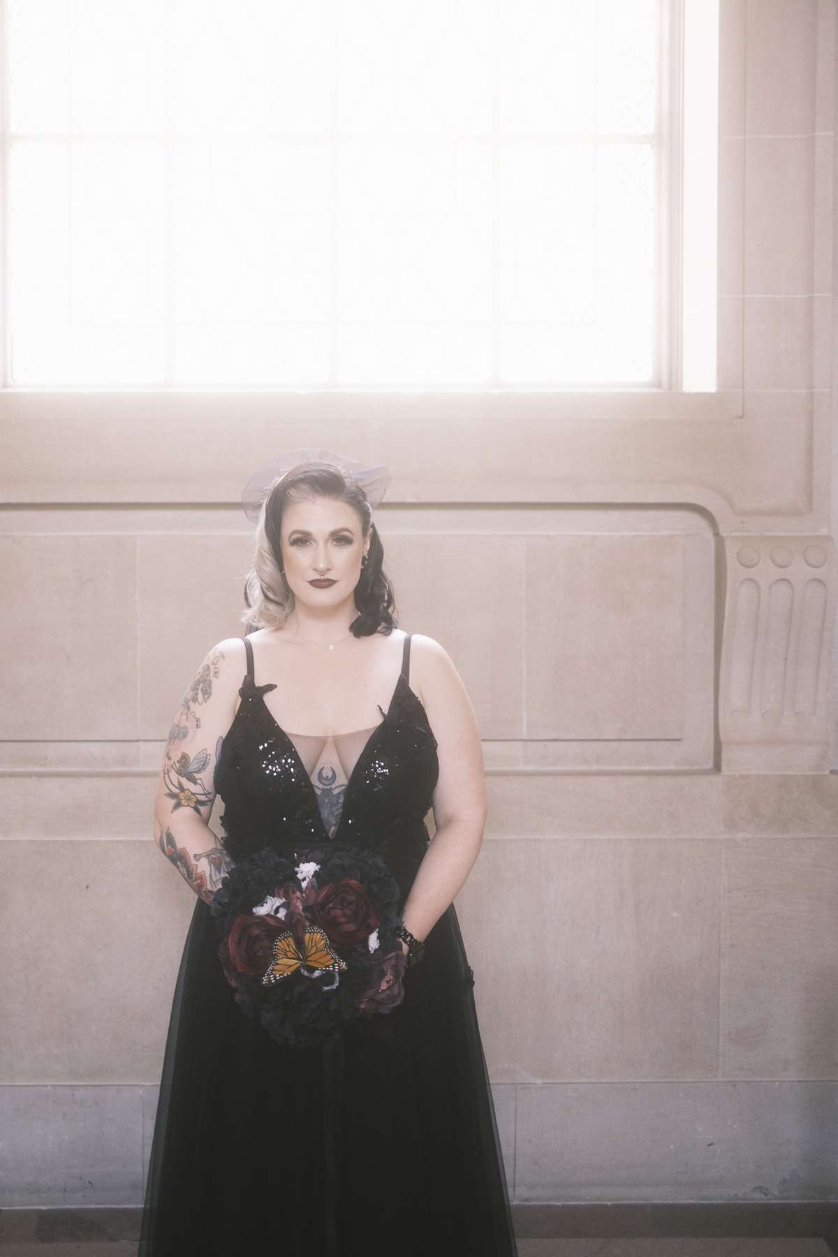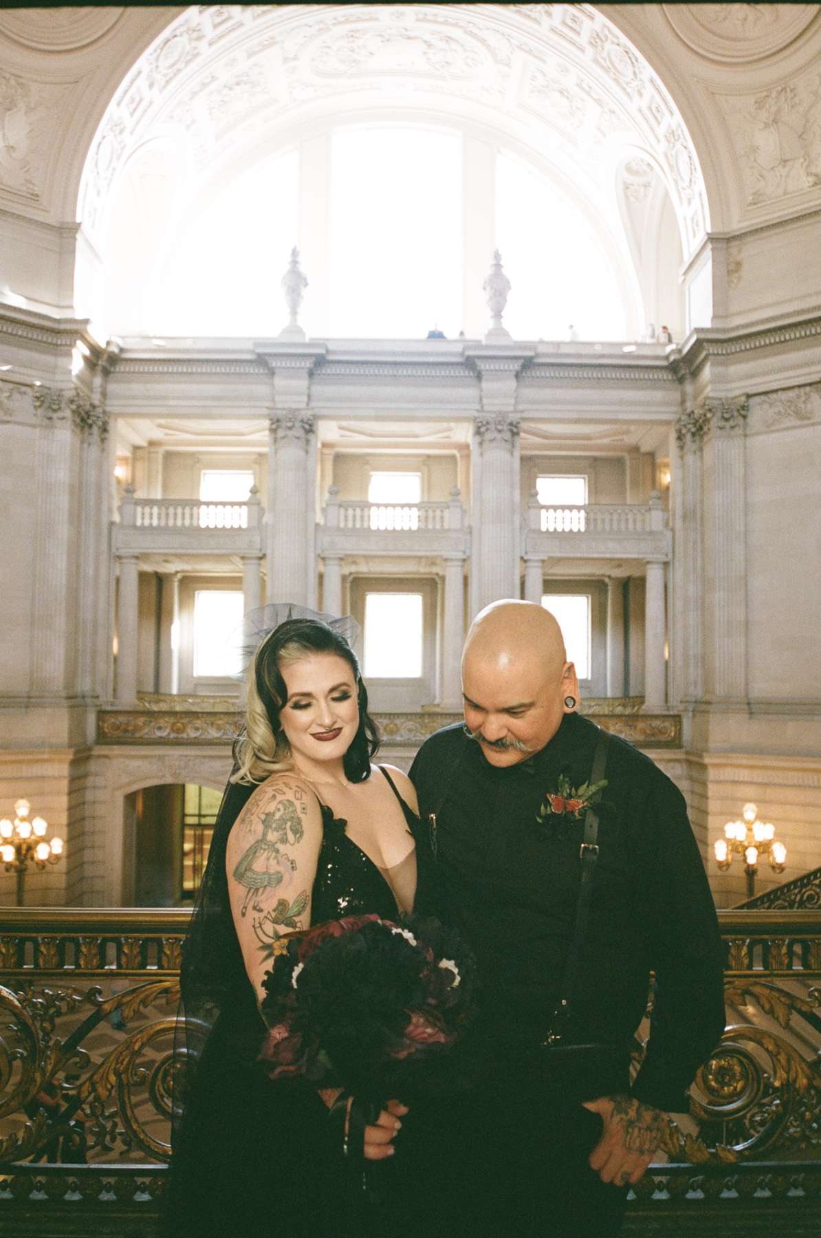 The couple chose San Francisco City Hall as their venue, a refreshing departure from the conventional church setting. It wasn’t without it’s challenges though as Meghan explains, “The biggest challenge of our wedding was the venue as we could only book it 90 days in advanced. This made it very difficult to lock down the date. We had been trying to get a Halloween wedding there since 2018 and we finally got lucky for Halloween 2022! The only problem was we then only had three months to plan everything!” Luckily, they had a general idea of the theme and who they wanted there.