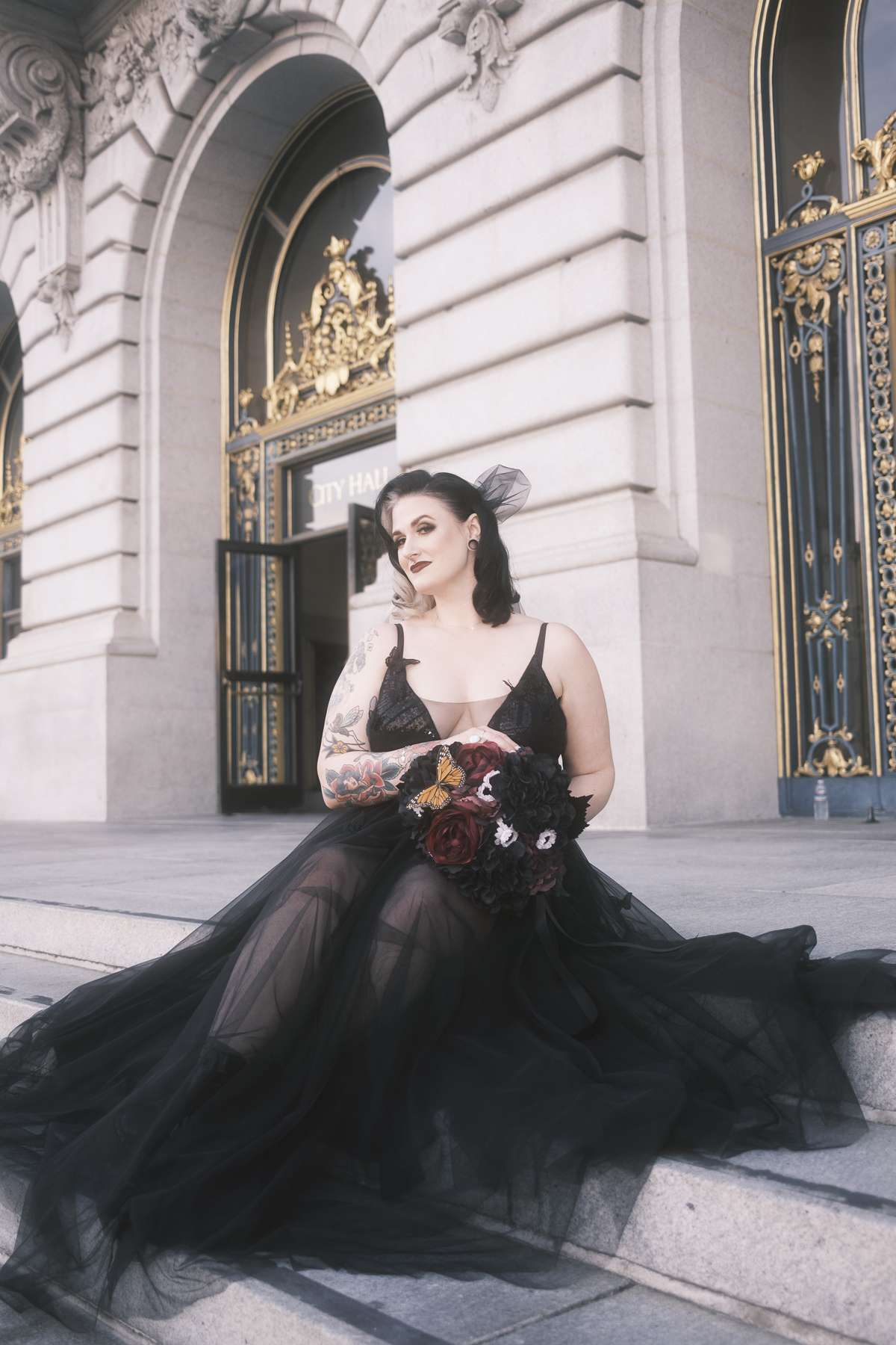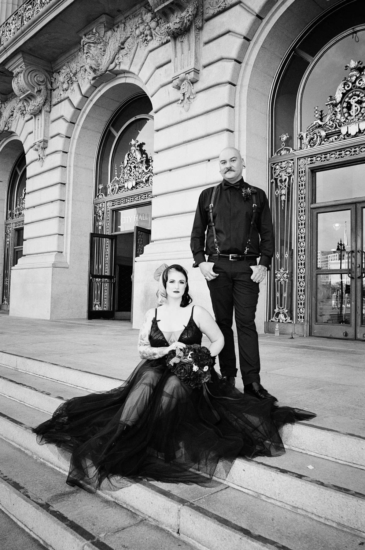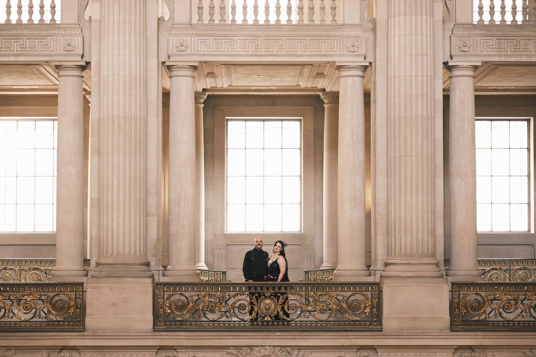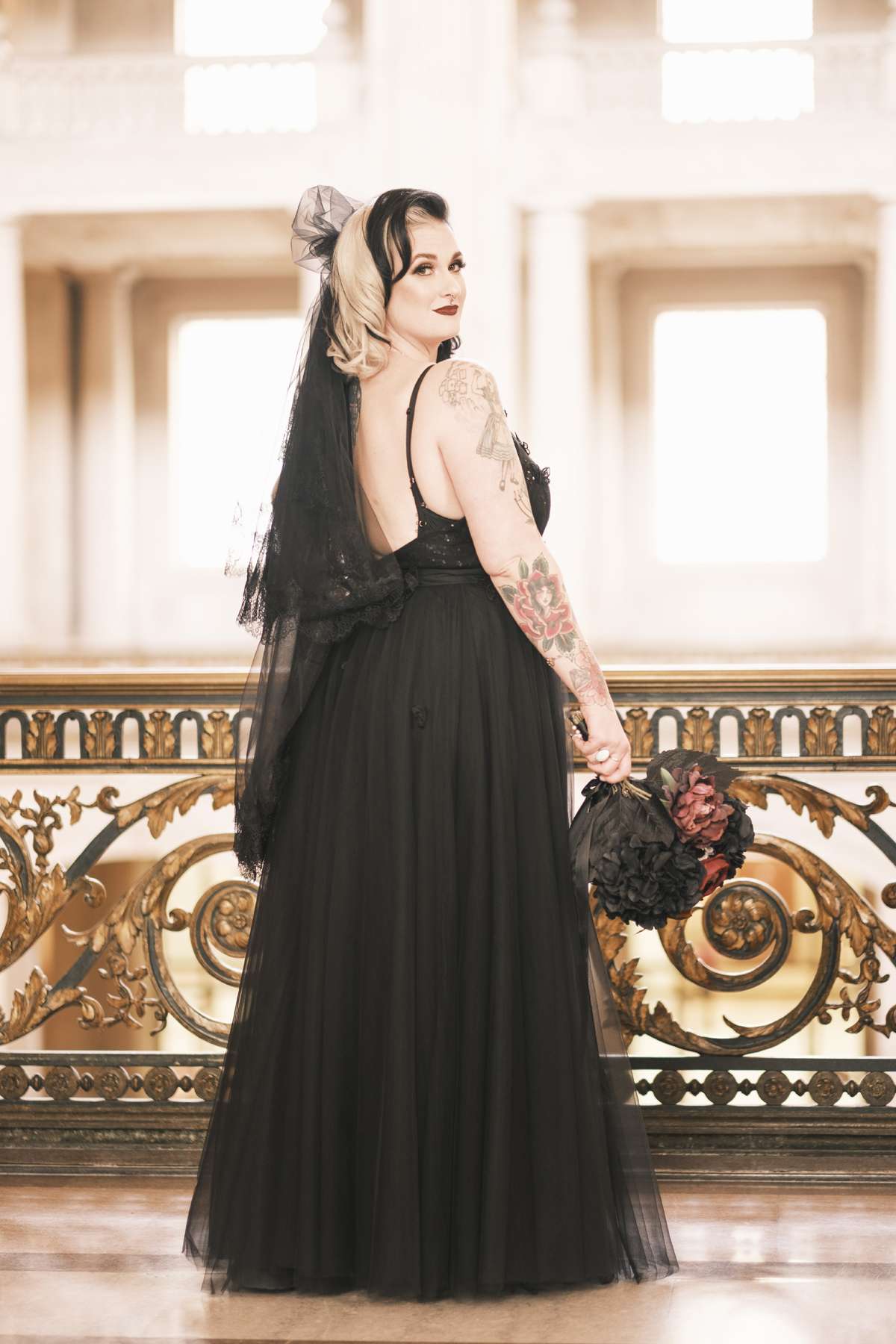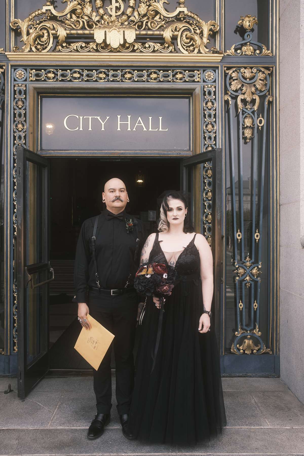 The couple chose San Francisco City Hall as their venue, a refreshing departure from the conventional church setting. It wasn’t without it’s challenges though as Meghan explains, “The biggest challenge of our wedding was the venue as we could only book it 90 days in advanced. This made it very difficult to lock down the date. We had been trying to get a Halloween wedding there since 2018 and we finally got lucky for Halloween 2022! The only problem was we then only had three months to plan everything!” Luckily, they had a general idea of the theme and who they wanted there.