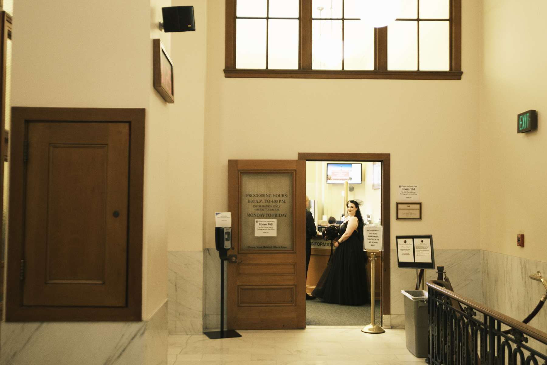 The ceremony itself was concise and official. However, the they still found it a really moving experience. “We waited for our number to be called for our appointment, got some fun photos in the hallways and made it the best of the government building vibes”, she explained. “We said our vows, which was raising our right hands and saying ‘Yes’ to the judge. She stamped our paperwork and gave her speech, and it was over in less than 10 minutes. Then we walked out of the office crying and our family was waiting for us in the main hall and we all embraced and started the celebration of our union. My father got a special Native American Star Quilt made and adorned it on us in a ceremony to unite us in front of our family and friends. This Native American ceremony was so special.”