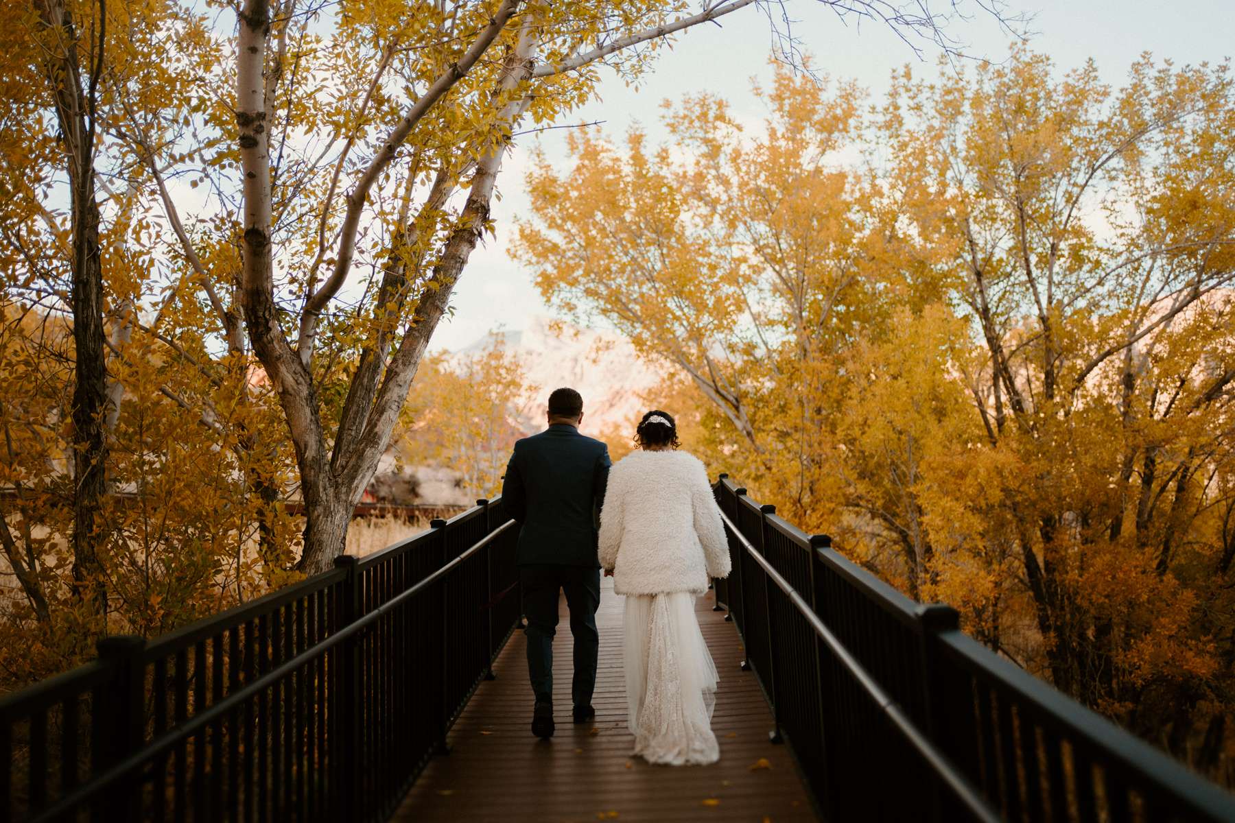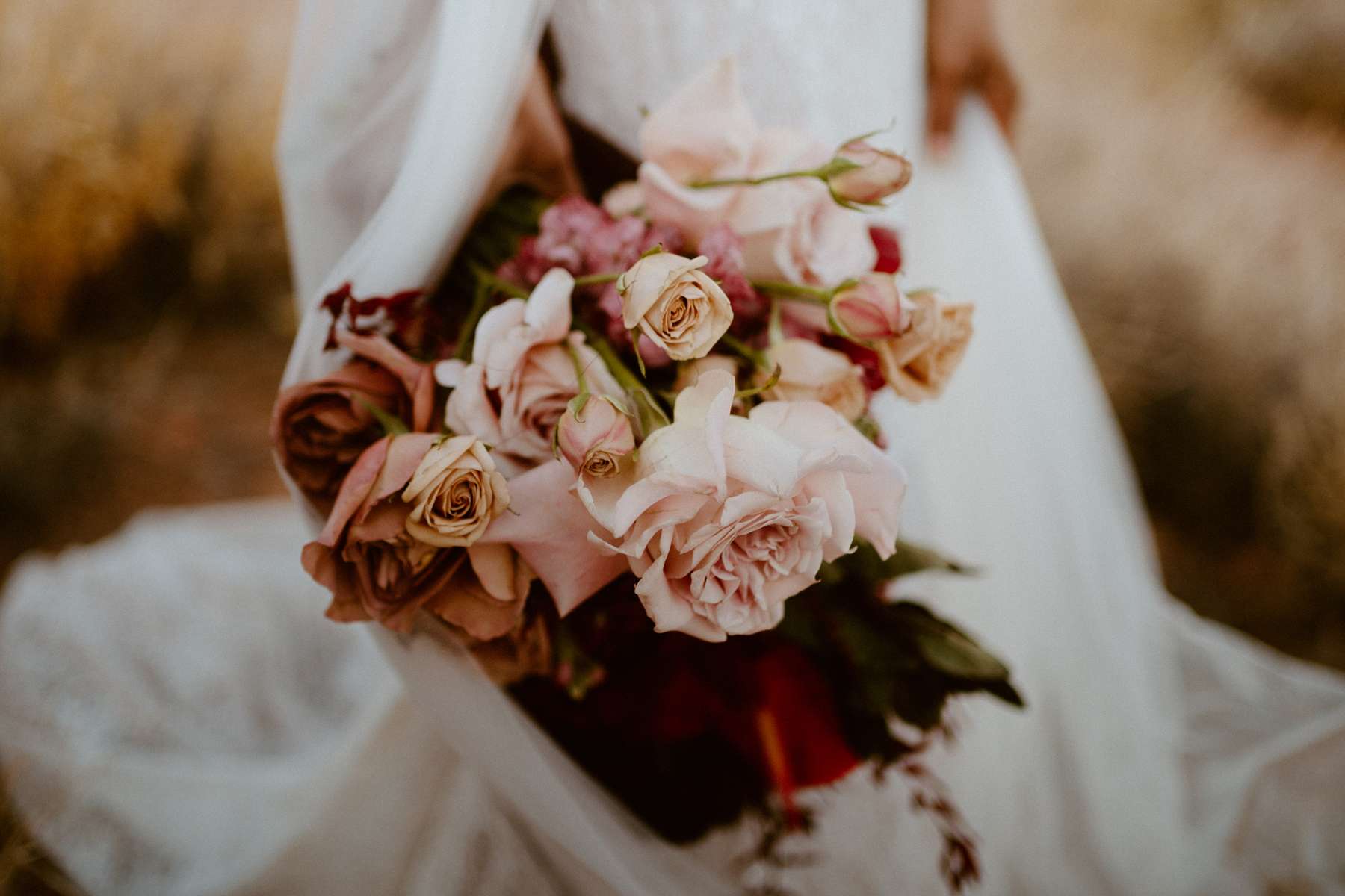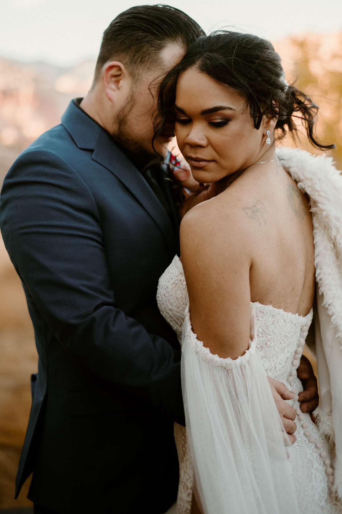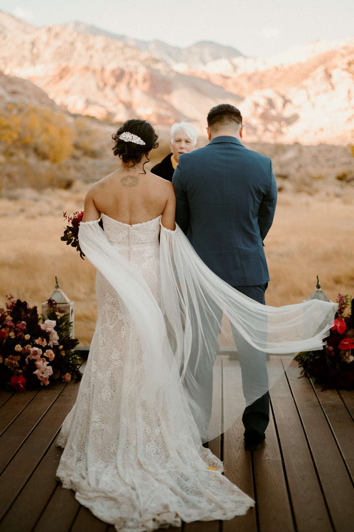Getting married in canyon was a pretty unique choice and although it didn’t come without a few stresses (like the wind!) their wedding planner, Ember and Stone Events, made the entire process smooth sailing. “It was a little chilly on the day of the wedding because of the wind”, the bride continued. “I didn’t know there would be such a temperature difference, but the wind made for amazing photos! I had a dress with veil sleeves and I wore my hair back in a messy bun. Otherwise, we had no challenges on the day, Nikki was the most amazing planner!”