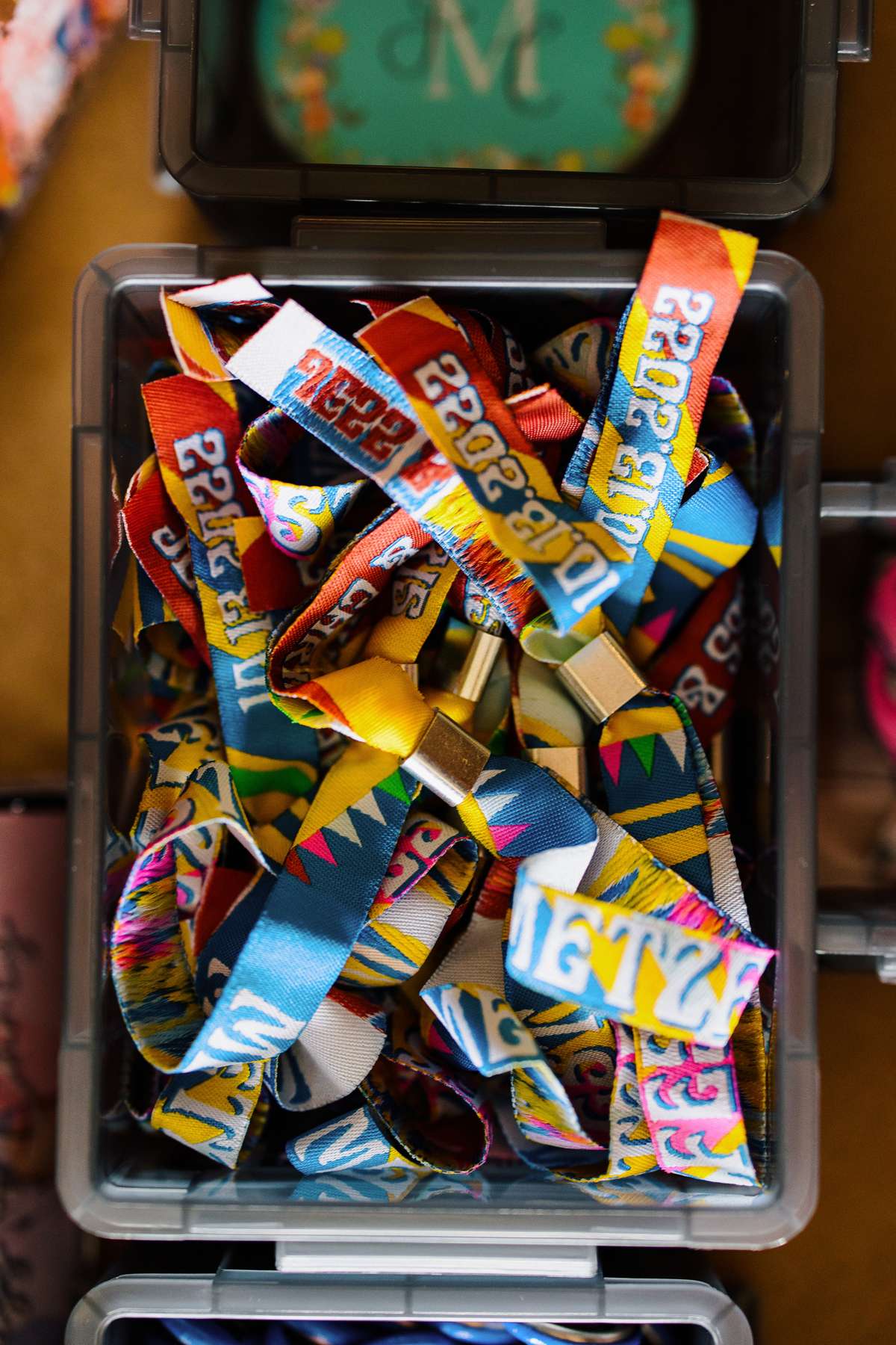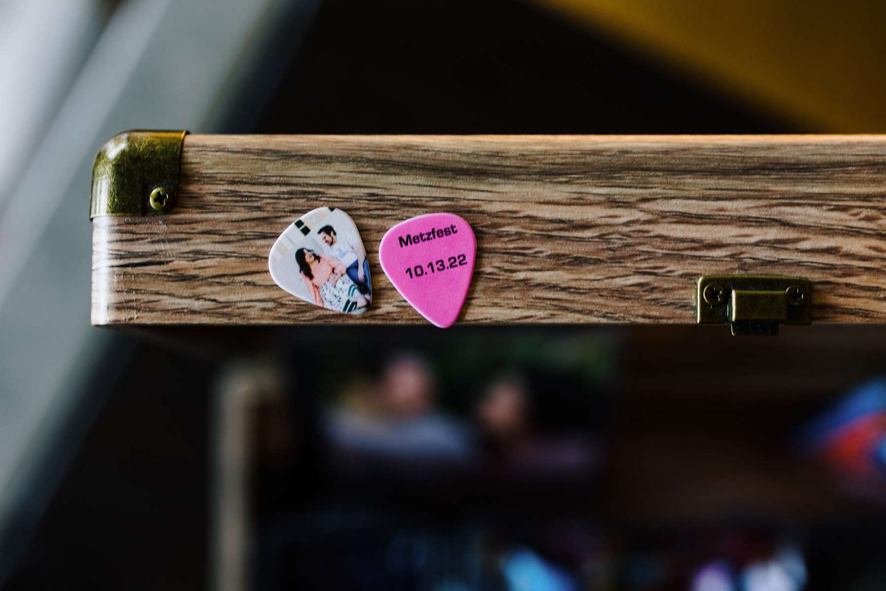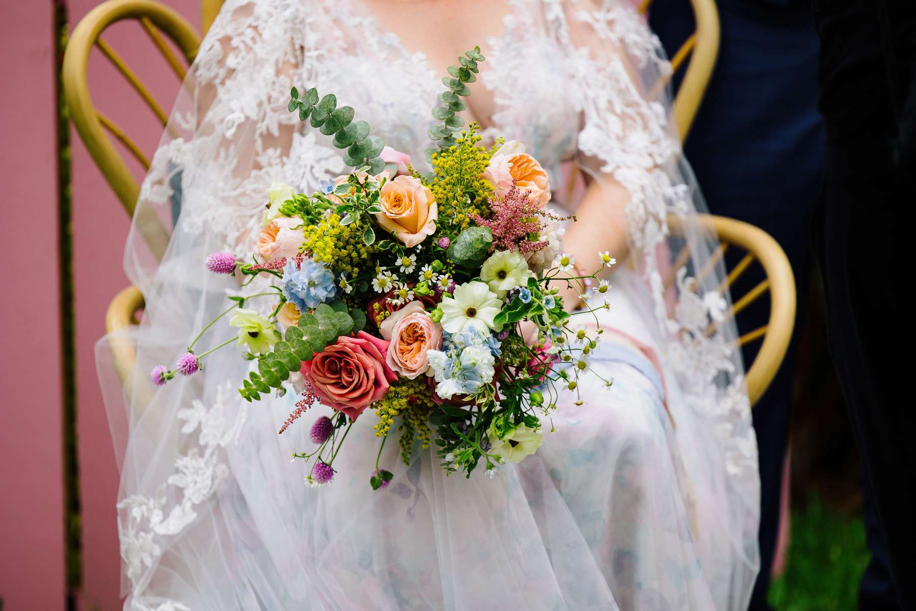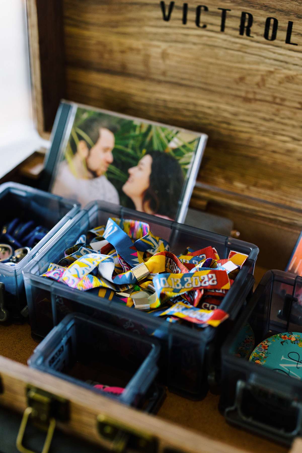 The couple drew inspiration from the vibrant music festivals of the 70s, infusing their wedding with a kaleidoscope of colours, music and various forms of art. Jess explained, “We really wanted the day to be all about music and art, channeling the spirit of Woodstock. We had a very guest centric wedding, so if it wasn’t going to be fun for guests, we didn’t do it. We had a cotton candy maker so our guests could have a snack pre-ceremony, and a live sketch artist who drew people while they danced. Our welcome party was just a showing of Back to the Future that we booked out at the movie theatre.”