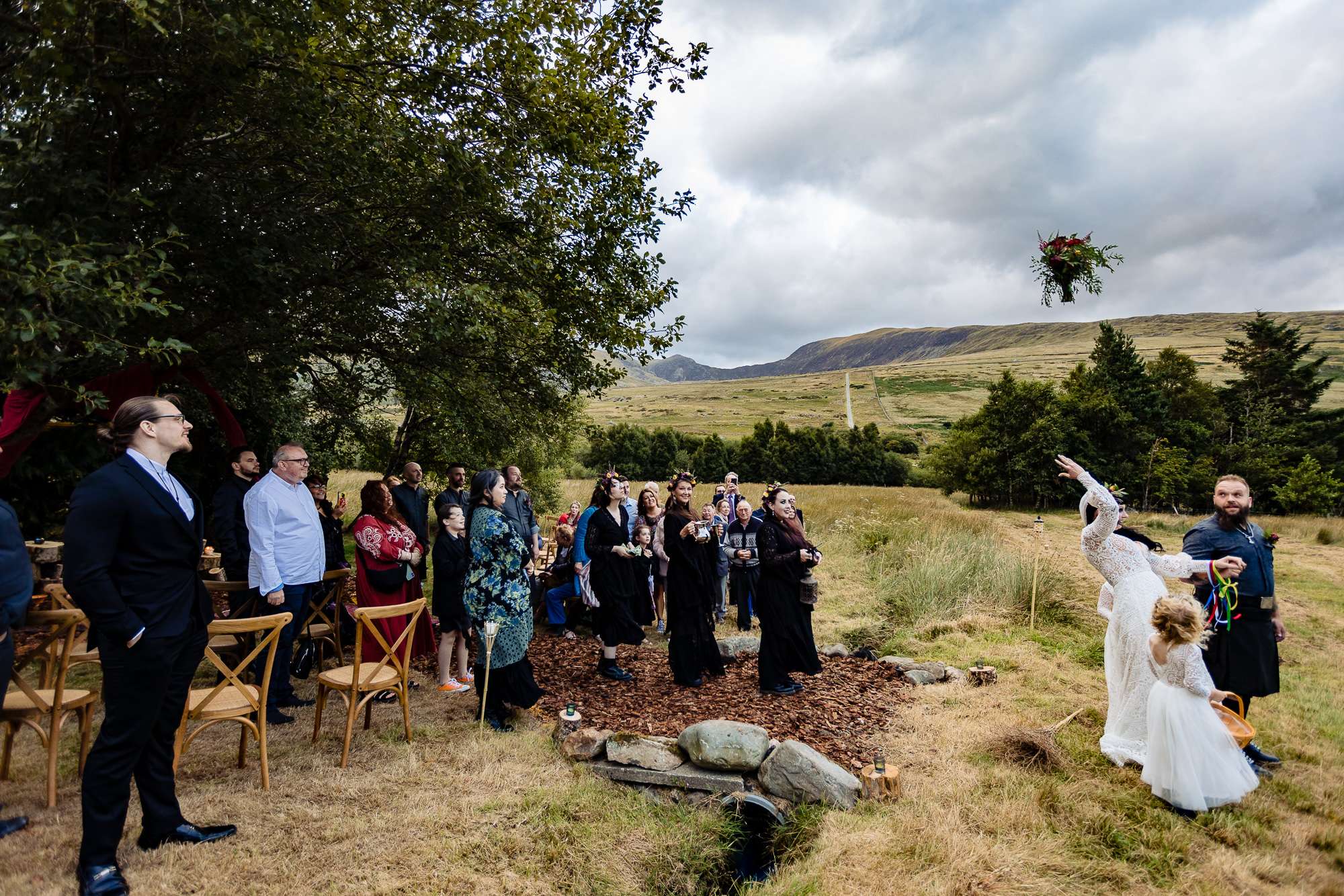 The ceremony itself was a blend of ethereal beauty and symbolic rituals. Accompanied by a harpist, they recited poetry during their vows and had a Druidic handfasting. They lit candles in remembrance of loved ones, shared bread and mead and ended by jumping the broom. “The wind seems to pick up after certain blessings were given by the officiant”, Hannah said. “it was like the mountains were blessing and acknowledging the ceremony.”