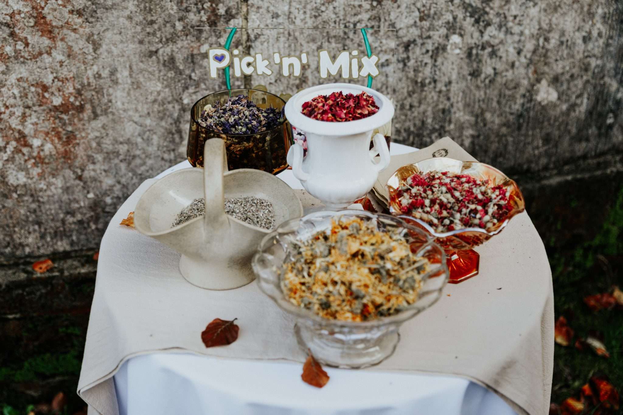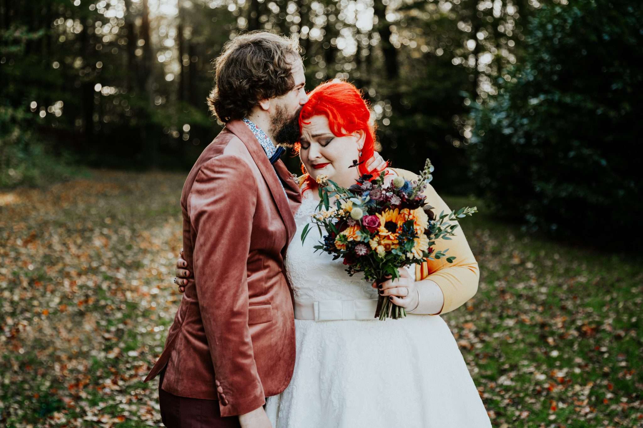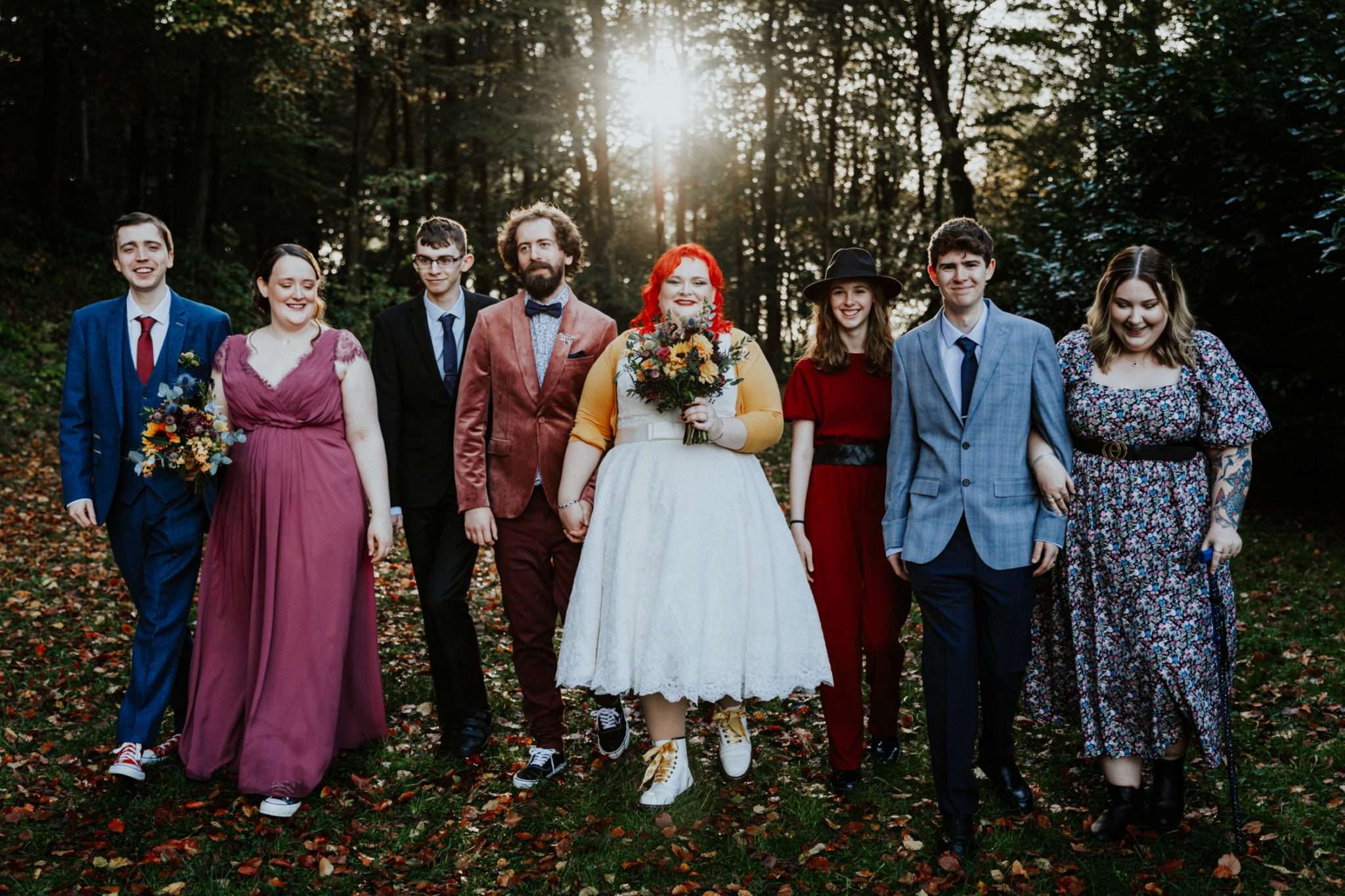 Describing their wedding theme as “eco-conscious, eclectic and us,” this pair had a clear vision for their October celebration. “It was important to us that we were mindful of the impact of our day,” Beth explains. “We wanted to try and use second-hand where possible, things that we knew we could reuse or recycle very easily. My dress was secondhand from stillwhite.com and the bridesmaids’ dresses and groomsmen’s suits were from Depop. My shoes were from Vinted and we picked venues and vendors who had the same principles as us.”