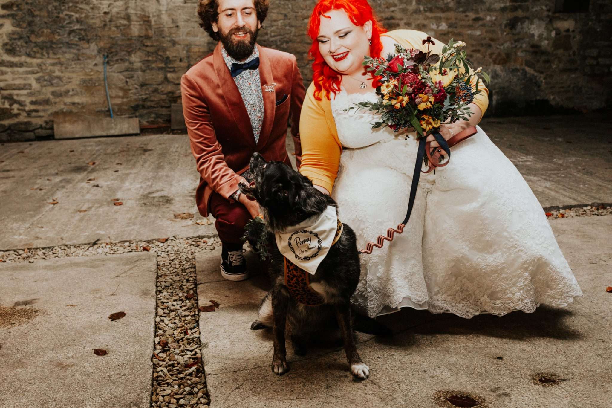 After the ceremony, the celebration continued at the Silk Mill Gallery in Frome, an art gallery that provided a blank canvas for the couple to craft their dream party. They did lots of DIY, from the stationery and wedding favours (propagated plants from their own garden) to decorations and upcycled chairs. Even their dog, Penny, received a special touch with a custom-made bandana.