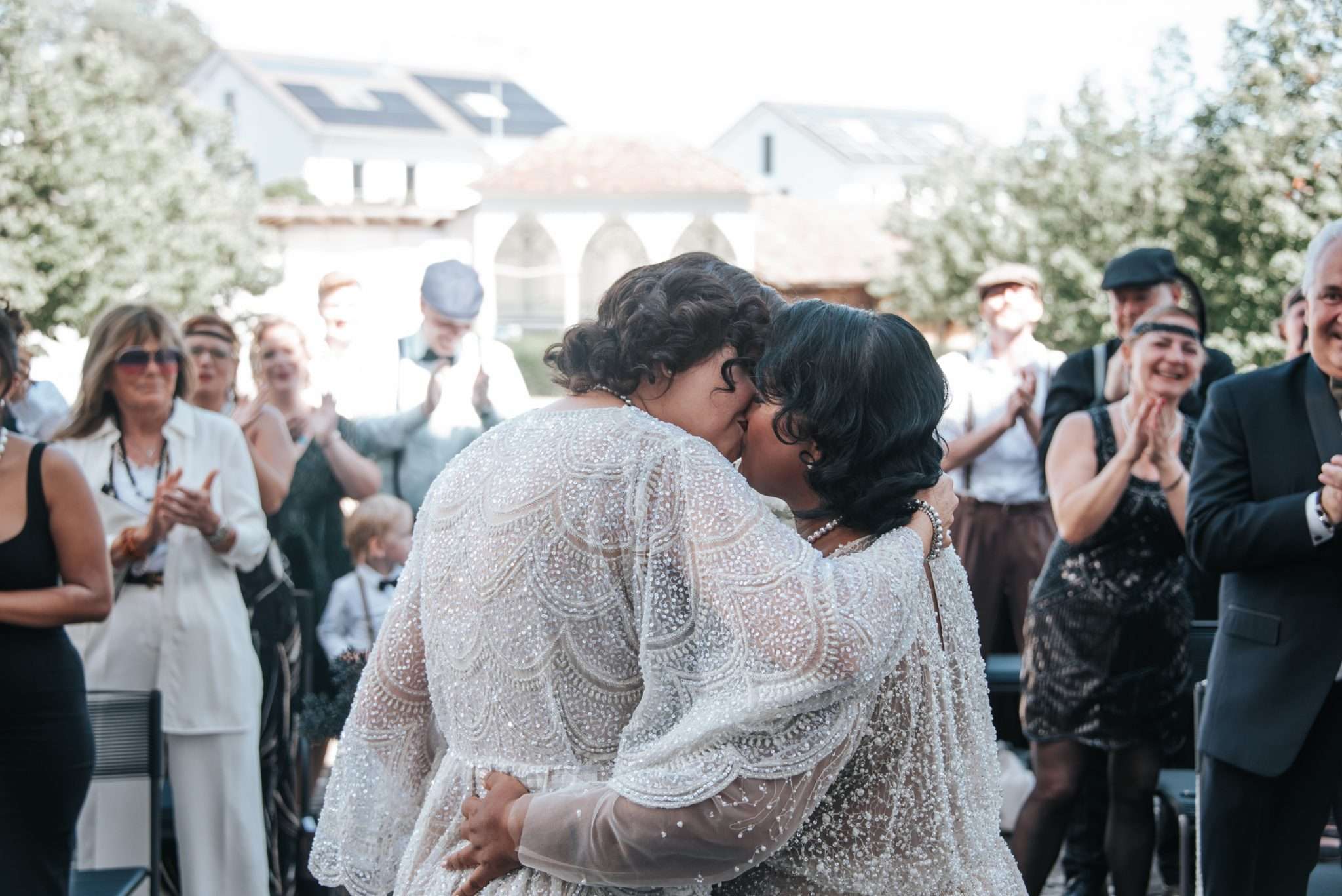 When Christa and Corinne decided to get married, they knew they wanted a wedding that felt like a grand celebration with a glamorous feel. The golden age of the roaring 20s felt like the perfect theme and they went full Gatsby, even asking their guests to dress up.