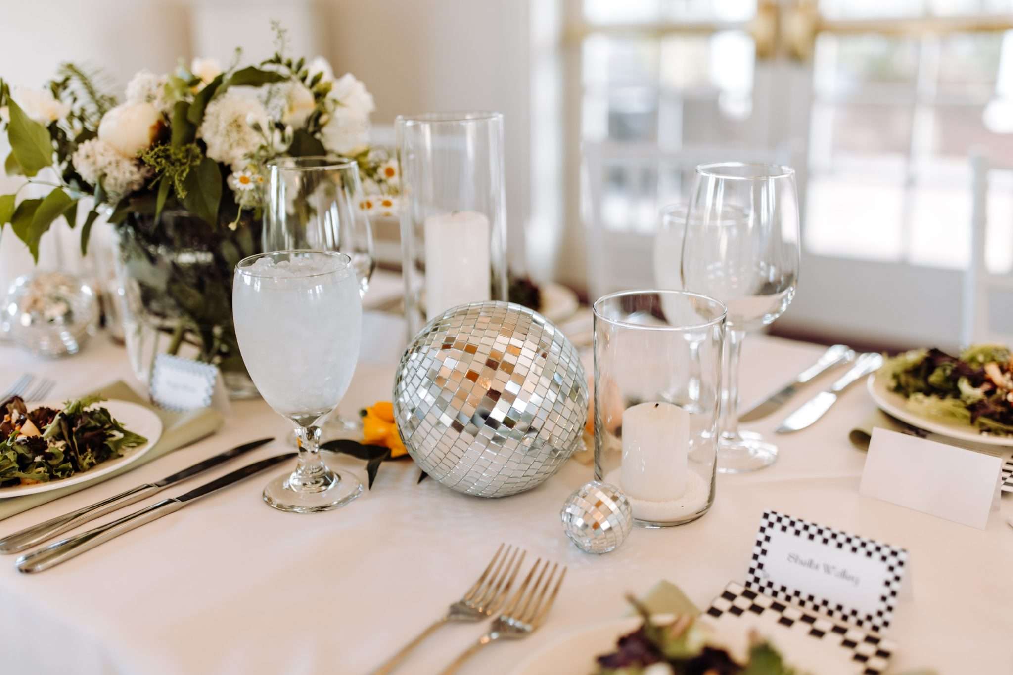 Hannah and Paul might just have some of the most creative and adorable details in their wedding that we’ve ever seen! The hanging floral disco ball display? Gorgeous! The wedding party in all-the-colours-of-the-rainbow outfits carrying glass ‘bags’ of flowers instead of bouquets? Genius!