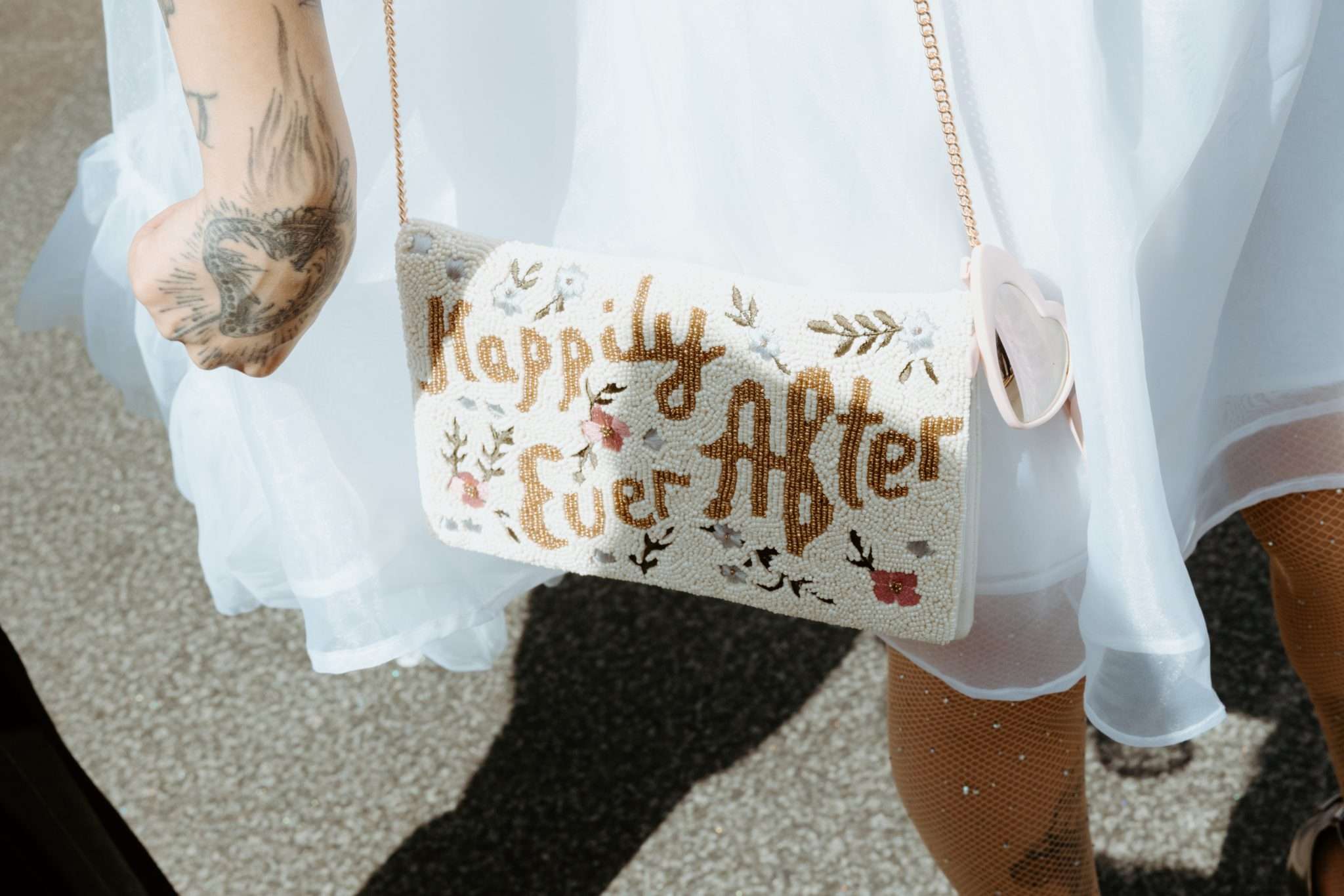 “Hellvis played a big part in making our ceremony feel extra special”, Mariela shared. “We couldn’t recommend him enough! He had such a unique take as an officiant. It made the day feel really personal.” The ceremony included them swearing on the ‘unholy bible’ that was filled with jellybeans! Afterwards, they we went to Downtown Tattoos, located right next door, to get matching dice tattoos bu artist Linnea.