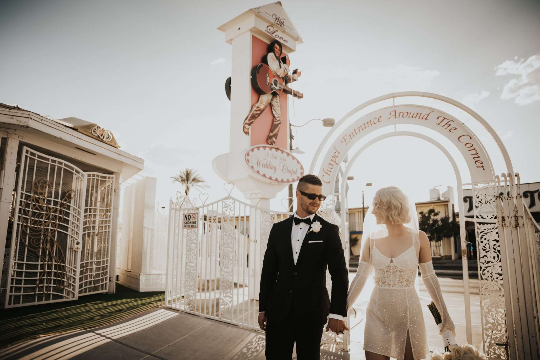 Their ceremony at A Little White Chapel was classic Vegas, with Elvis as their celebrant. “Elvis walked me down the aisle singing Can’t Help Falling in Love, which is one of our favourite songs,” Miki continued. “Then, after we said our vows, he serenaded us with Viva Las Vegas. It was surreal. We wanted it to be fun and relaxed, with no pressure, and that’s exactly what it was.”