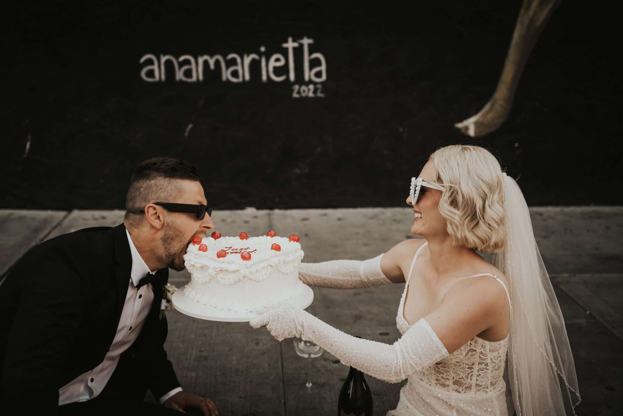As they reflect on their day, Jake and Miki say they wouldn’t change a thing. “The best part was mainly the fact that no one knew we were going to get married while in Vegas,” the bride concluded. “We decided to only tell our immediate family, so it was fun planning it but also keeping it a secret from everyone. The ceremony was so much fun and our photos were fun to capture—walking down the street drinking champagne and eating cake on the curb. It felt like a movie. Strangers were walking past congratulating us. We really were just living in the moment.”