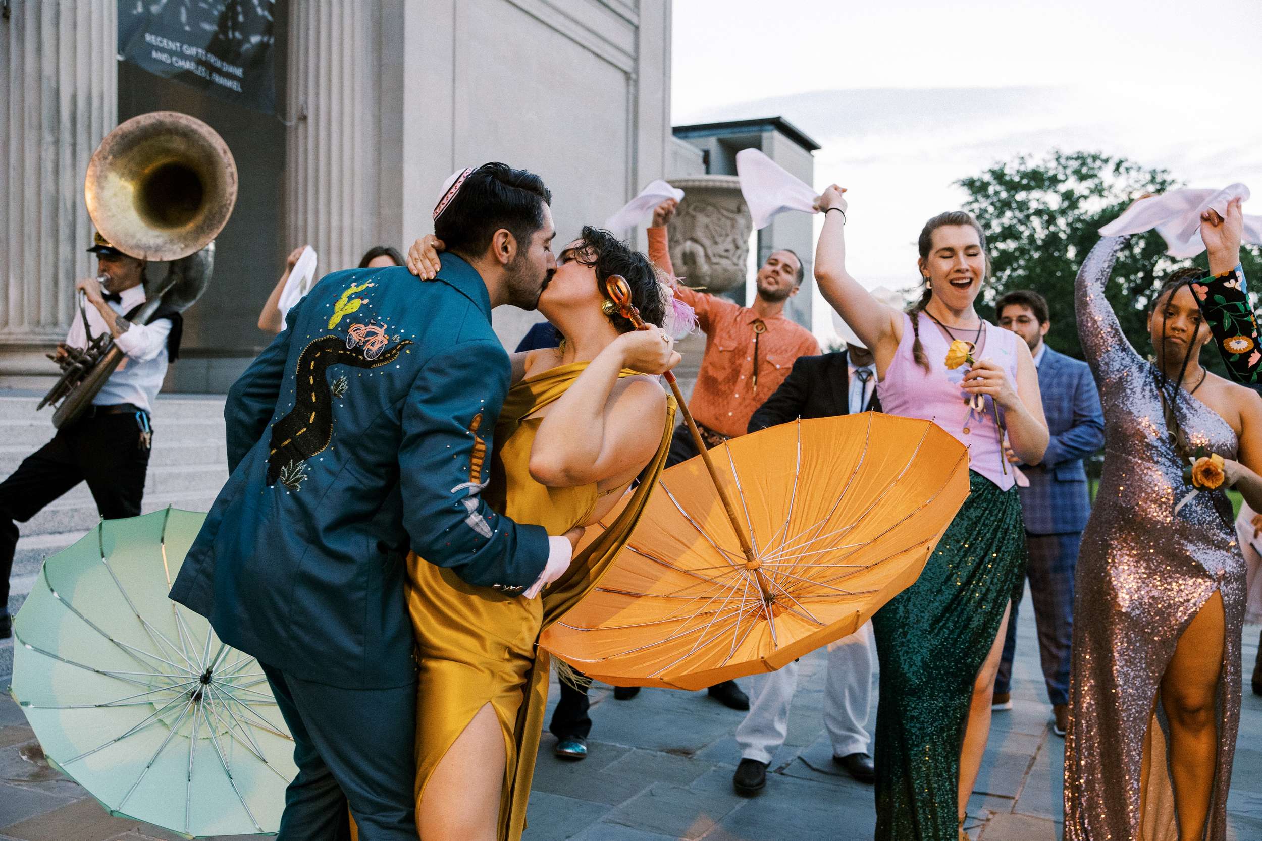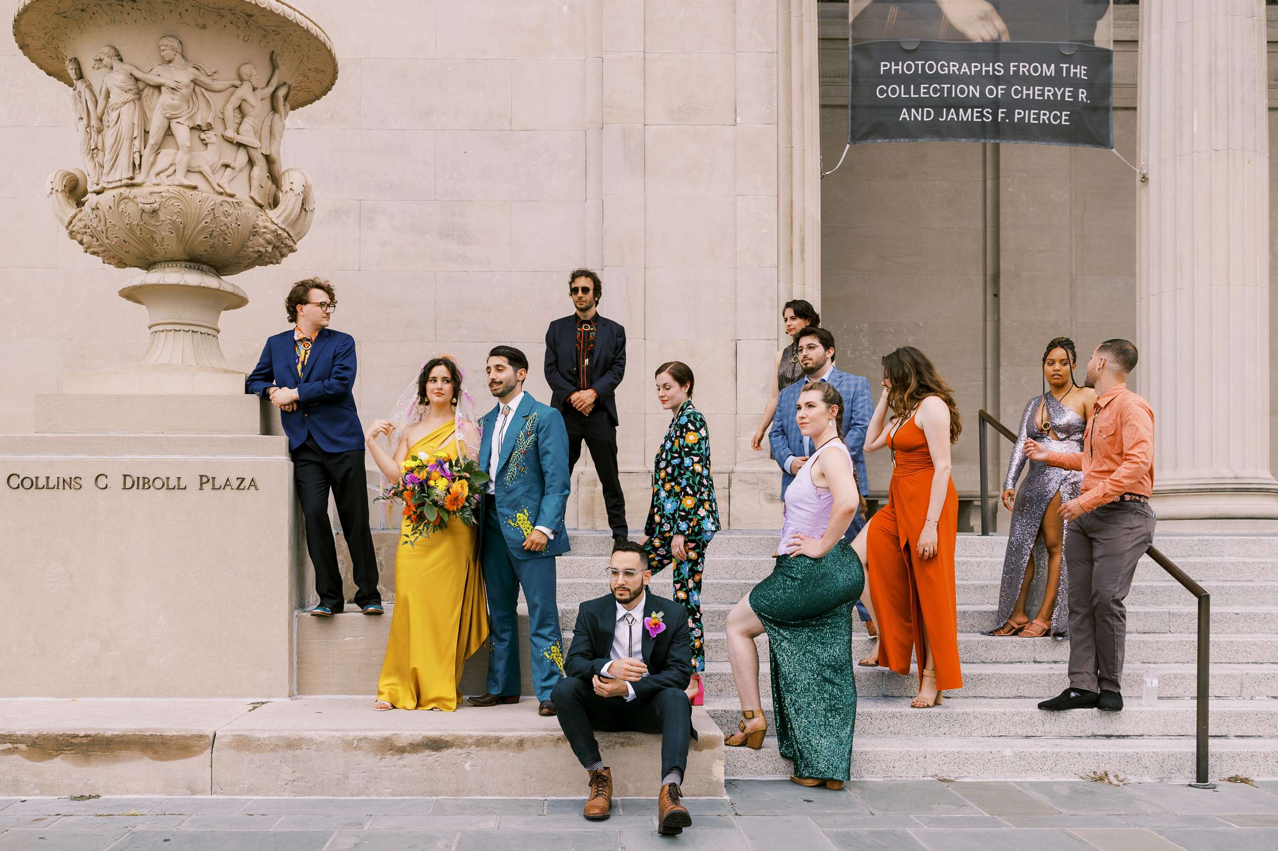 “Alex and the wedding party walked out to an instrumental version of Lovely Day and I arrived to an instrumental version of As Time Goes By from Casablanca“, Emma told us. “Alex and I both wrote our own vows, making intentional promises to each other (a Quaker tradition), while reverend Melanie created a custom blended Unitarian and Jewish service for us. Our reading was a excerpt from the Frog and Toad are Friends story Alone. At the end of the ceremony, we had a Second Line which was a surprise our guests. We strutted through the sculpture garden and had a dance party on the steps of the museum where we would have our reception. We even had locals spontaneously joining in!”