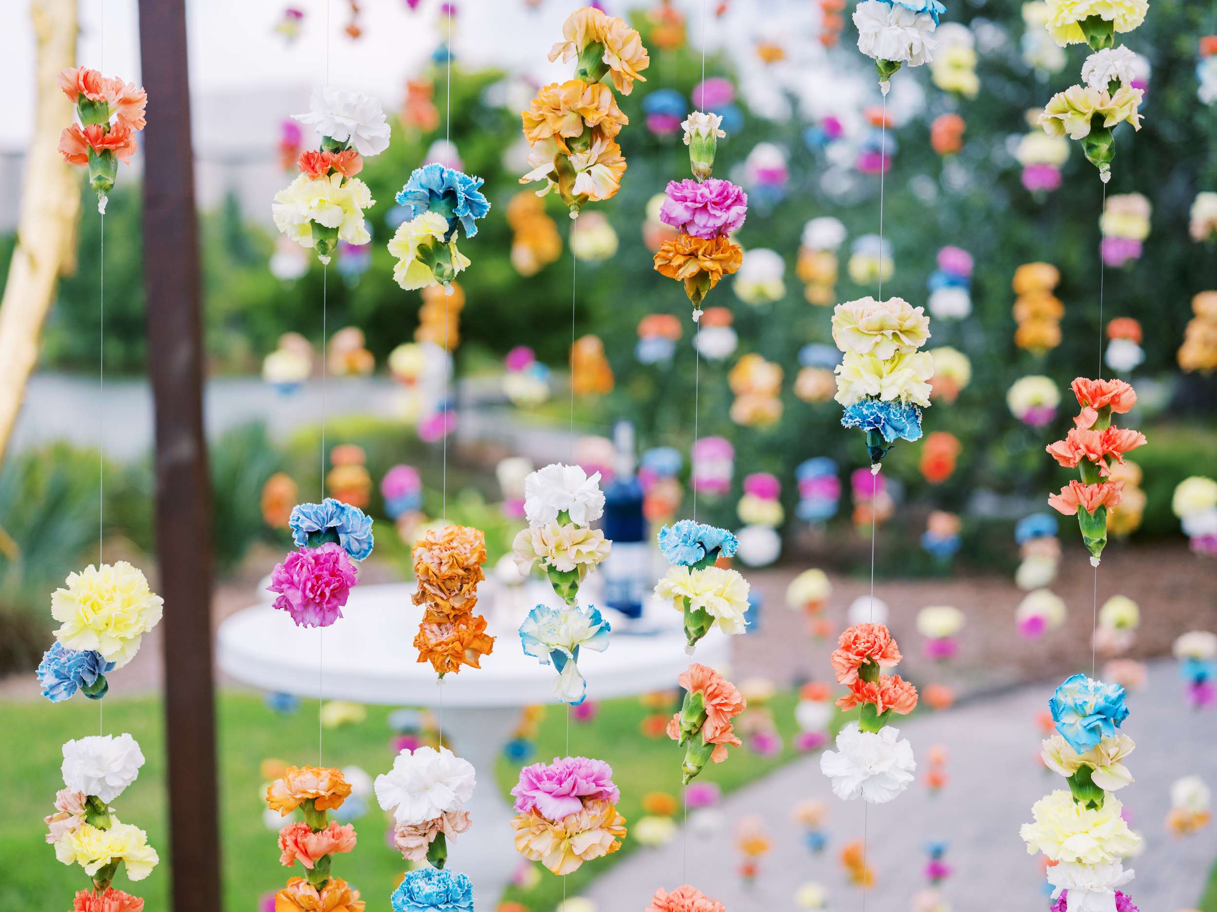 The ceremony was held in front of their favorite sculpture, The Sun, chosen for its symbolism of brightness and guidance. A custom-designed chuppah adorned with carnations in their wedding colours was the focal point, blending their Jewish and Unitarian traditions.