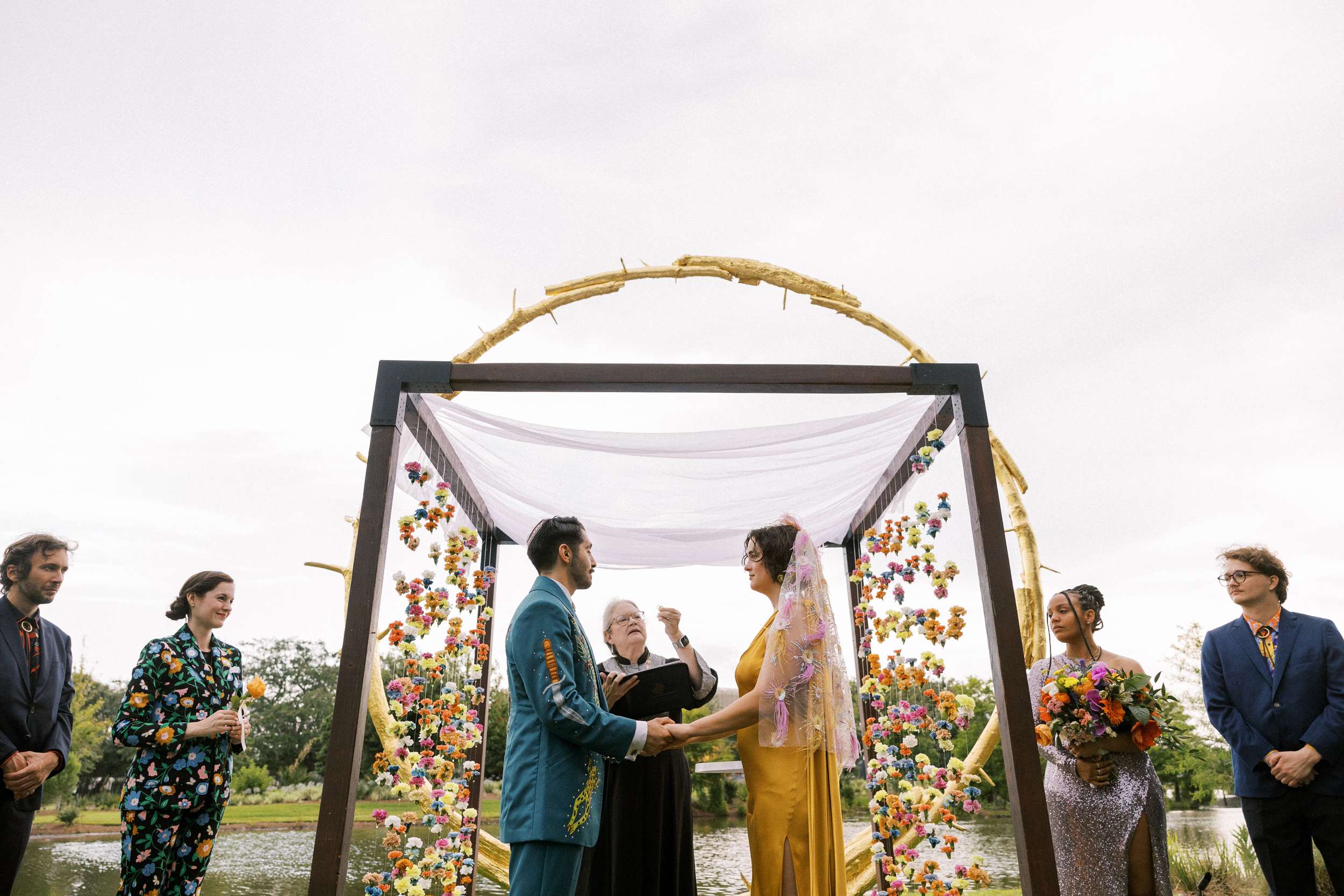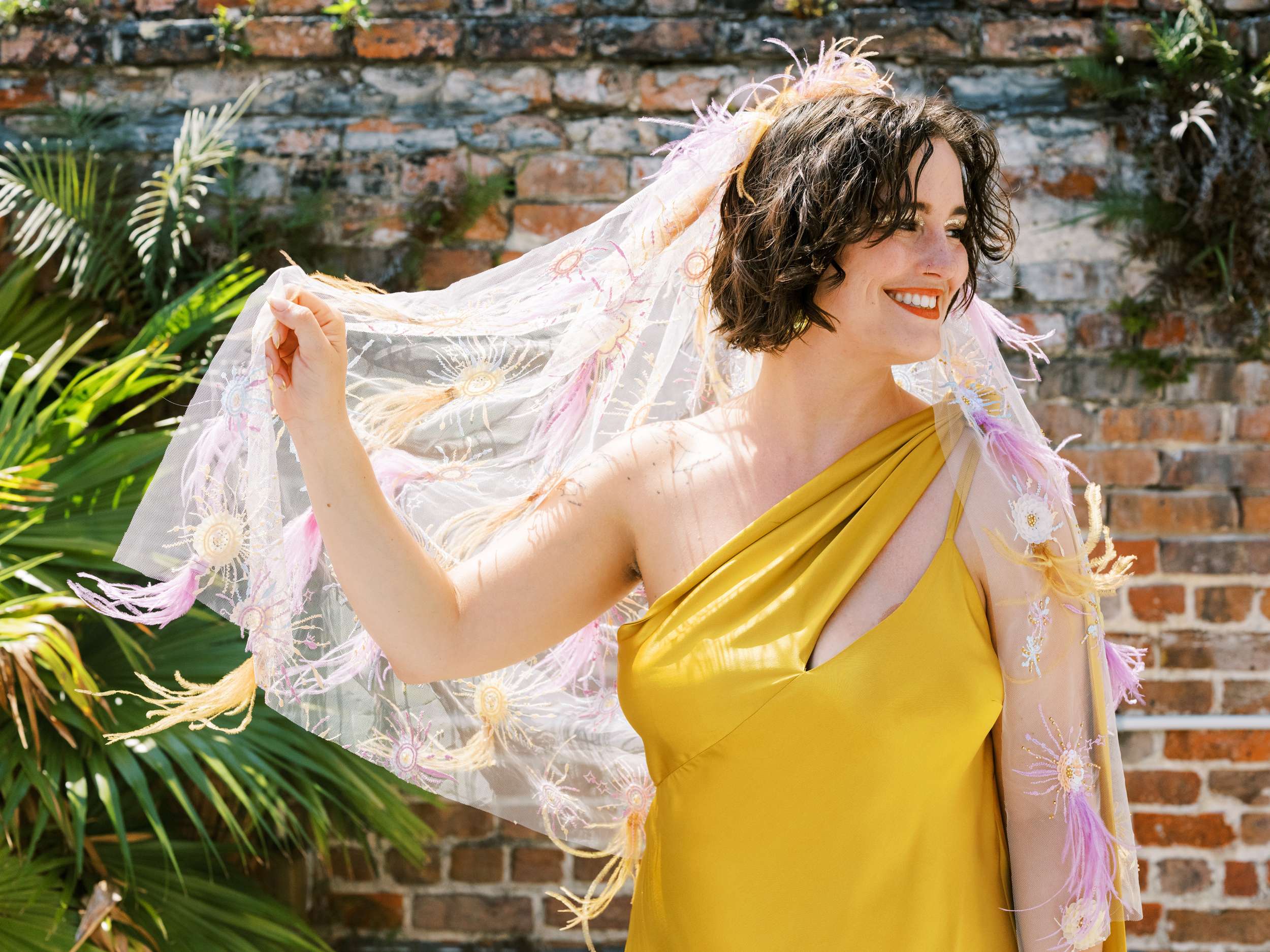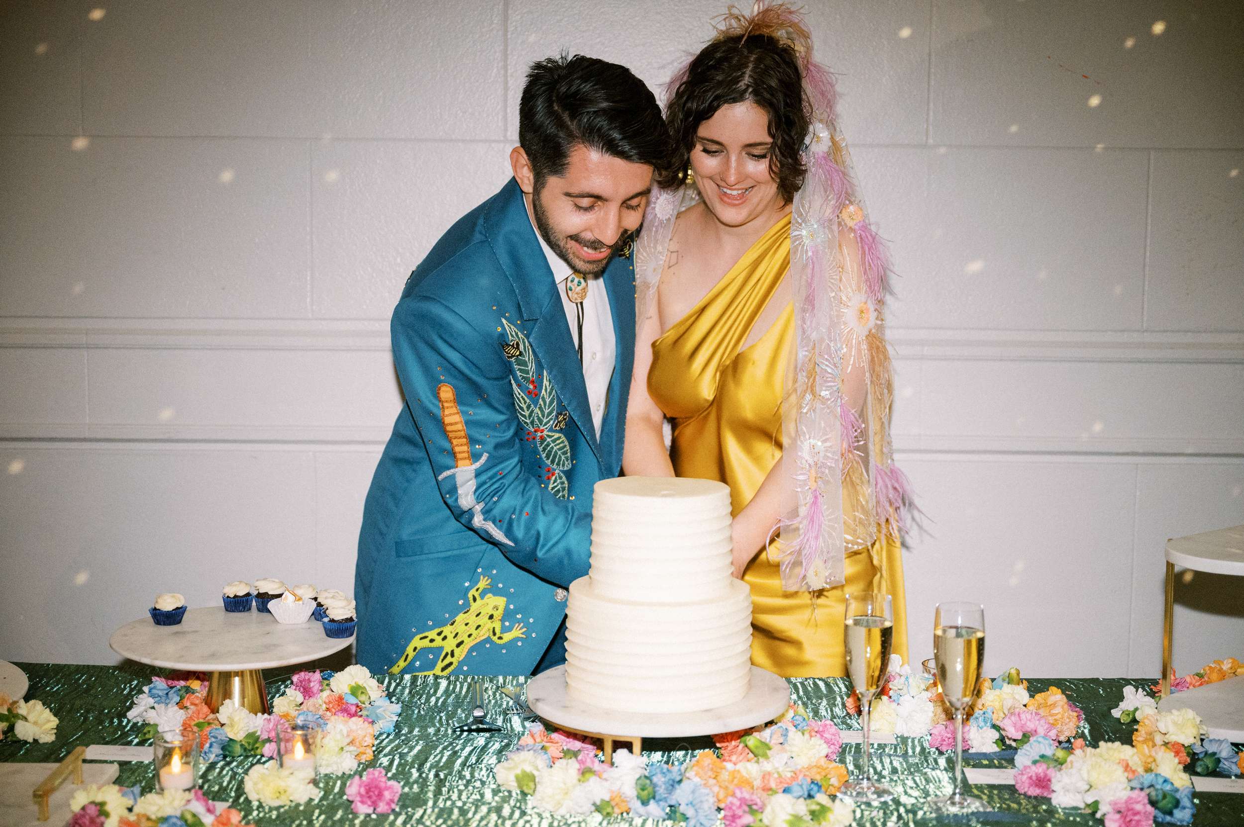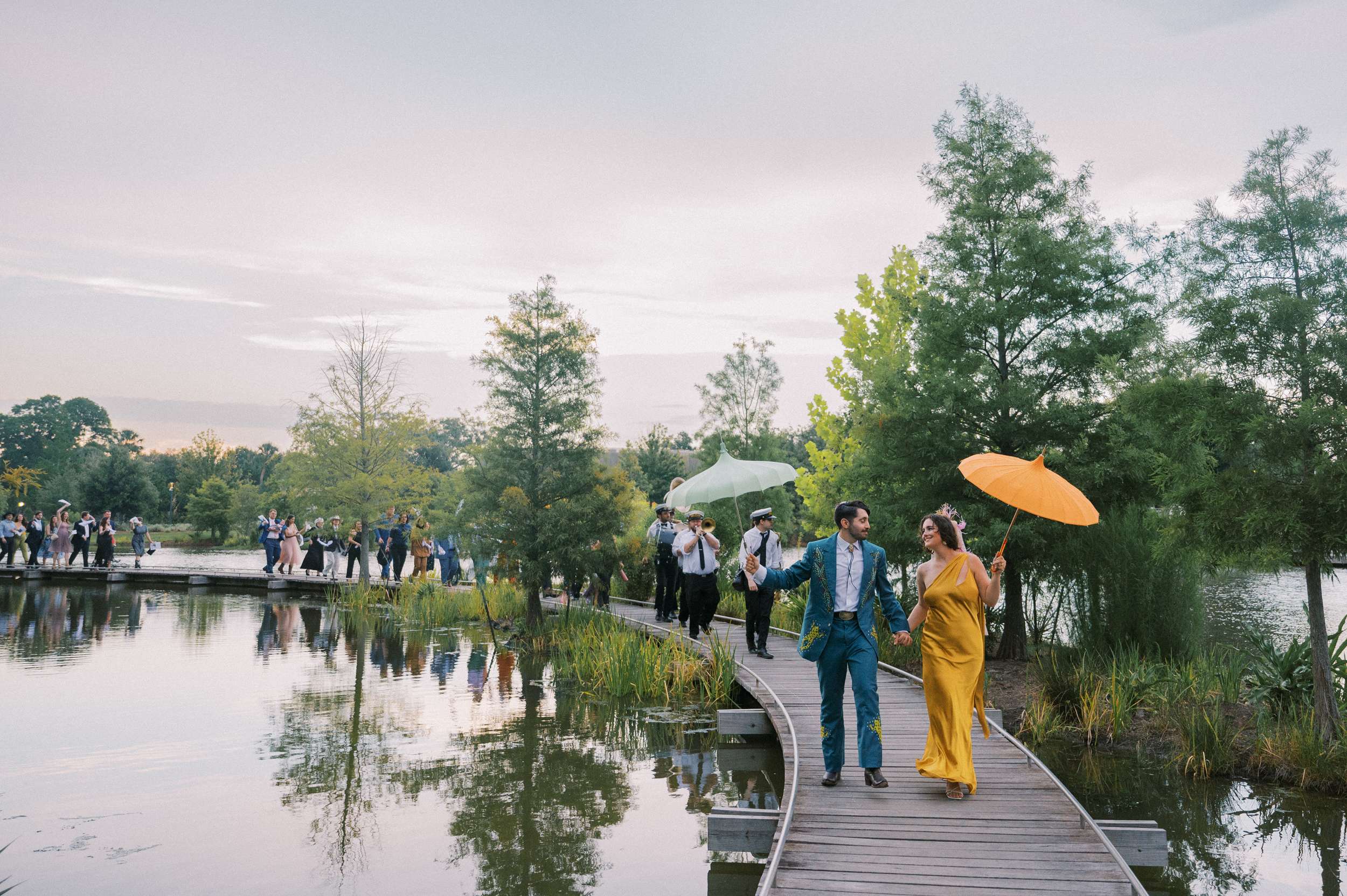 Emma and Alex’s summer wedding was held at the New Orleans Museum of Art, with the ceremony outside in the sculpture garden. The bride opted to wear yellow, with the groom in statement suit with custom appliques and a bolo tie hand-carved for him by his grandfather. Their theme, a blend of disco and classic country influences, was inspired by the venue’s colourful surroundings as well as their desire to have a wedding which was true to them rather than following trends.