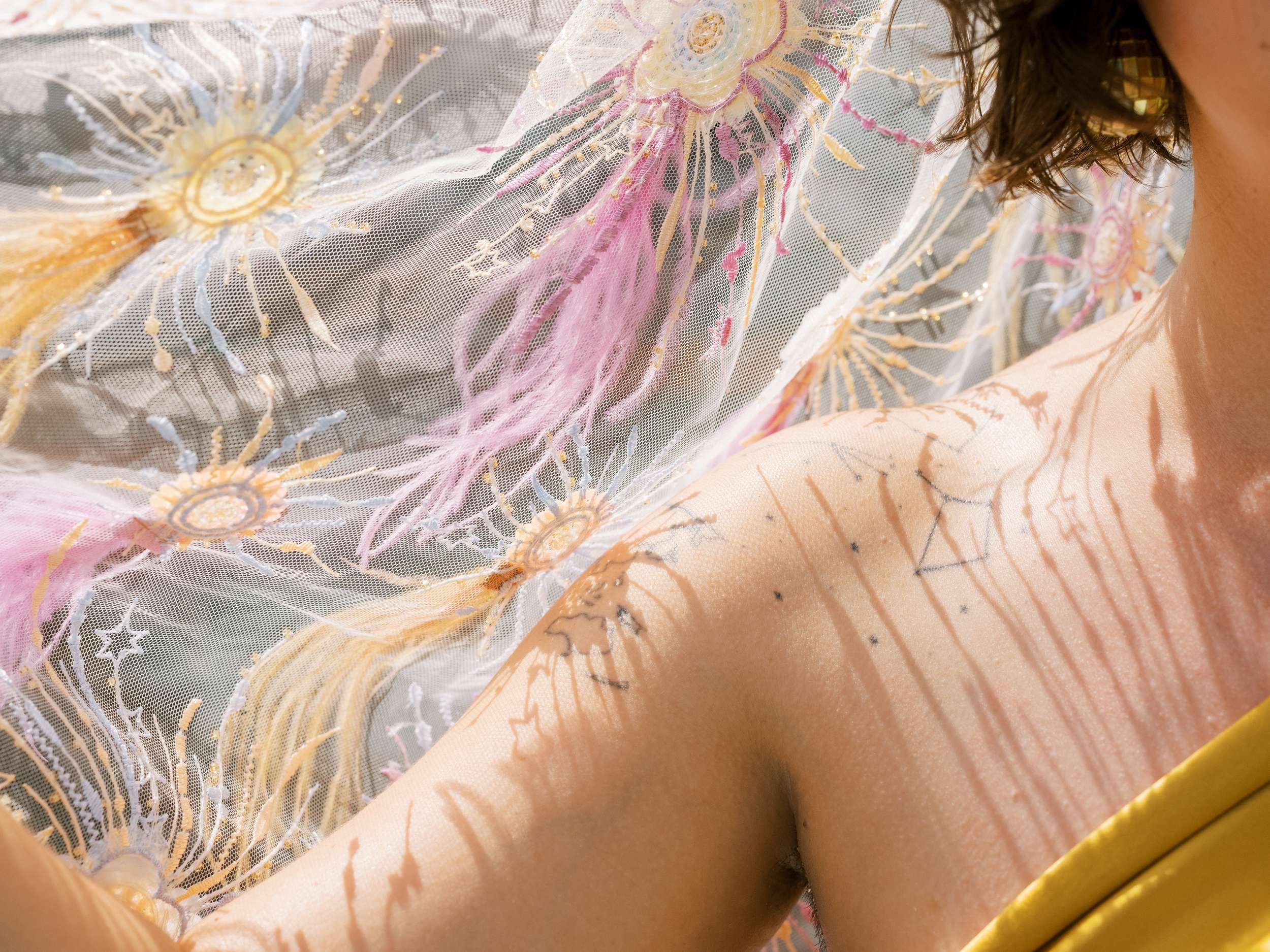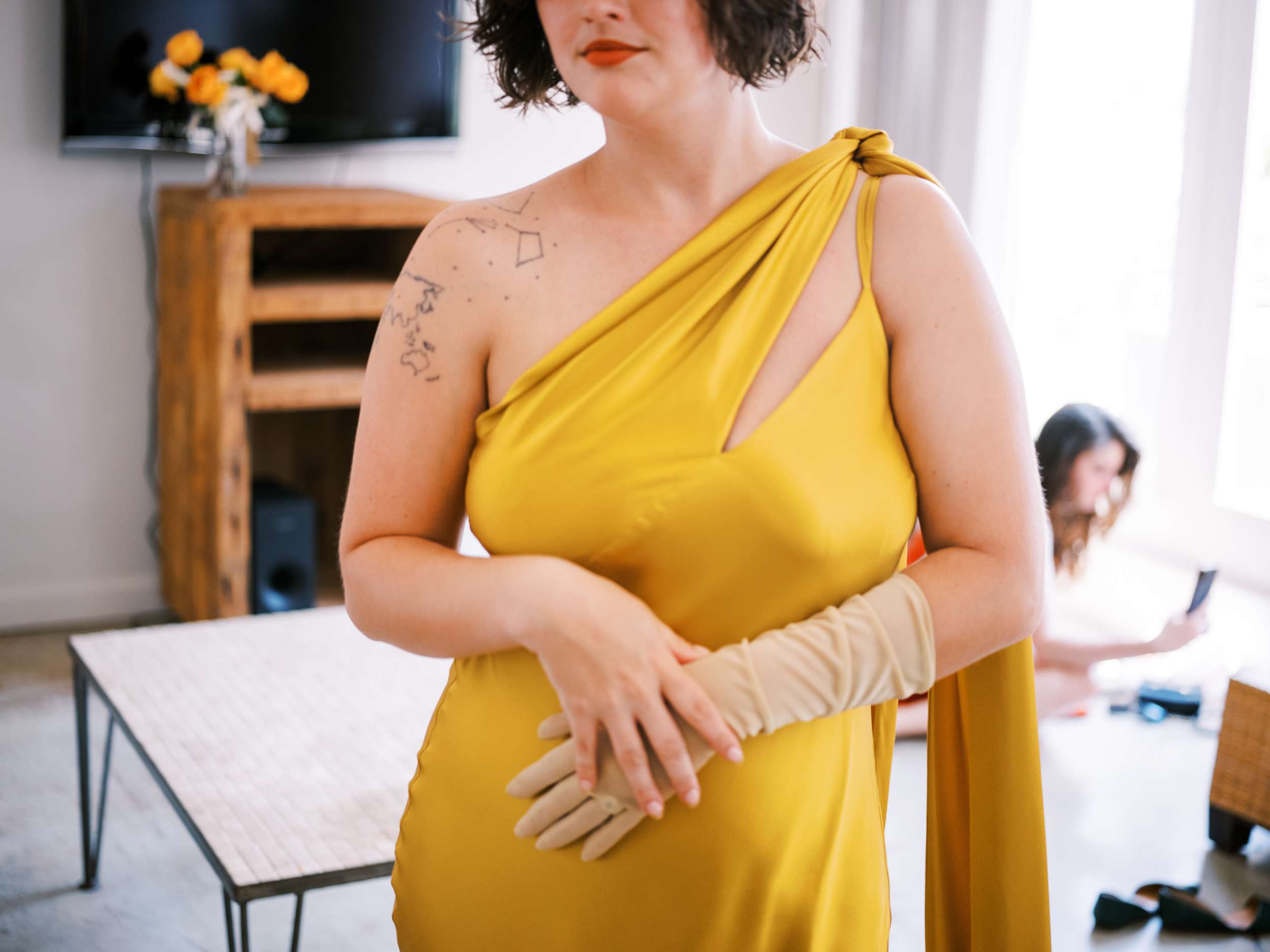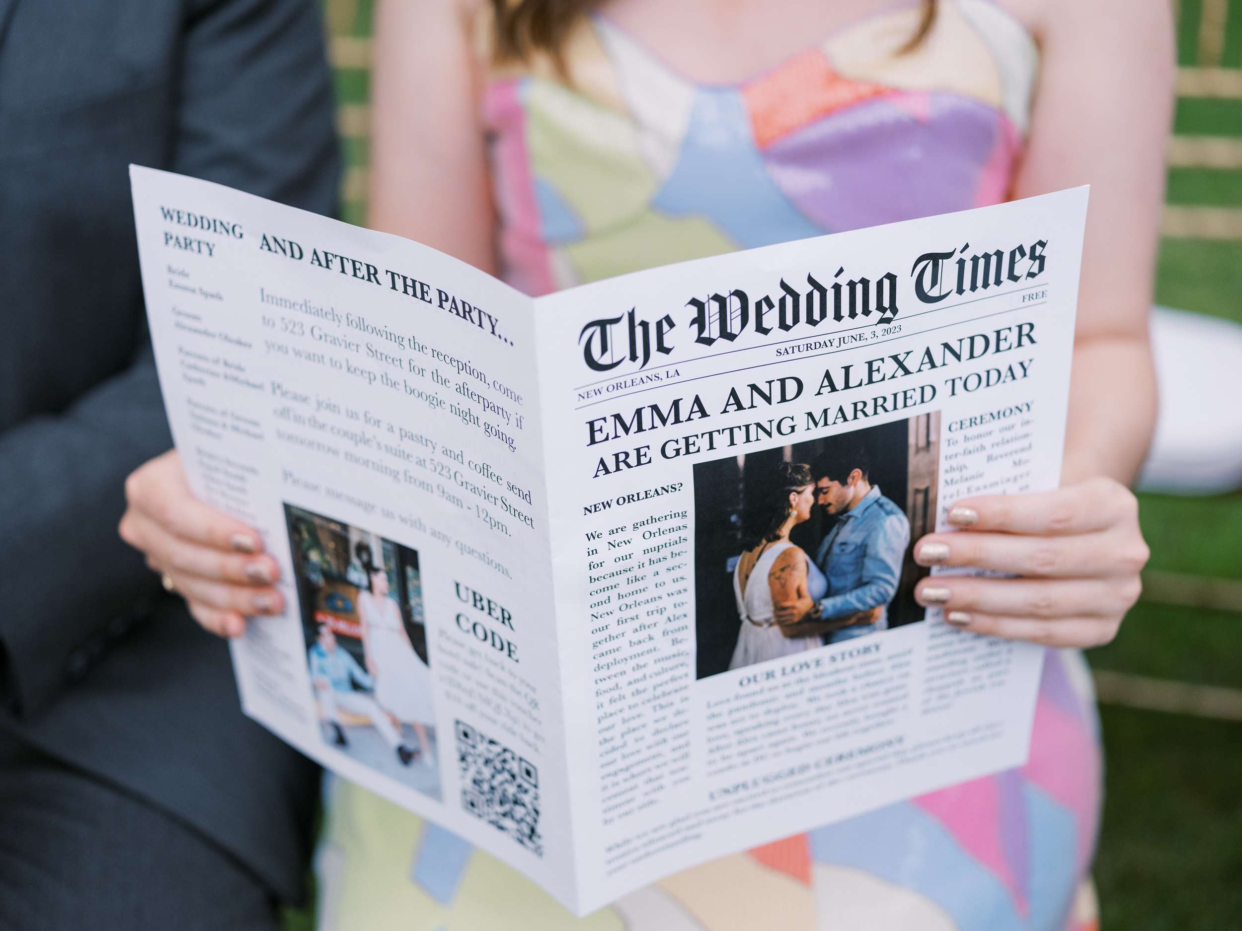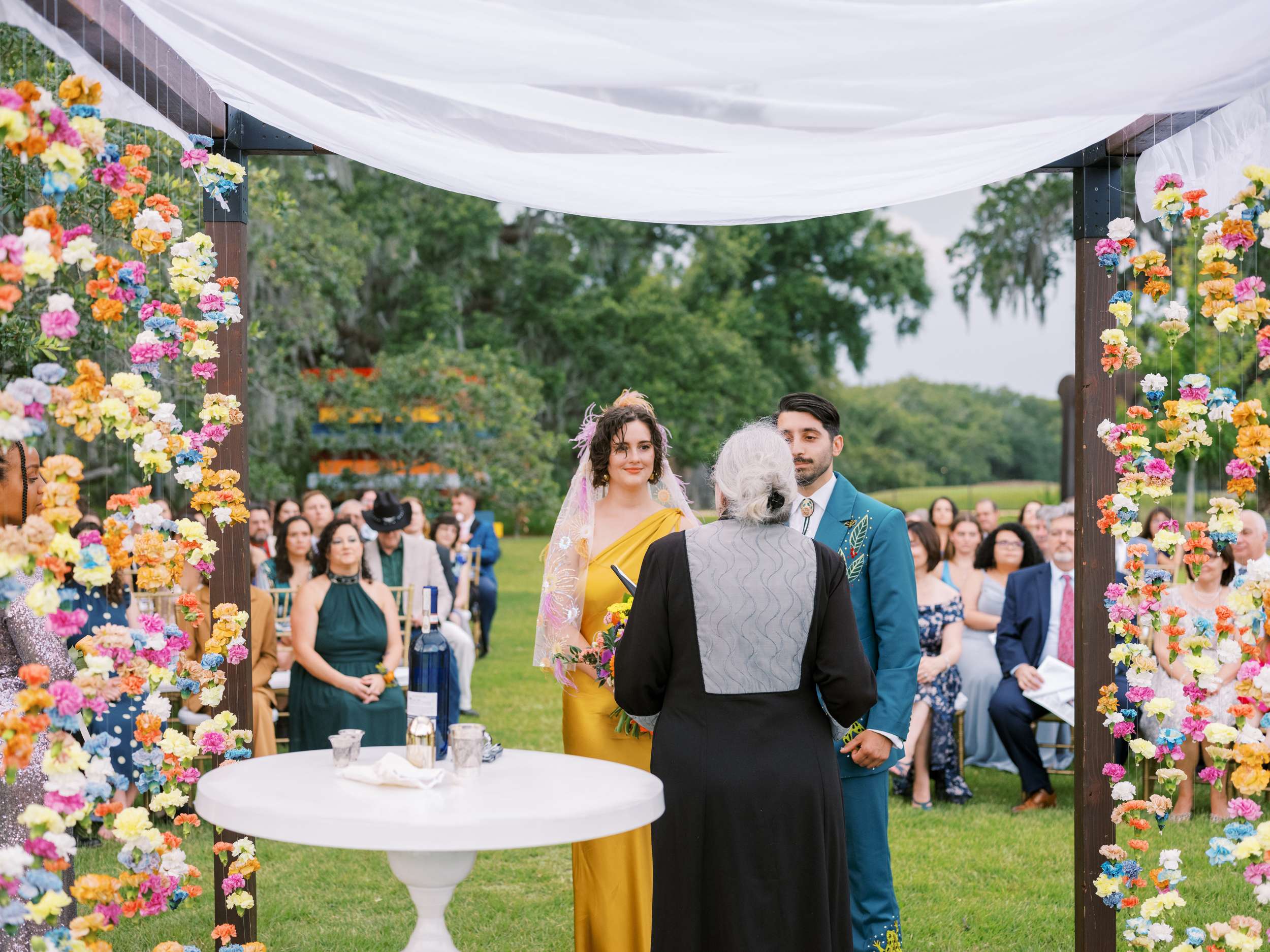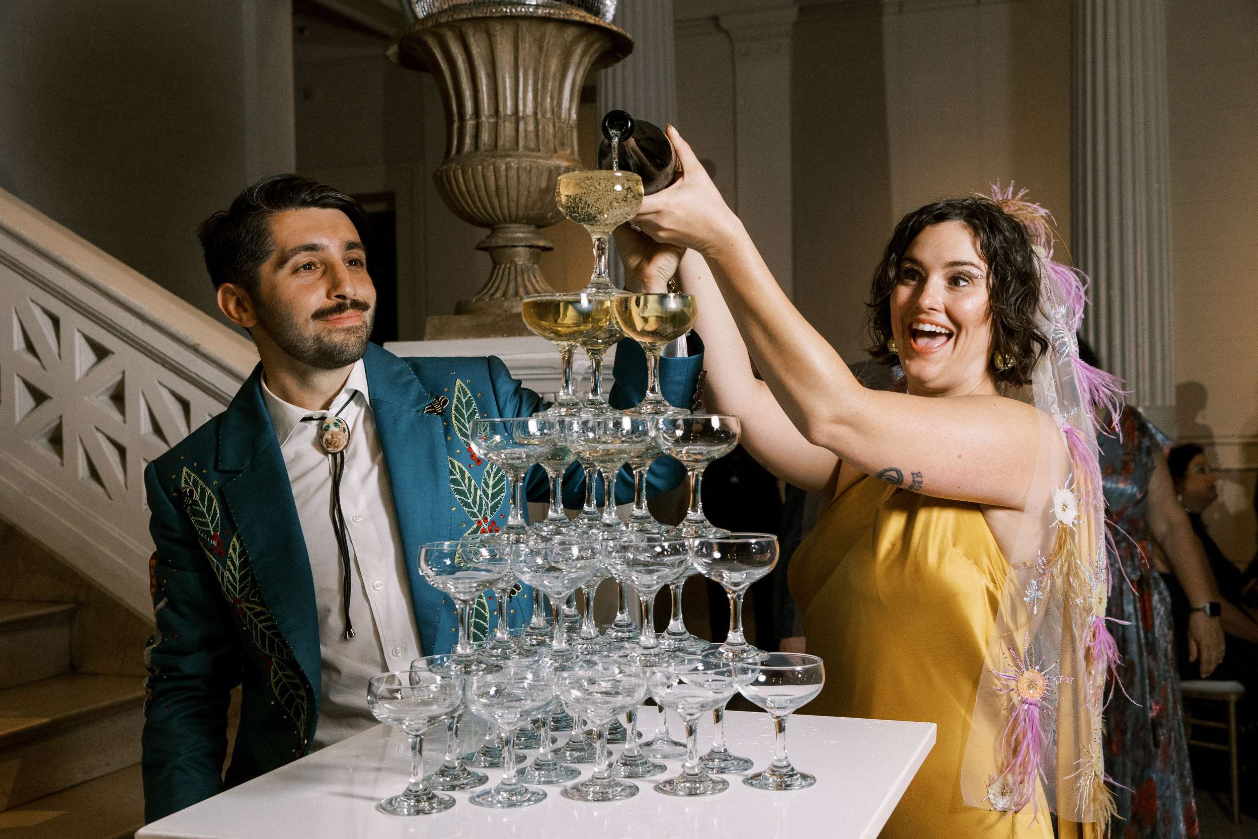 Emma and Alex’s summer wedding was held at the New Orleans Museum of Art, with the ceremony outside in the sculpture garden. The bride opted to wear yellow, with the groom in statement suit with custom appliques and a bolo tie hand-carved for him by his grandfather. Their theme, a blend of disco and classic country influences, was inspired by the venue’s colourful surroundings as well as their desire to have a wedding which was true to them rather than following trends.