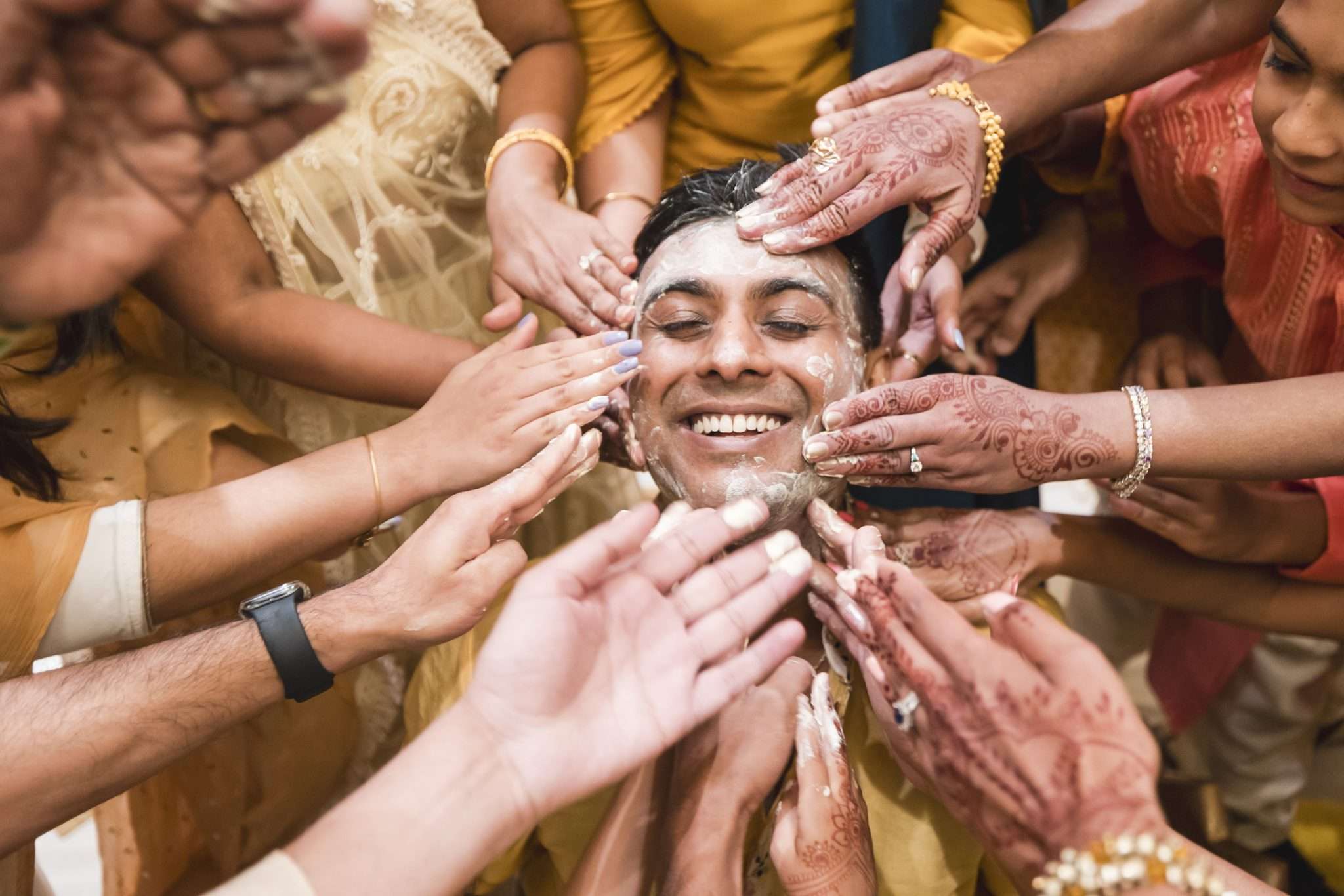 For the reception, the balance of black and white took centre stage. Their tuxedos, designed in collaboration with Rivesse Clothing, reflected their theme as much as their individual styles. “We loved Collaborating with Rivesse on all our custom outfits”, they said. “Each garment represented a different cultural event. We wore vibrant yellow for the Haldi, deep blue for the Mehendi, white sherwanis for the ceremony, and black and white tuxedos for the reception.”