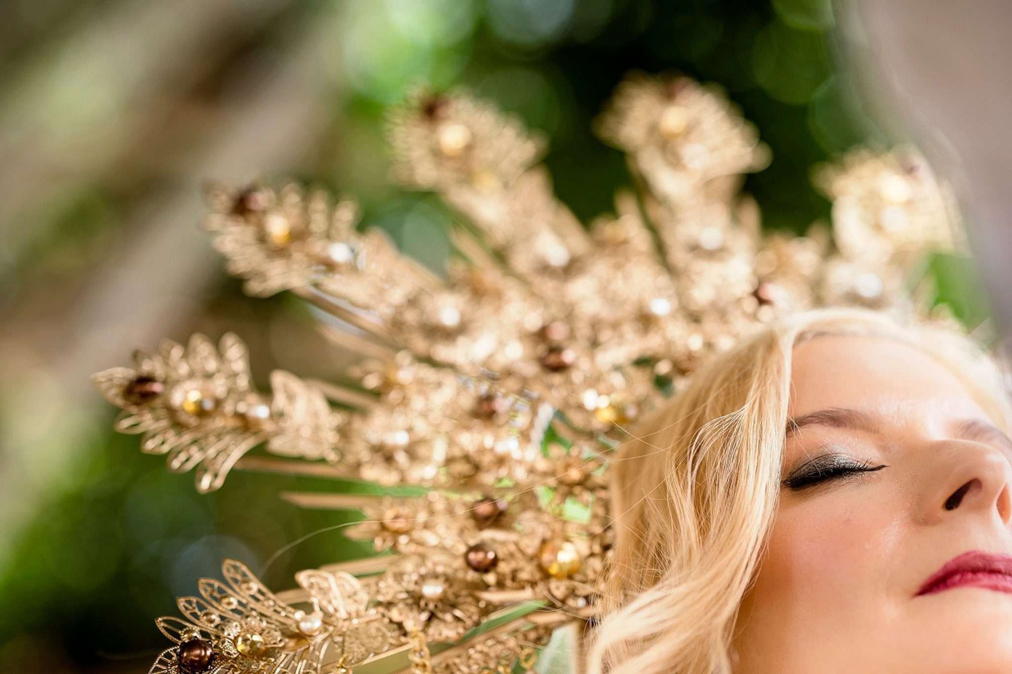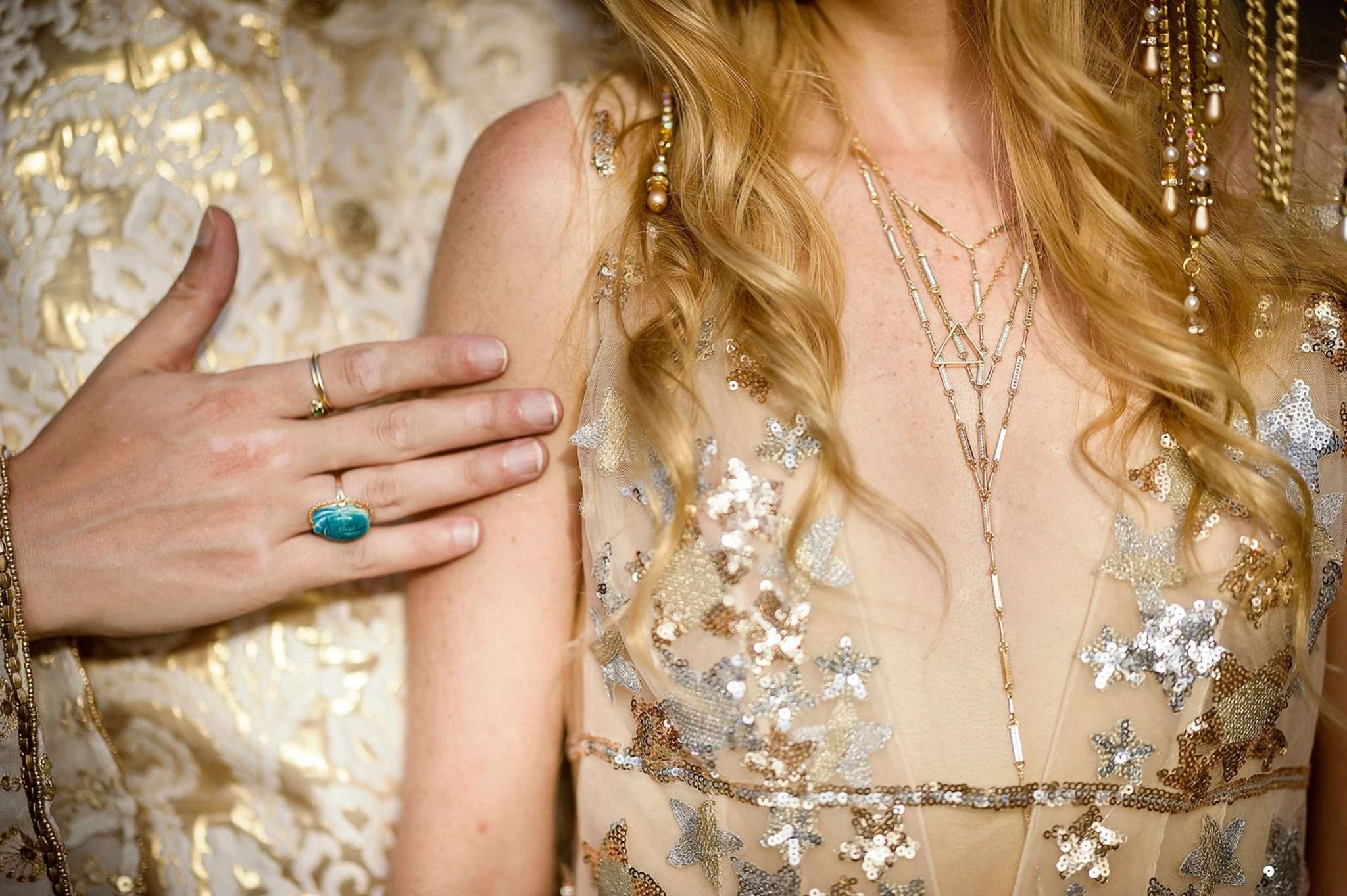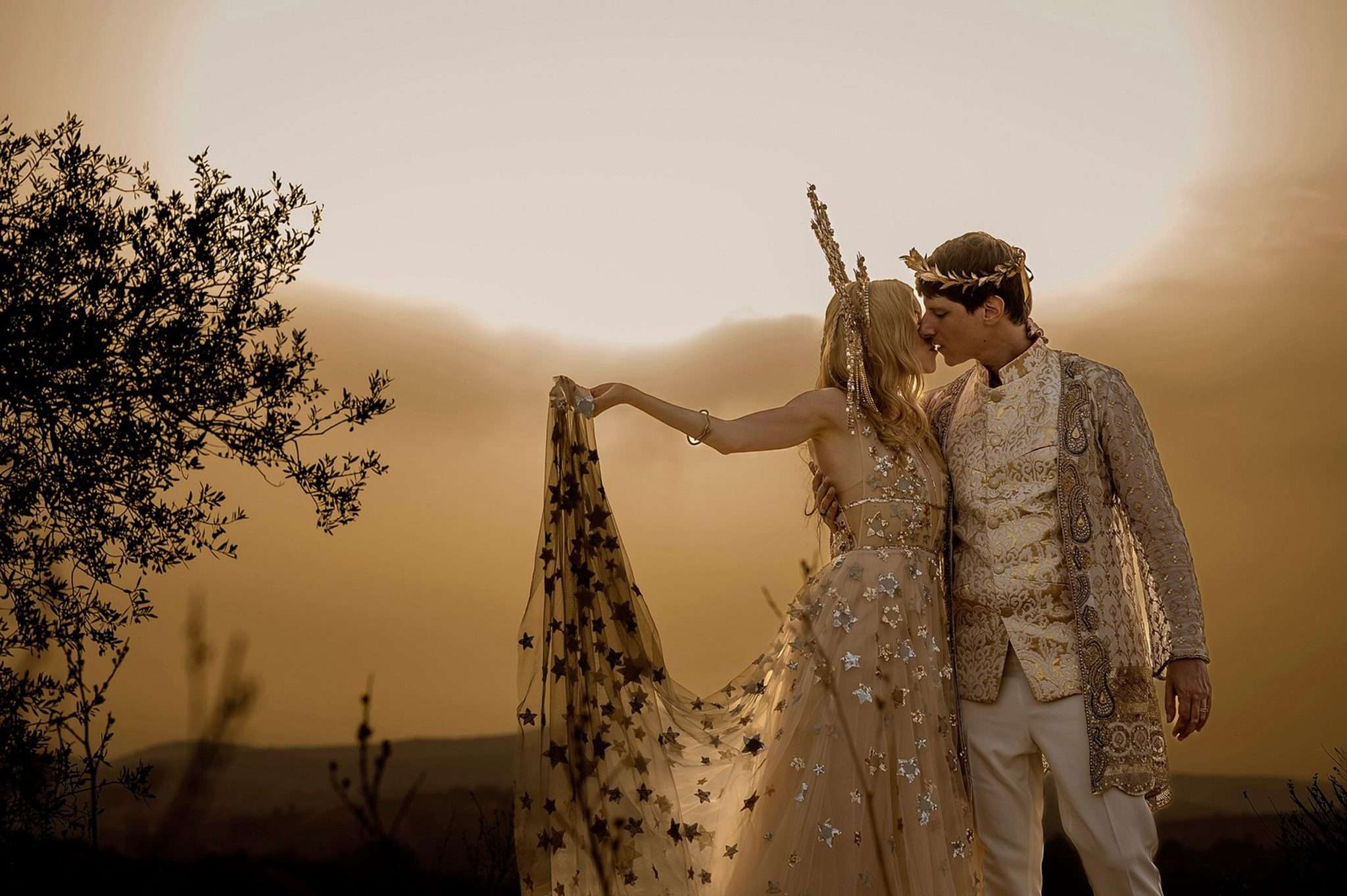 The couple dressed in gold and white. Antonia wore a gown adorned with stars and a Carbickova Crown. Daren wore a laurel crown and eyeliner. The ceremony itself was performed by the Phoenicians, a duo who specialise in reconstructing ancient rituals. They brought prayers, sea-water purification, and blessings to the deities. A friend of the family led the vows. She’s been a spiritual guide to Antonia since childhood.