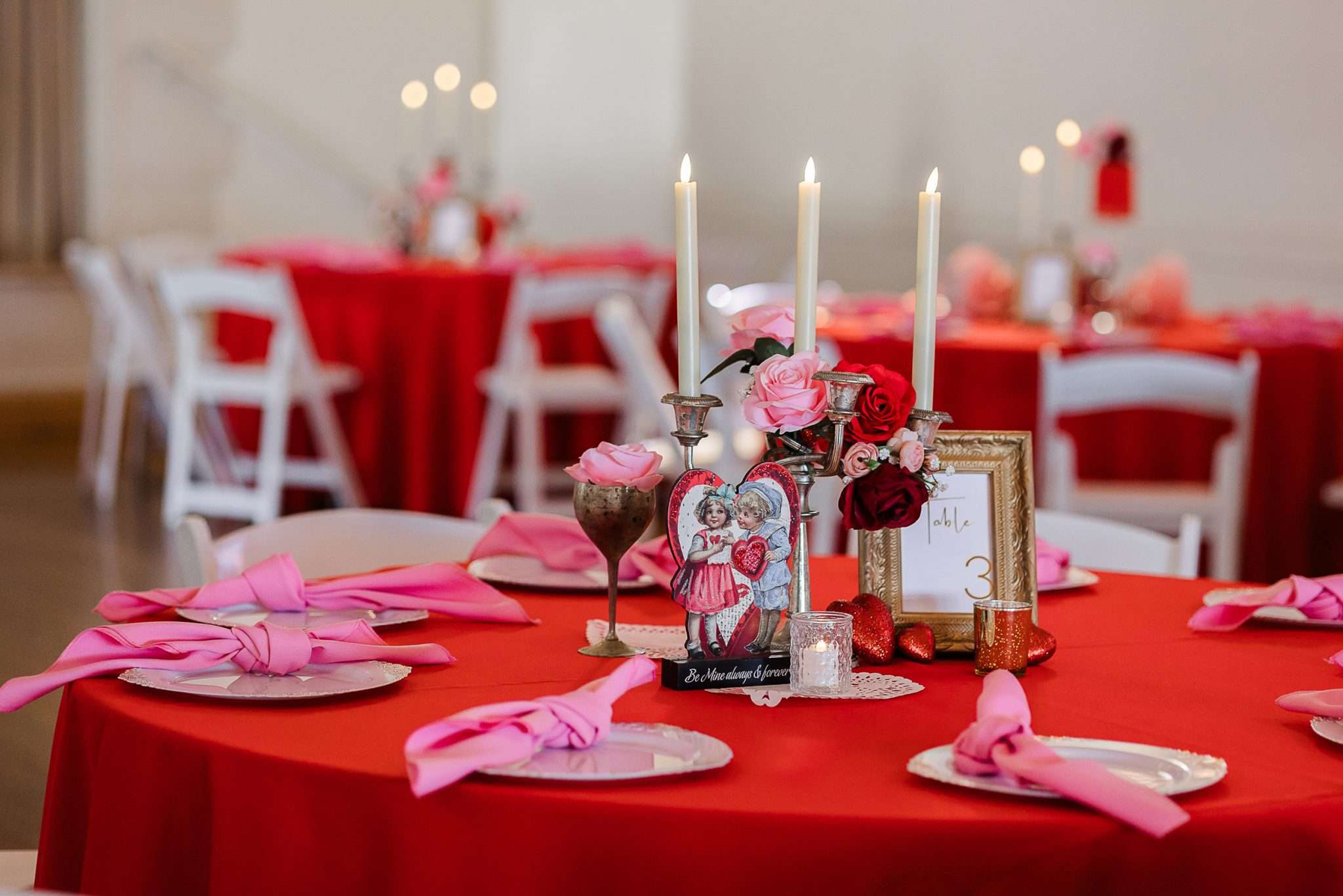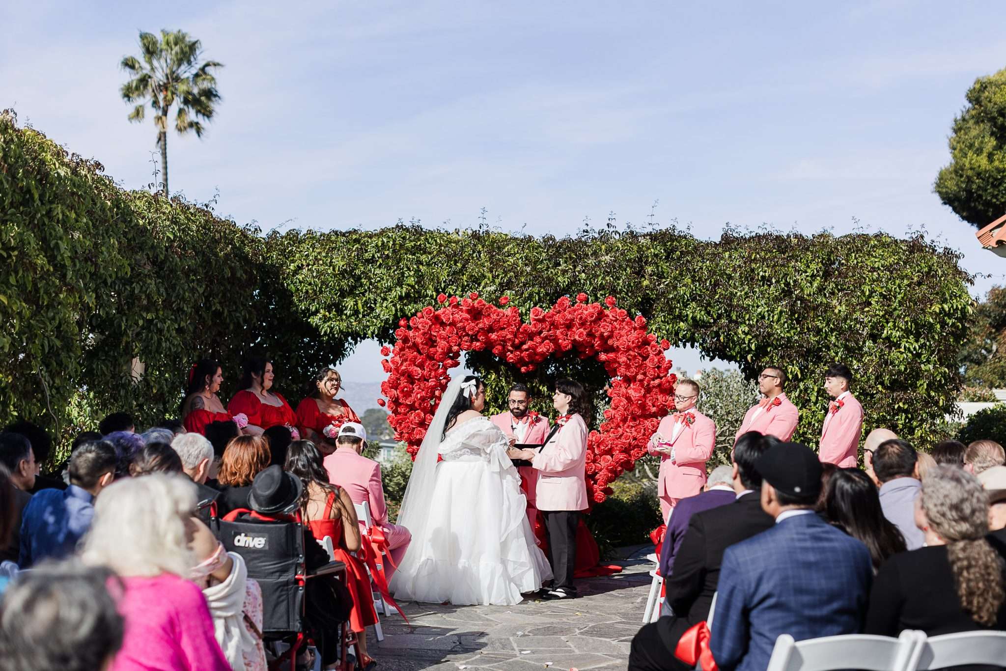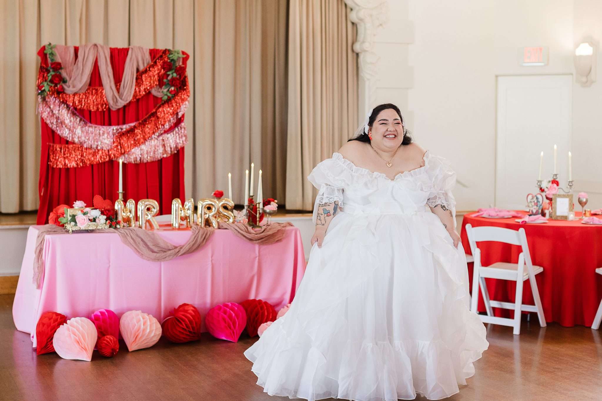 The colour palette from Victoria and Melvin’s wedding was lifted straight from a vintage Valentine’s card: bold reds, sugary pinks, hearts and kitsch. They filled the space with trinkets, tchotchkes and sentimental touches that echoed their own décor style. “The overall look really reminded us of our very eclectic and colourful home,” they said. “It was a comforting environment to be in that screamed us!”