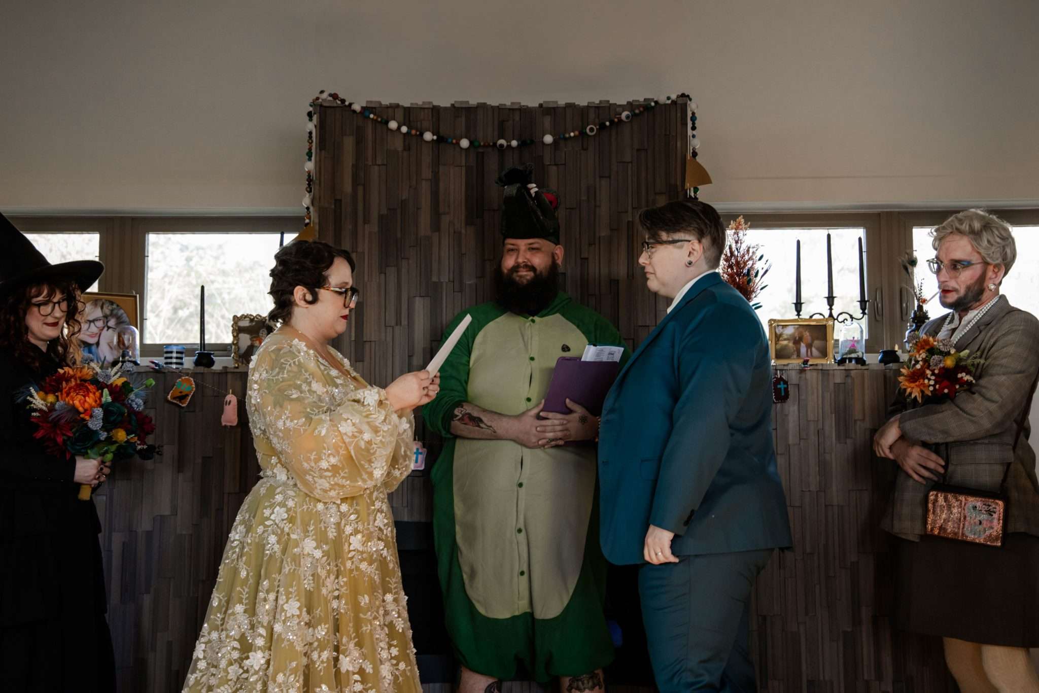 At the ceremony, the officiant (also a friend) wore an alligator costume inspired by the film Pearl. They exchanged vows beneath bunting that, briefly, took flight thanks to an accidentally activated ceiling fan! Candles and bud vases lined the aisle, and both brides walked down with someone significant – Joi with their best friend and Jillian with her mum – while The Cure’s Love Song played.