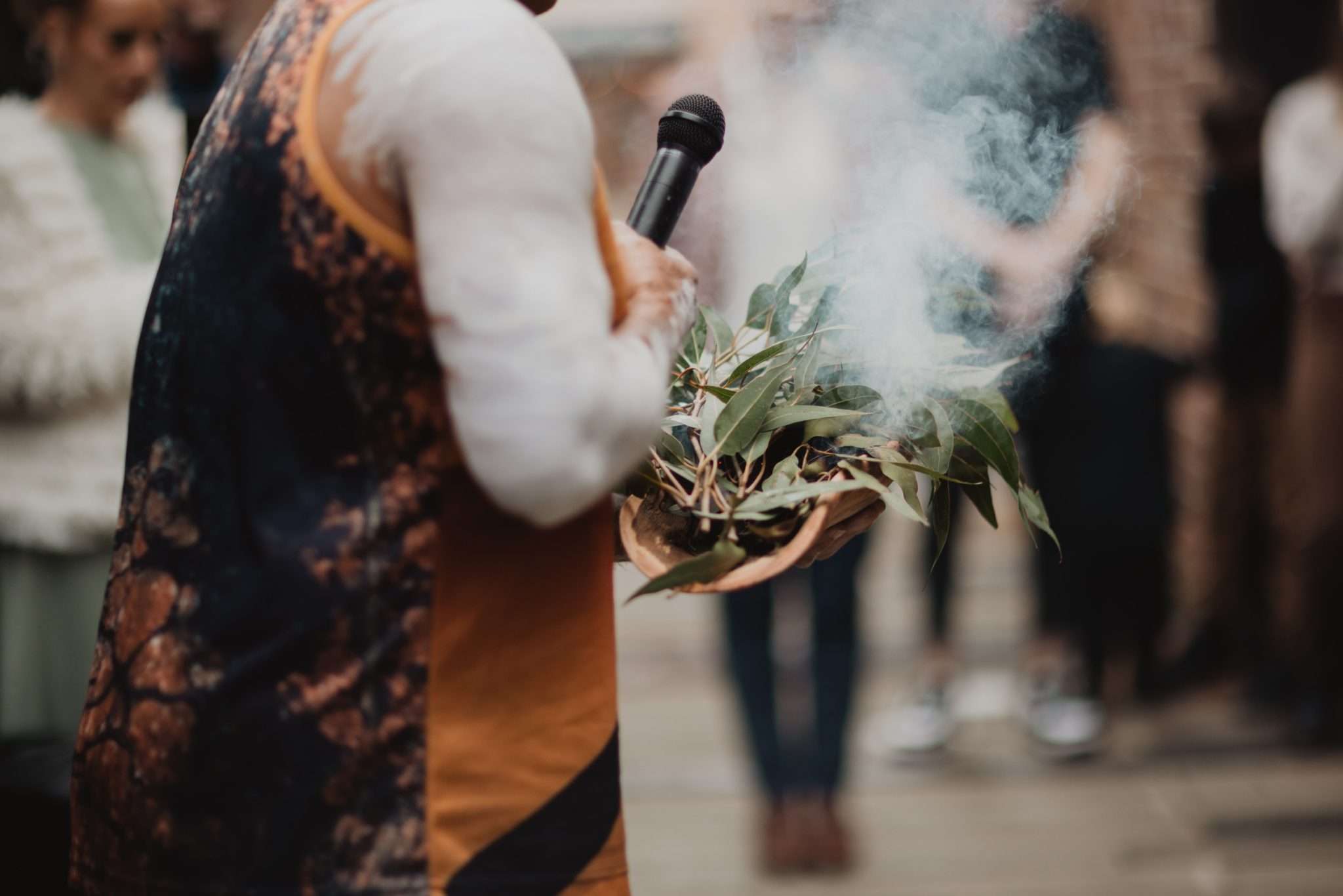 Before the ceremony began, guests were invited to take part in a traditional Aboriginal smoking ceremony. Billy is Pairrebeenne, and the couple wanted to start the day with a sense of connection and meaning. The ritual was led by an Awabakal elder, who used native leaves to create smoke and blessed each guest with ochre on the forehead. As an added surprise, he played the yidaki (didgeridoo). “I really just can’t say the word ‘magical’ enough to describe the ceremony,” Jodie said. After this blessing, celebrant Sarah Chippindale took over. Once they were done, the mood shifted, and they walked out to Bad Romance with rainbow confetti cannons going off!