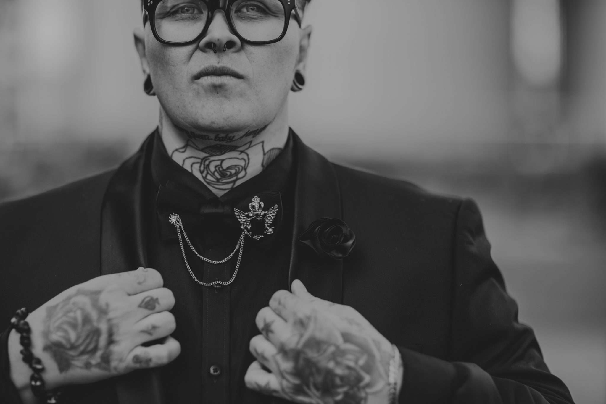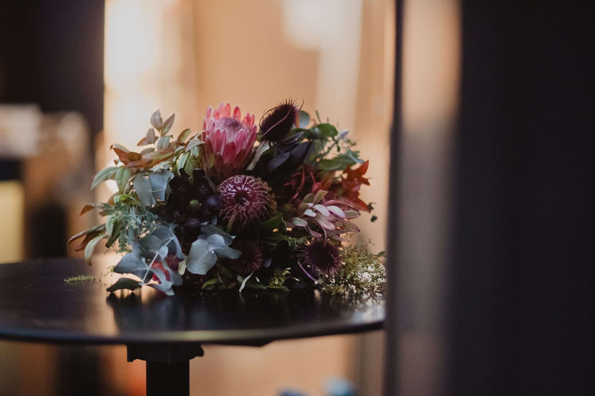 “Our first wedding actually served as the best tips for what we didn’t want this time”, Jodie told us. “We don’t like white, cutesy stuff and hated the idea of big, impersonal, generic looking spaces. This time was about having what we wanted instead of having what we ‘should’ have. We wanted something to reflect who we are, so we had some non-negotiables: for Jodie it was wearing black, and for Billy it was including their Aboriginal culture. We also agreed that feeling glamorous in the heat of an Australian summer was near impossible, and we wanted a moody vibe so it was a winter wedding from the get-go.”