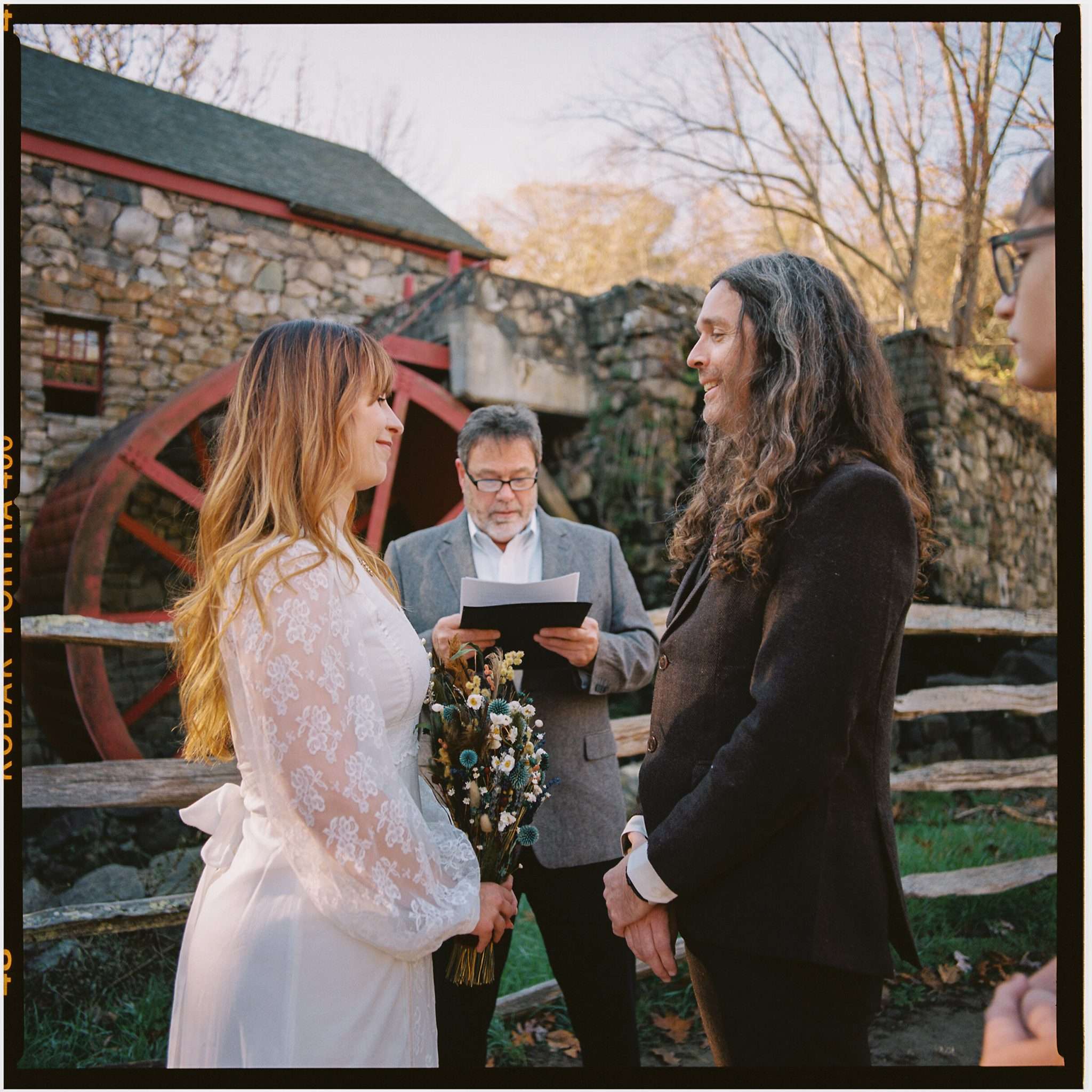 Planning something that avoided religious overtones, clashing values, and awkward small talk became the priority. So they skipped all of it and started looking north. The final location was the Grist Mill at Longfellow’s Wayside Inn in Sudbury, Massachusetts. They were the first couple to ever hold a wedding ceremony in front of it. They were also the first to get married there before noon. The ceremony took place at 9:30am. “That left the next couple of hours for photos, then whatever we wanted to do,” Helena said. “The best part of the location was the hire fee was just a It simple donation to their historical preservation and a photography deposit. That thrilled us being history lovers.”
