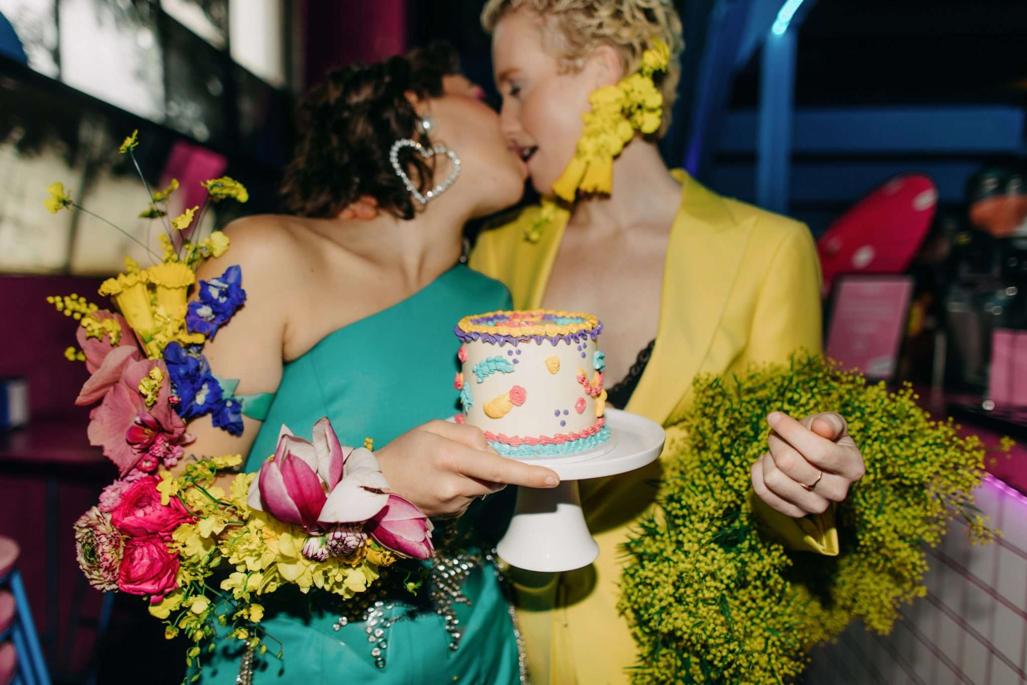 “Have fun, be yourself, trust your vendors”, Kyra concluded. “Tell your vendors what you love but also ask them if there are any ideas that excite them! They are artists who are often stuck creating similar pieces for every wedding. A styled shoot like this shows what is possible! For example, the wattle boa and neon power suits were just a passion project on the part of the vendors. We’d love to see more colour and bold choices at real life weddings!”