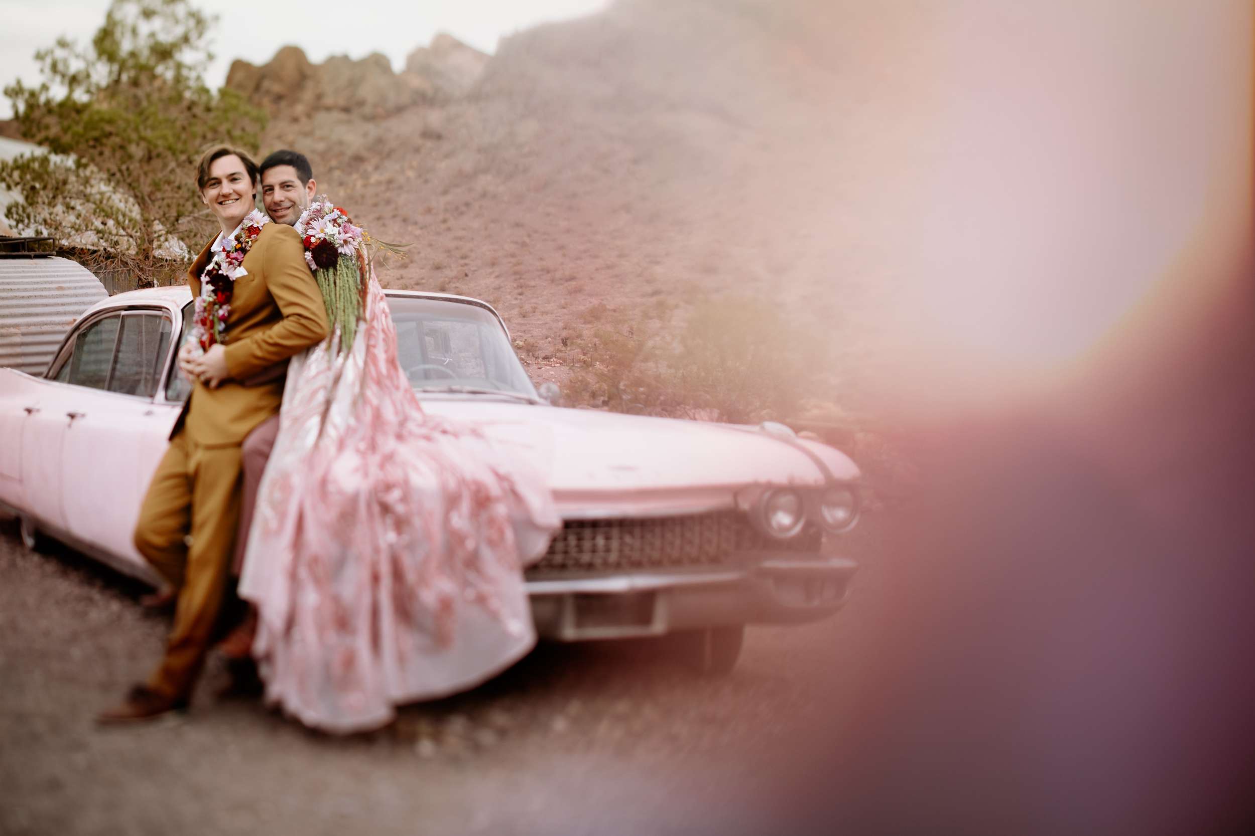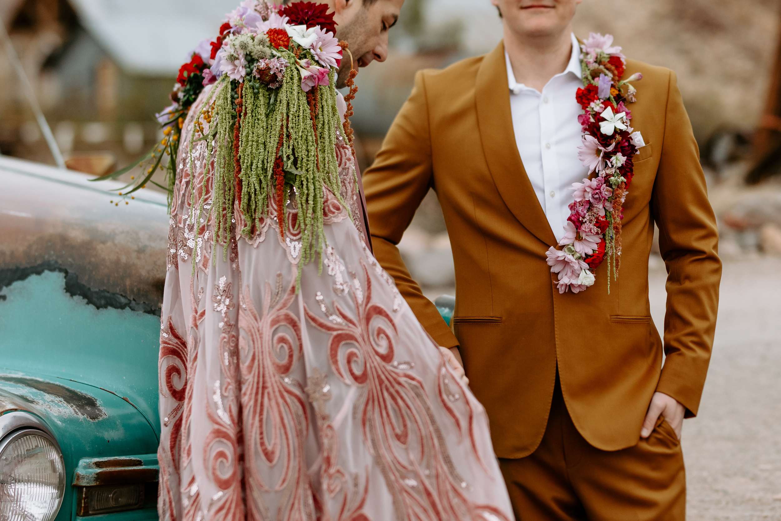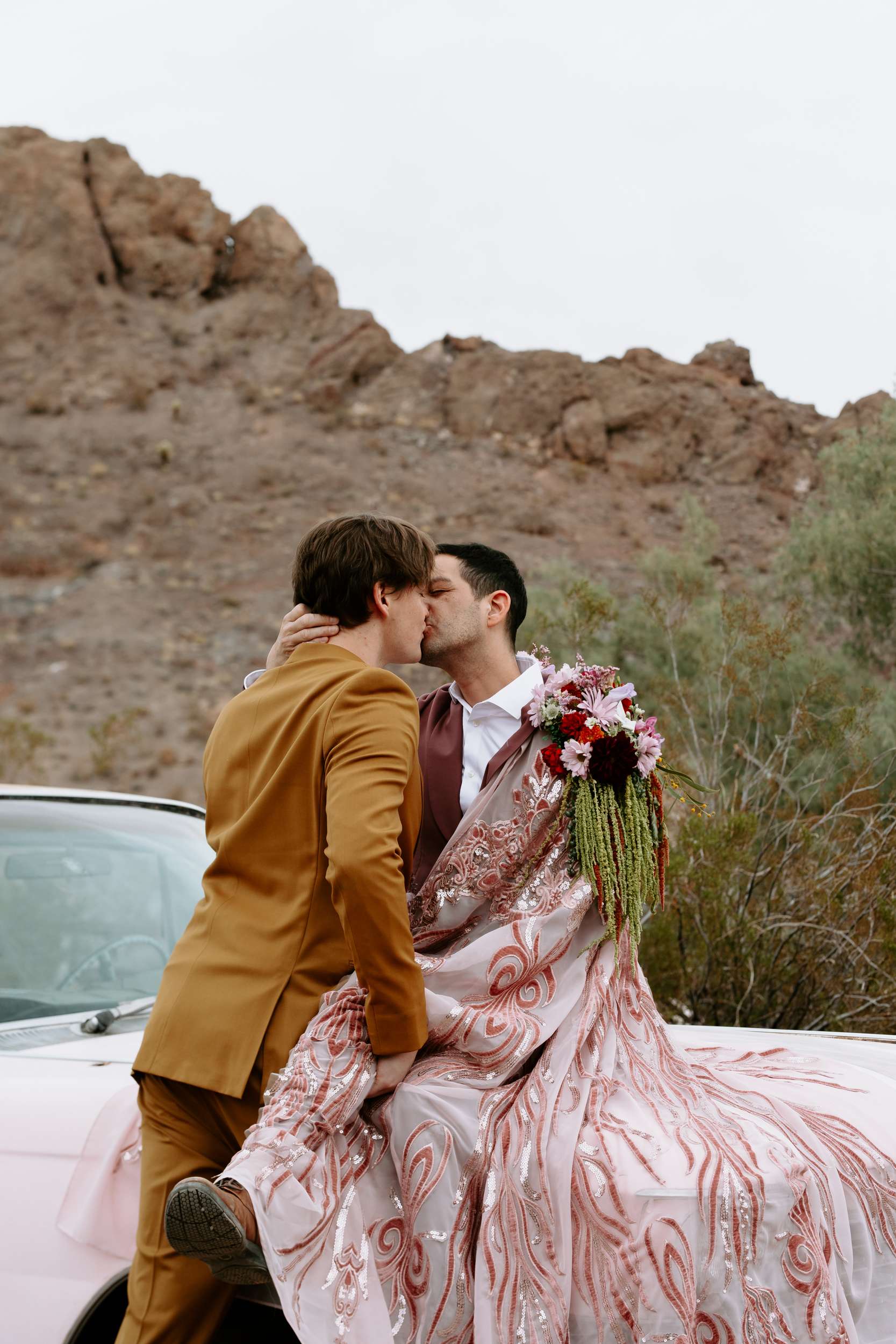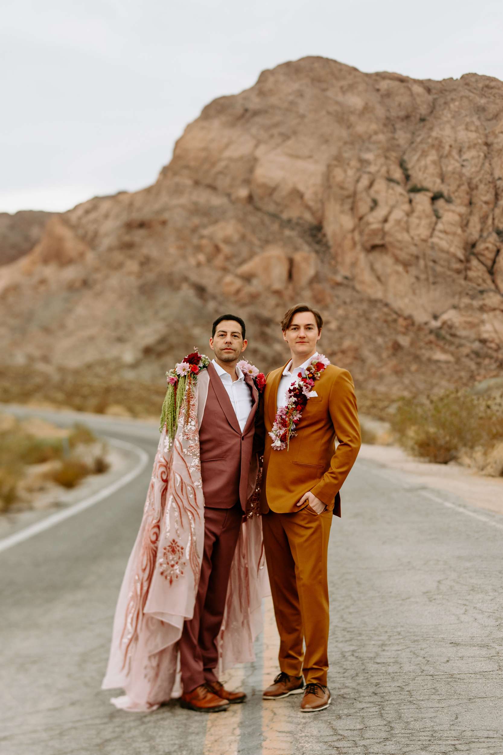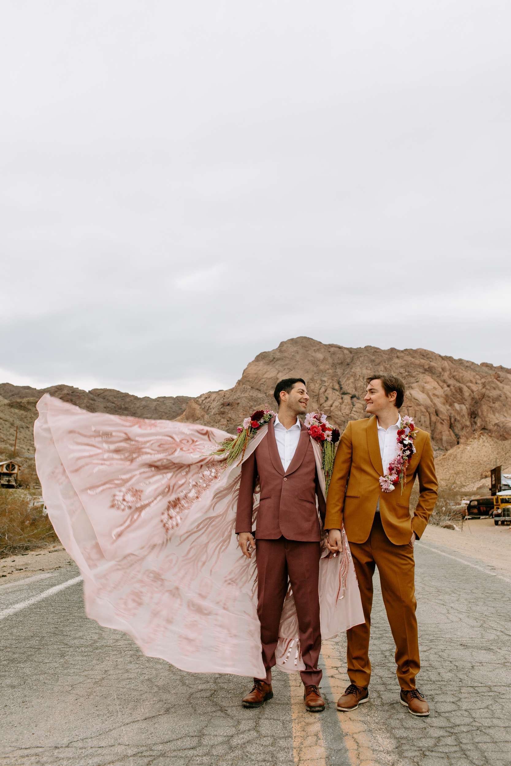 The scene felt part old Vegas, part queer fairytale, part desert daydream. The shoot shows that you don’t have to ask for permission to be yourselves when you get married. Instead, it shows what’s possible. Men can wear flowers. Men can wear capes. Men can look soft, powerful, expressive, romantic – all at the same time. “Take your time finding what feels right for you and creating a vision that is truly your own,” Cat continued. “You don’t need a lot of details when the details have meaning.”