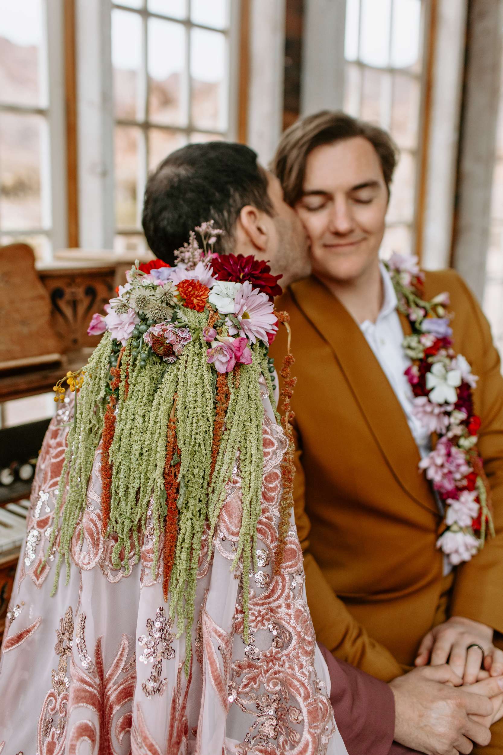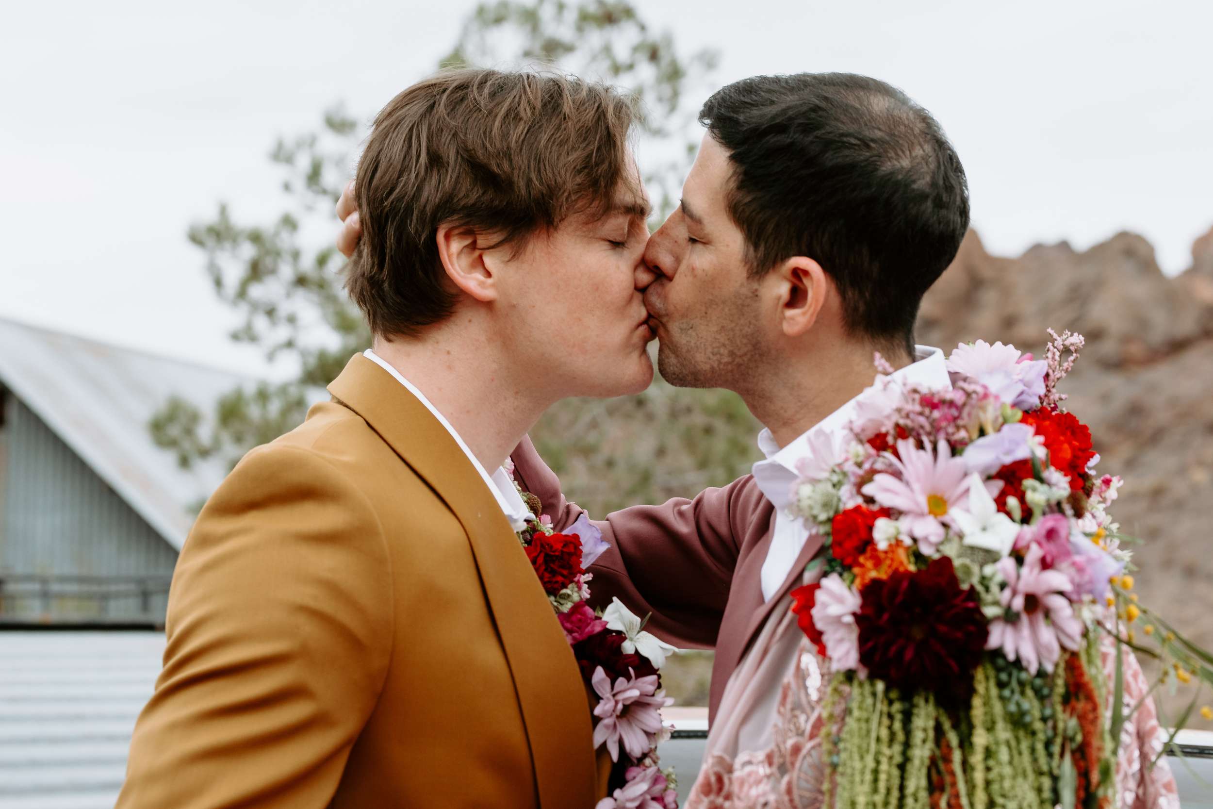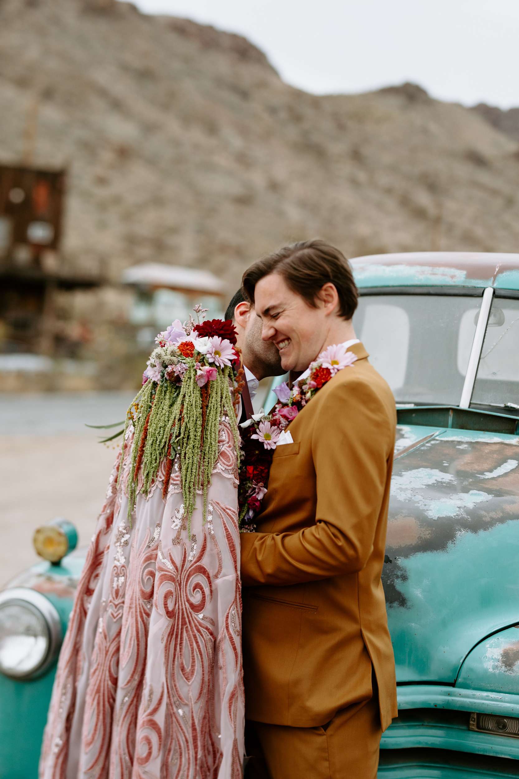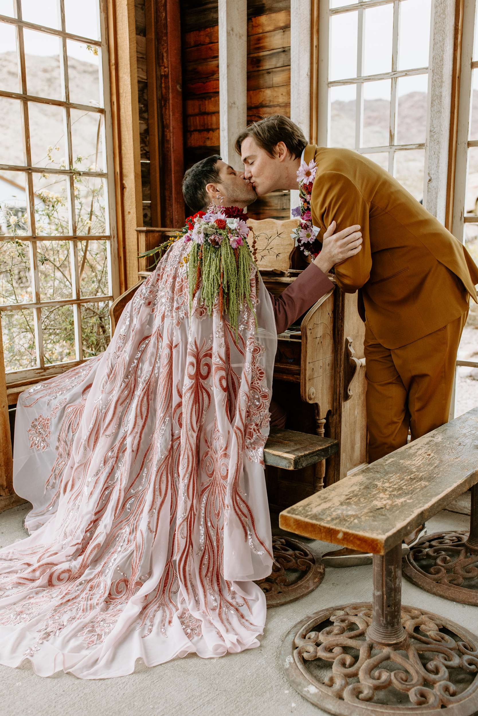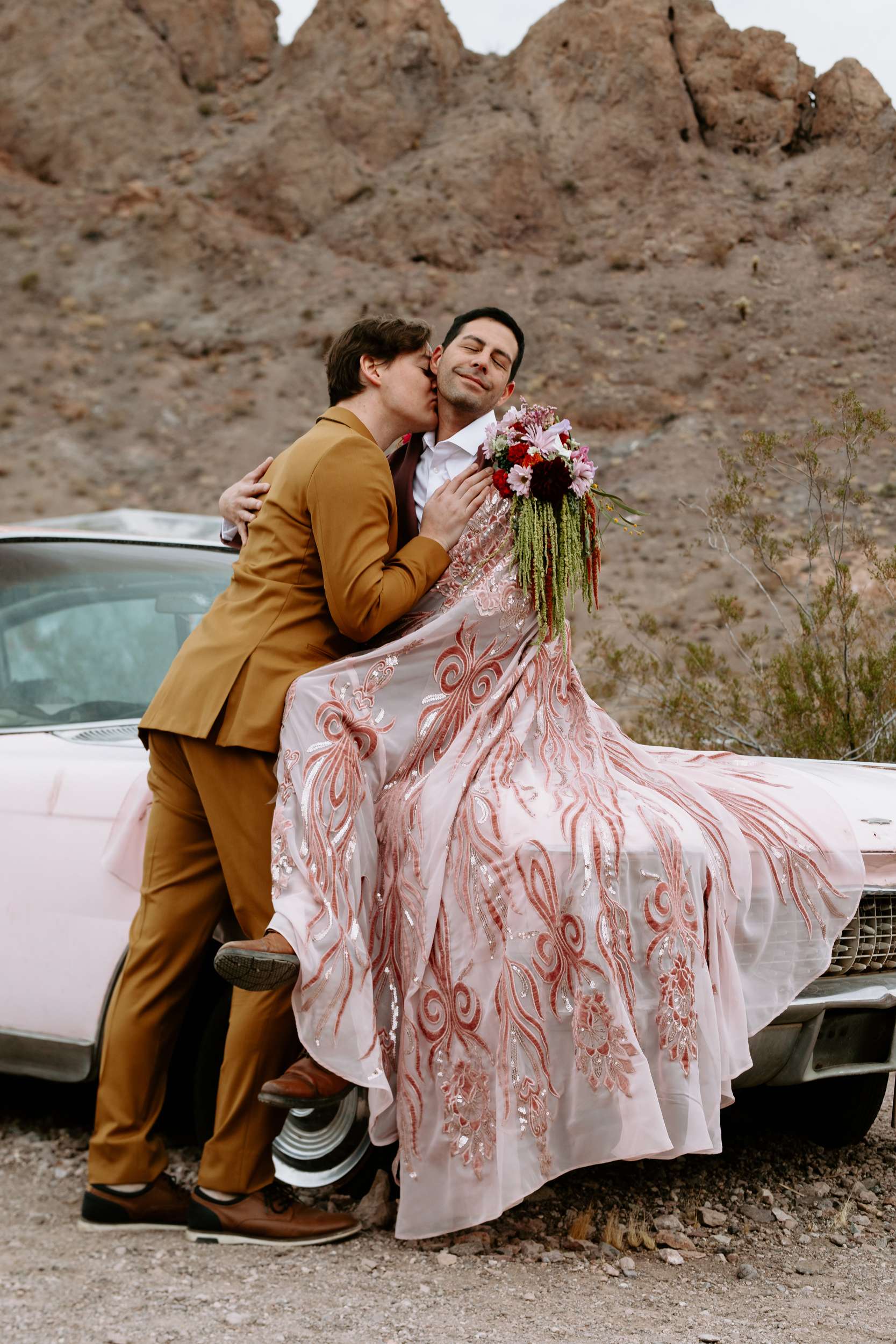 The scene felt part old Vegas, part queer fairytale, part desert daydream. The shoot shows that you don’t have to ask for permission to be yourselves when you get married. Instead, it shows what’s possible. Men can wear flowers. Men can wear capes. Men can look soft, powerful, expressive, romantic – all at the same time. “Take your time finding what feels right for you and creating a vision that is truly your own,” Cat continued. “You don’t need a lot of details when the details have meaning.”