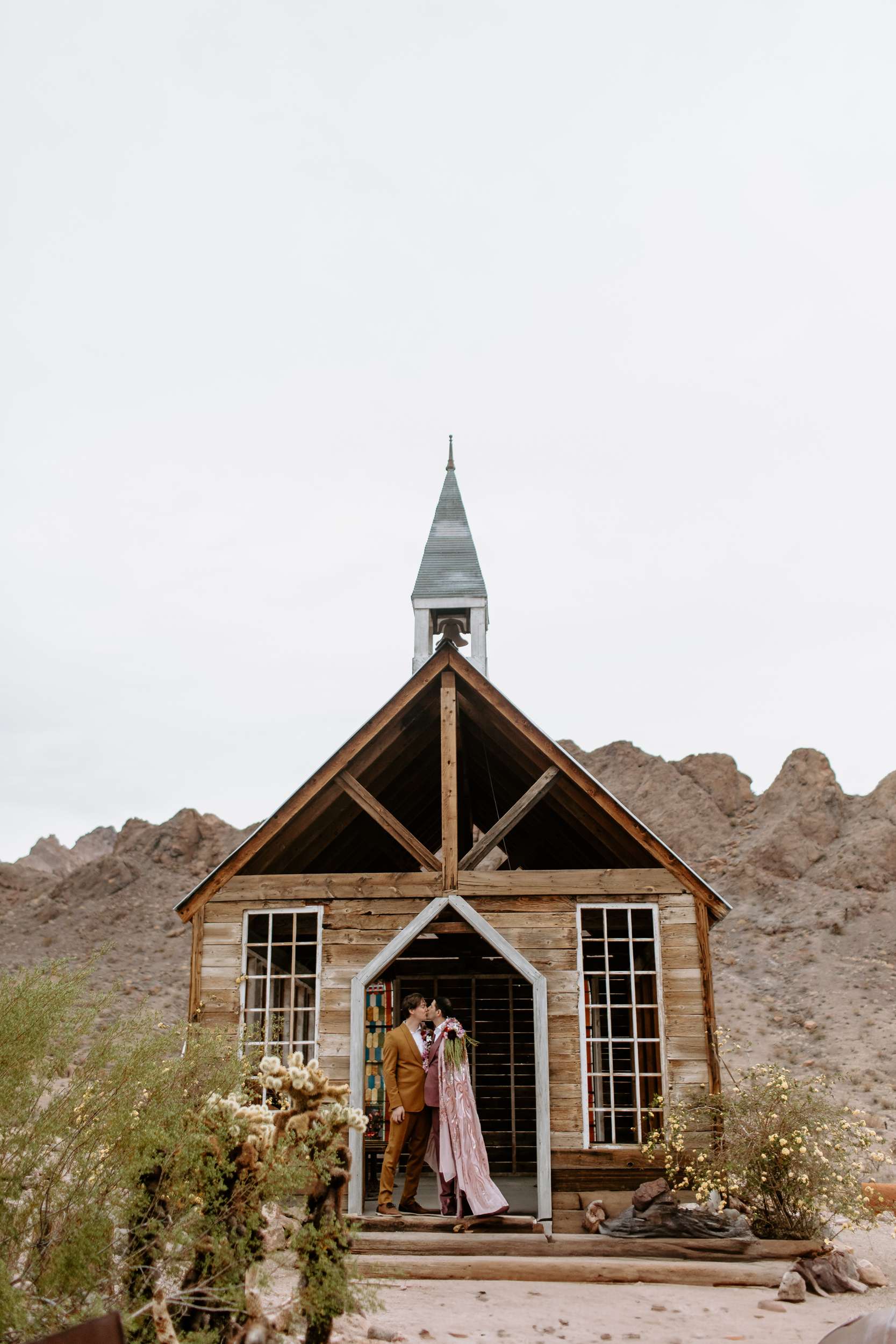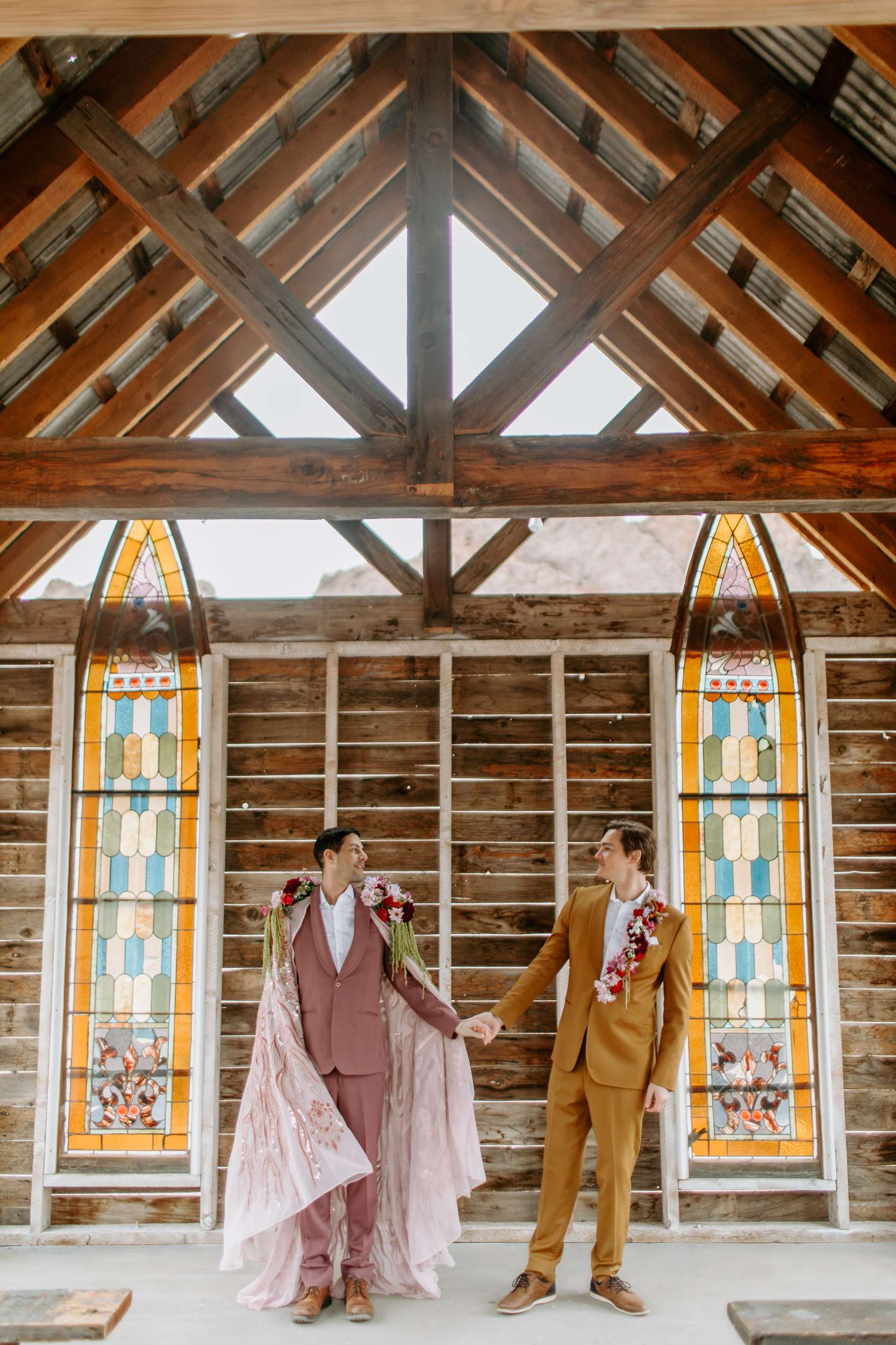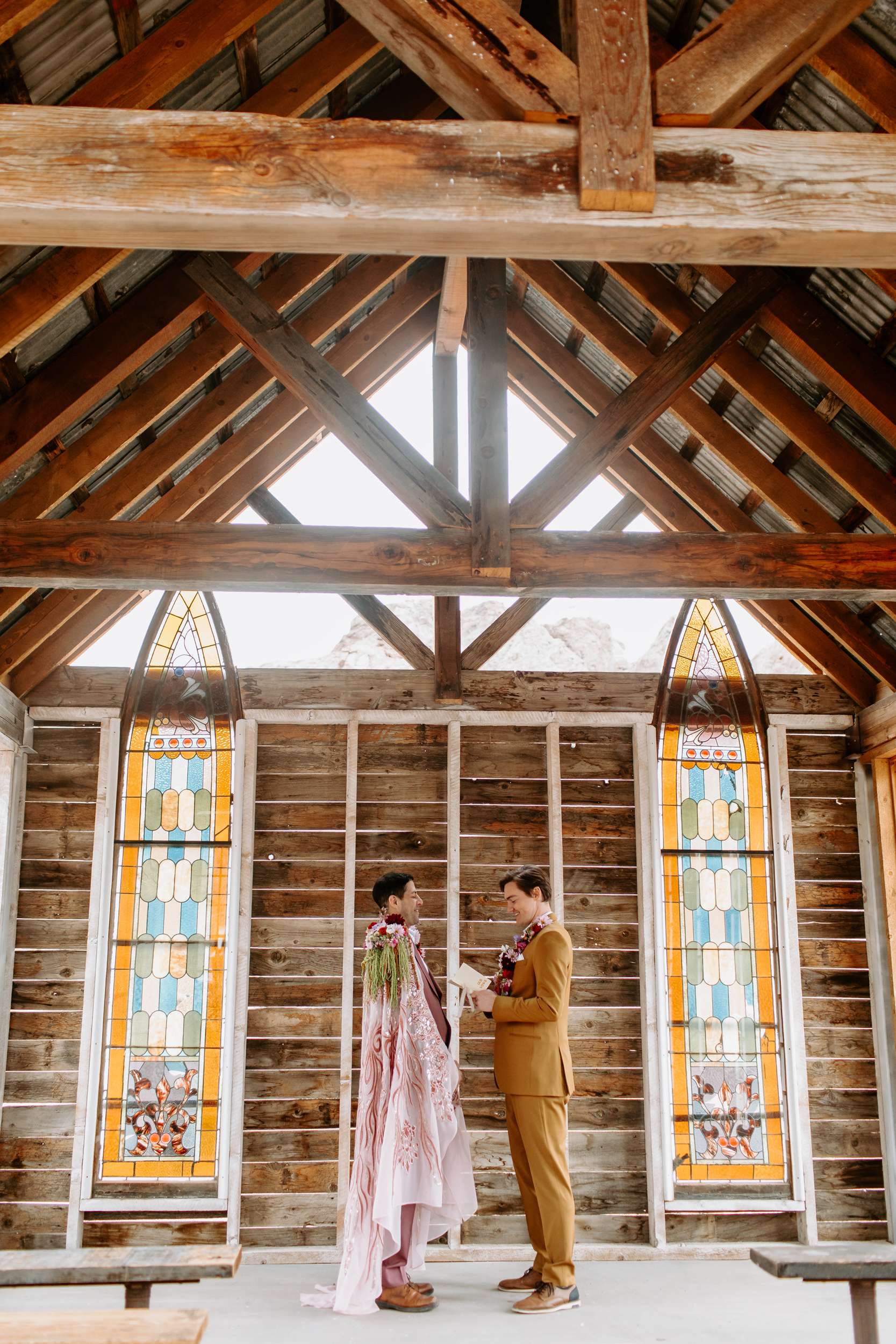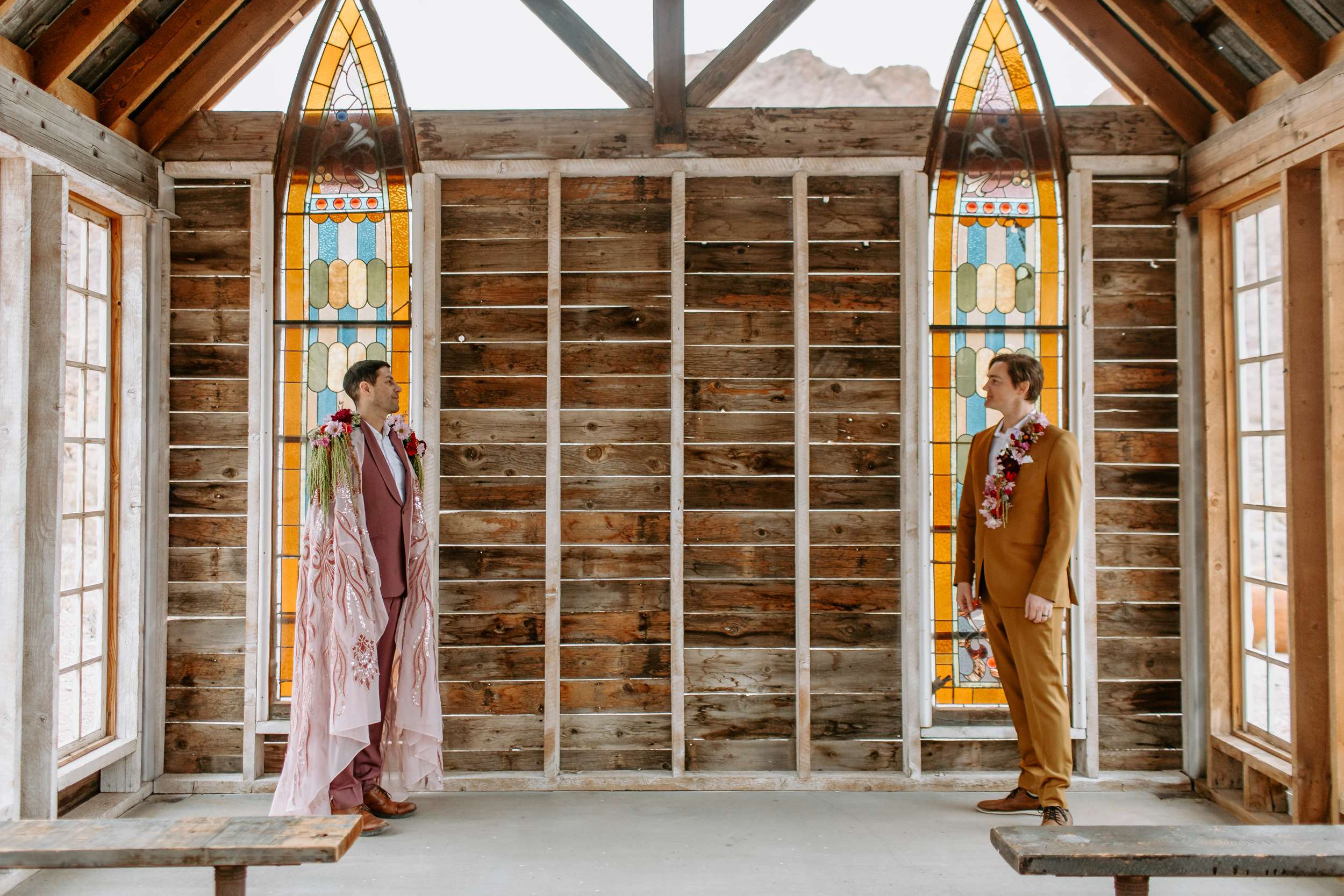 “Kyle and Alex turned an early morning in the ghost town into a stunning fashion narrative that feels both timeless and unforgettable”, photographer Cat Dossett writes. ” I wanted to use florals in a unique way paired with the colourful suits, and once we came up with the shoulder pads, the cape felt like a perfect pairing. It came together so naturally after we found the fabric, reminiscent of The Flamingo in nearby downtown Las Vegas. Each piece was cut out individually to create that cape and it adds the perfect flair, swirling amongst the cacti and dust. Alex and Kyle also read short sweet vows in a handmade notebook, paired with an invite that replicated some of the stained glass found in the ghost town.”