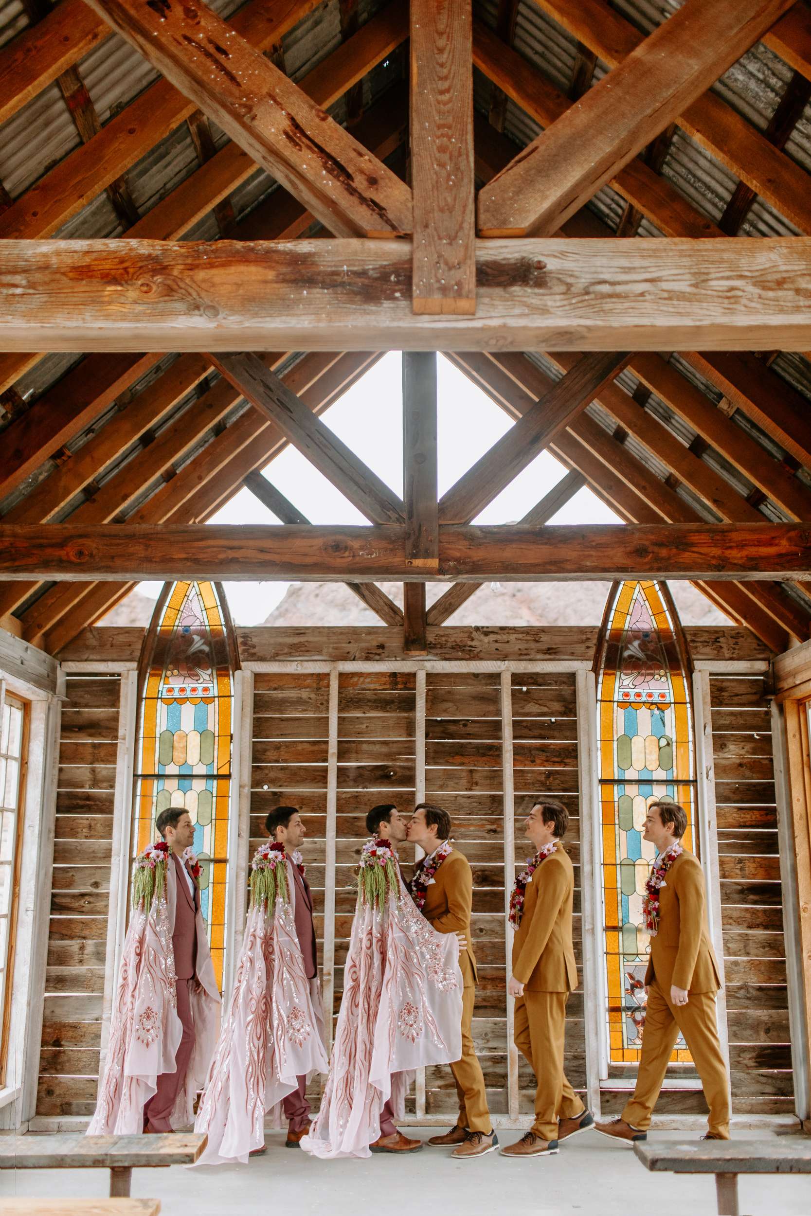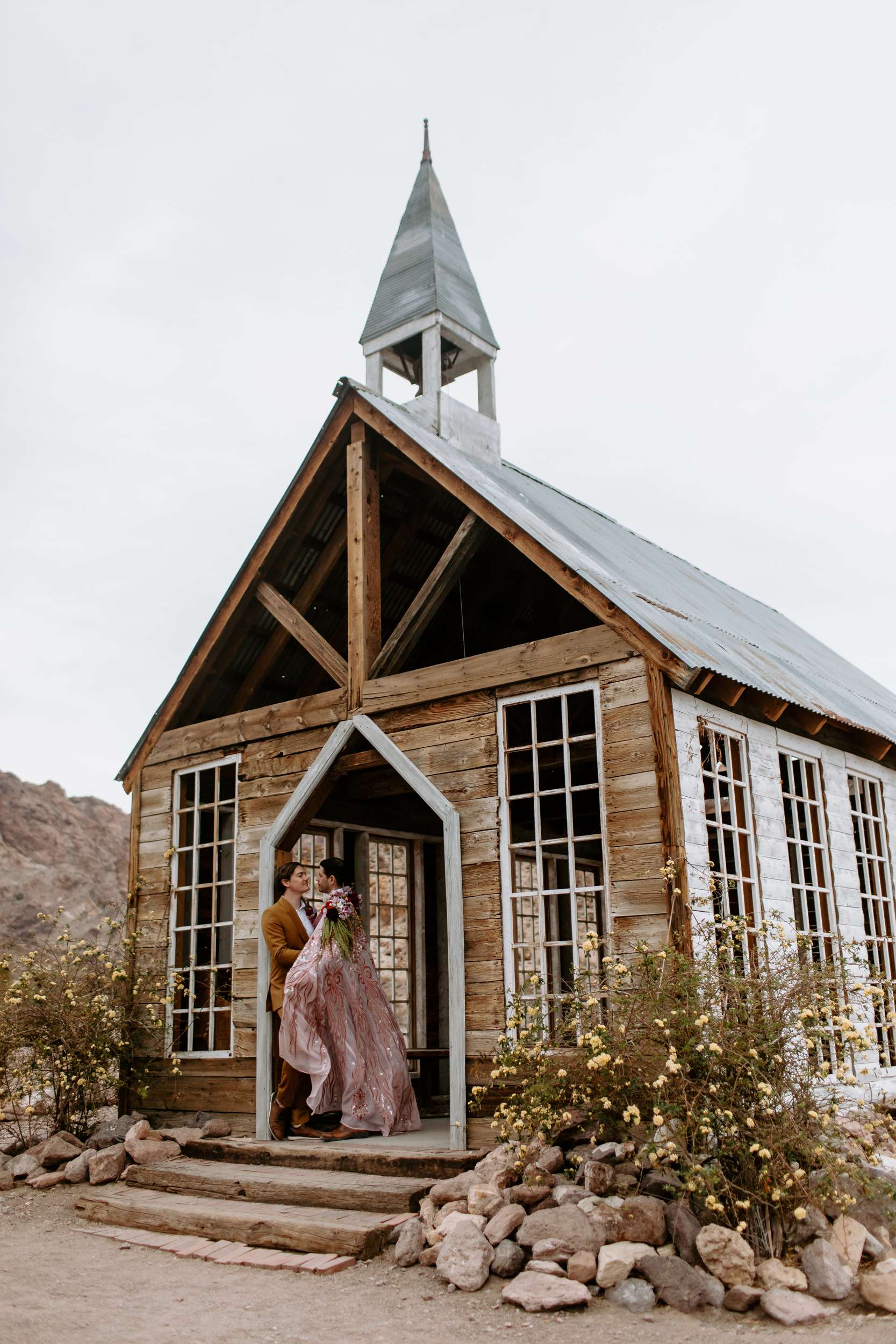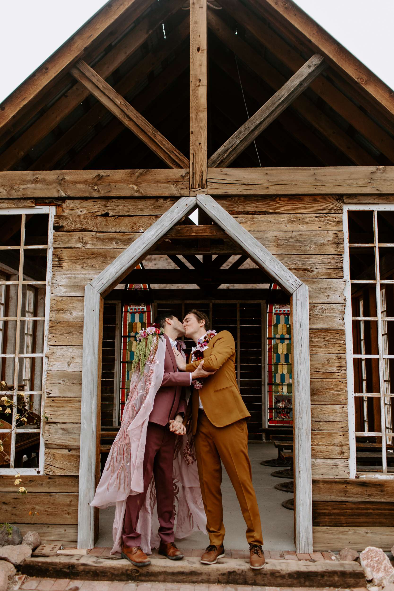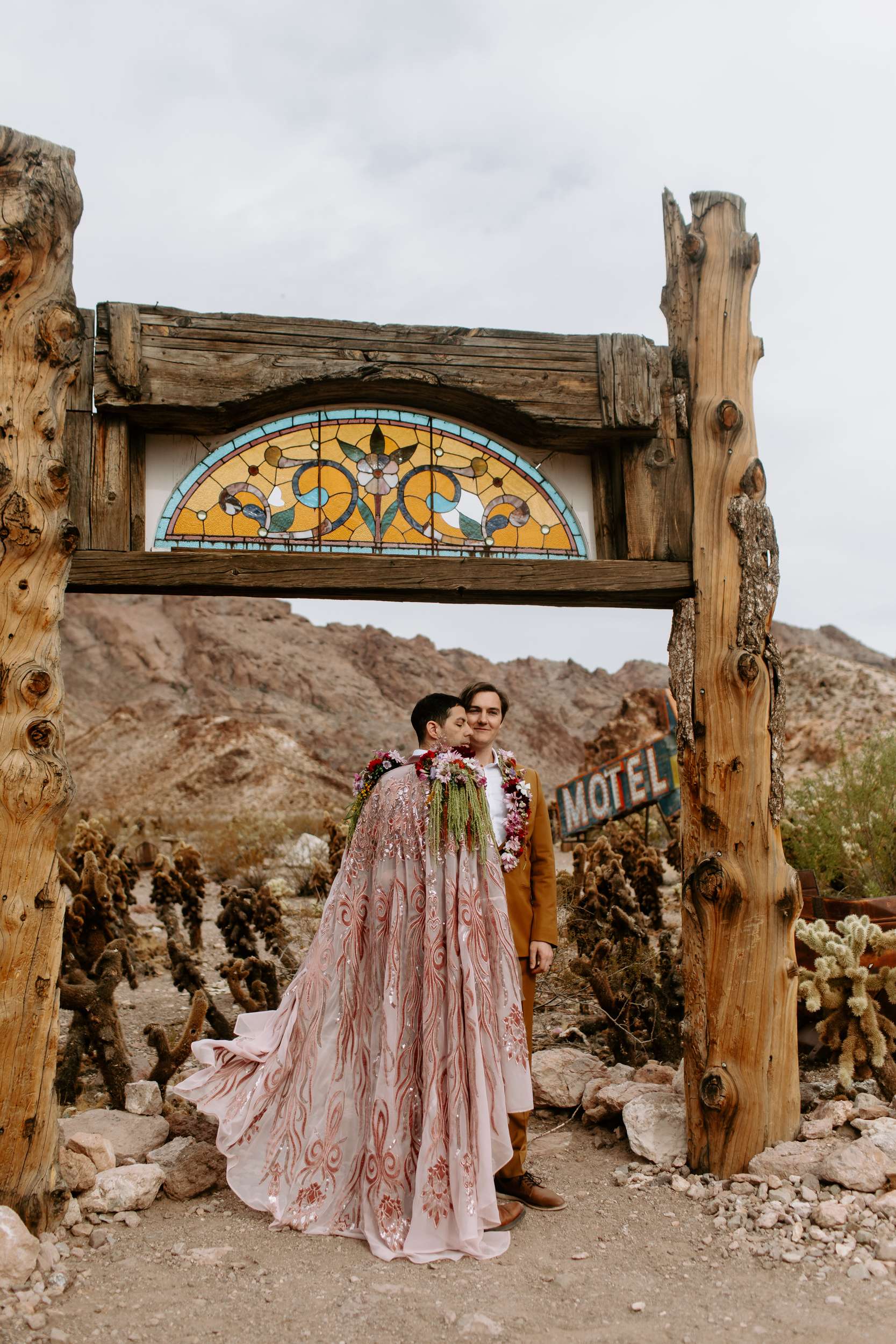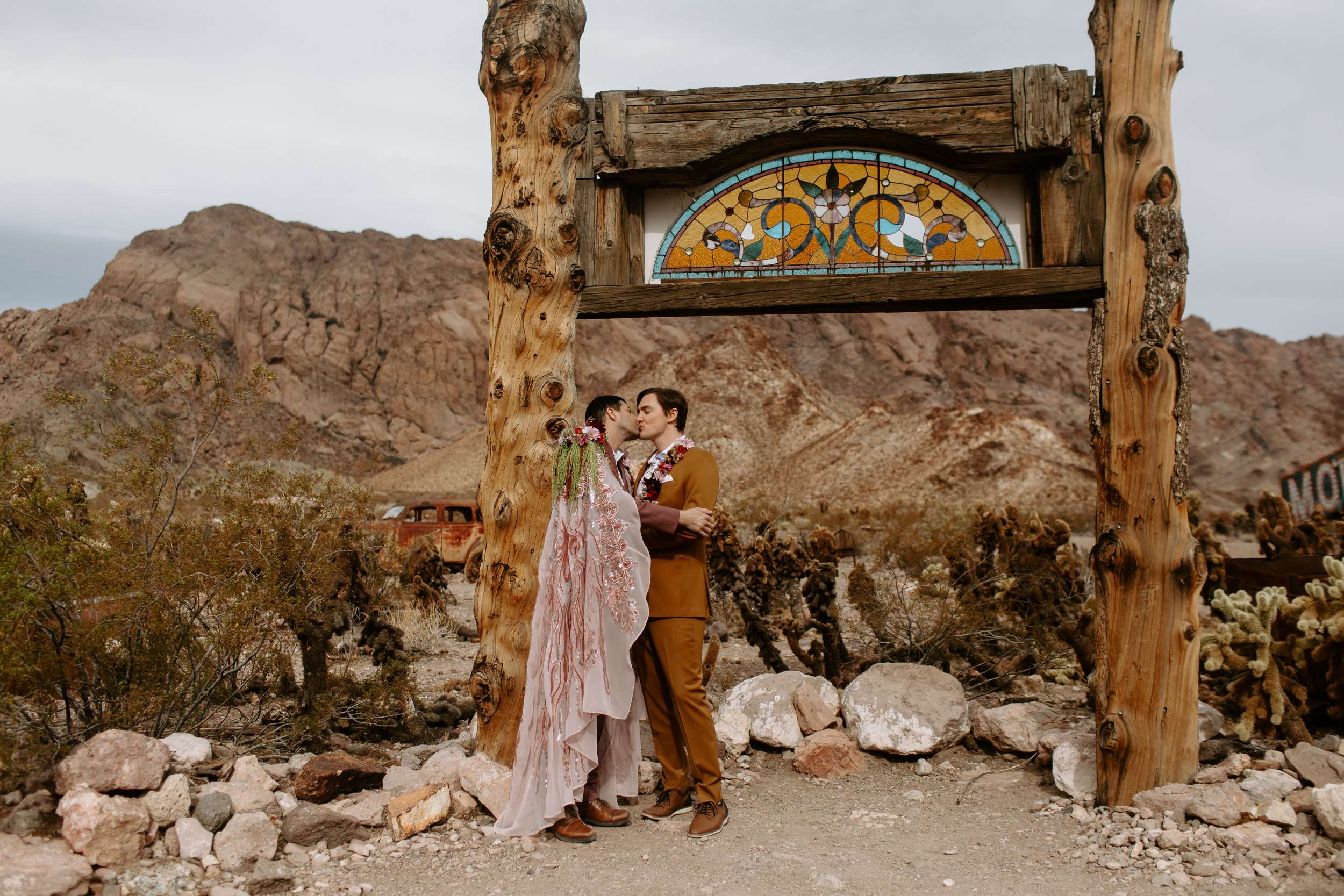 “Kyle and Alex turned an early morning in the ghost town into a stunning fashion narrative that feels both timeless and unforgettable”, photographer Cat Dossett writes. ” I wanted to use florals in a unique way paired with the colourful suits, and once we came up with the shoulder pads, the cape felt like a perfect pairing. It came together so naturally after we found the fabric, reminiscent of The Flamingo in nearby downtown Las Vegas. Each piece was cut out individually to create that cape and it adds the perfect flair, swirling amongst the cacti and dust. Alex and Kyle also read short sweet vows in a handmade notebook, paired with an invite that replicated some of the stained glass found in the ghost town.”