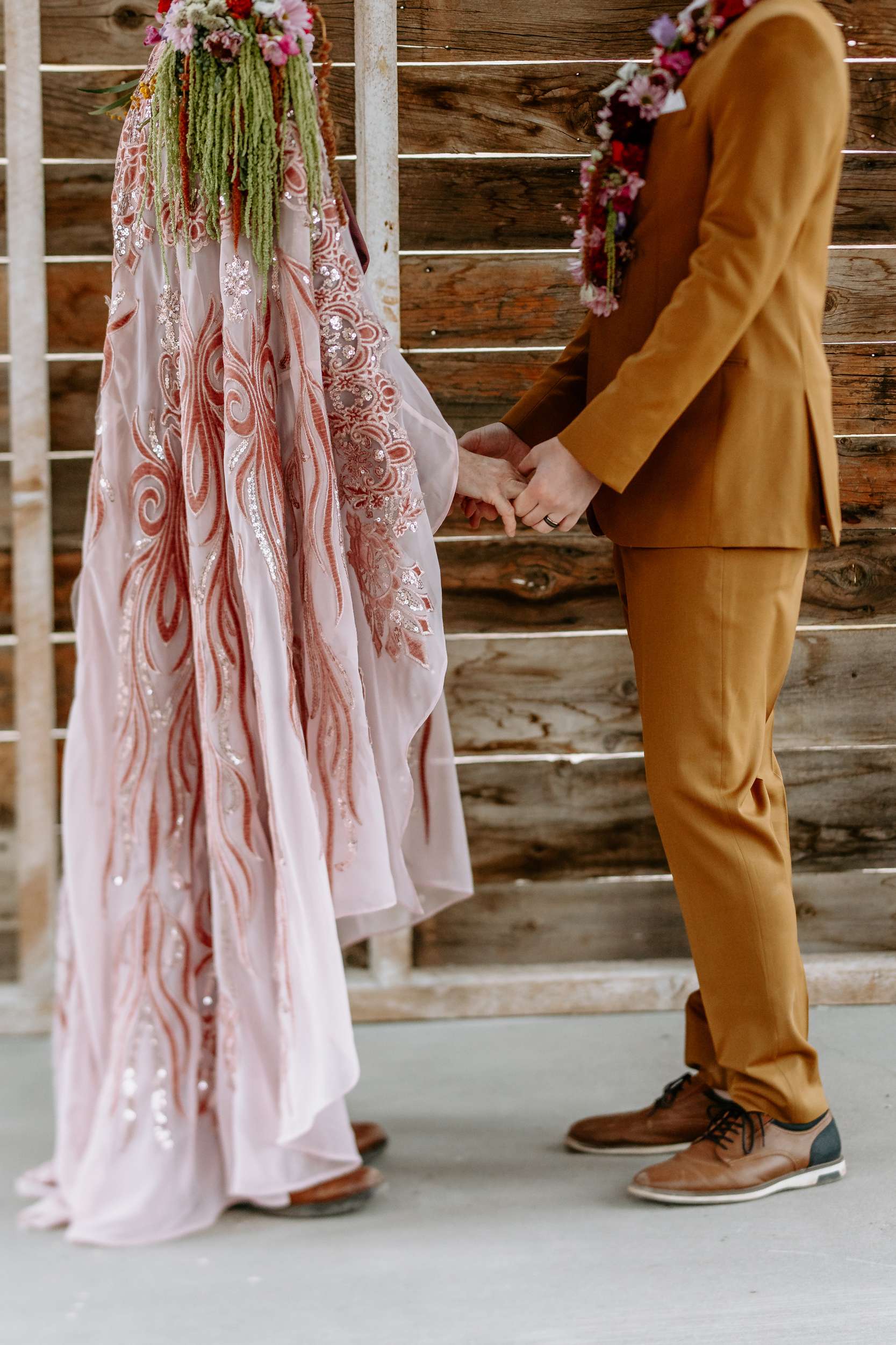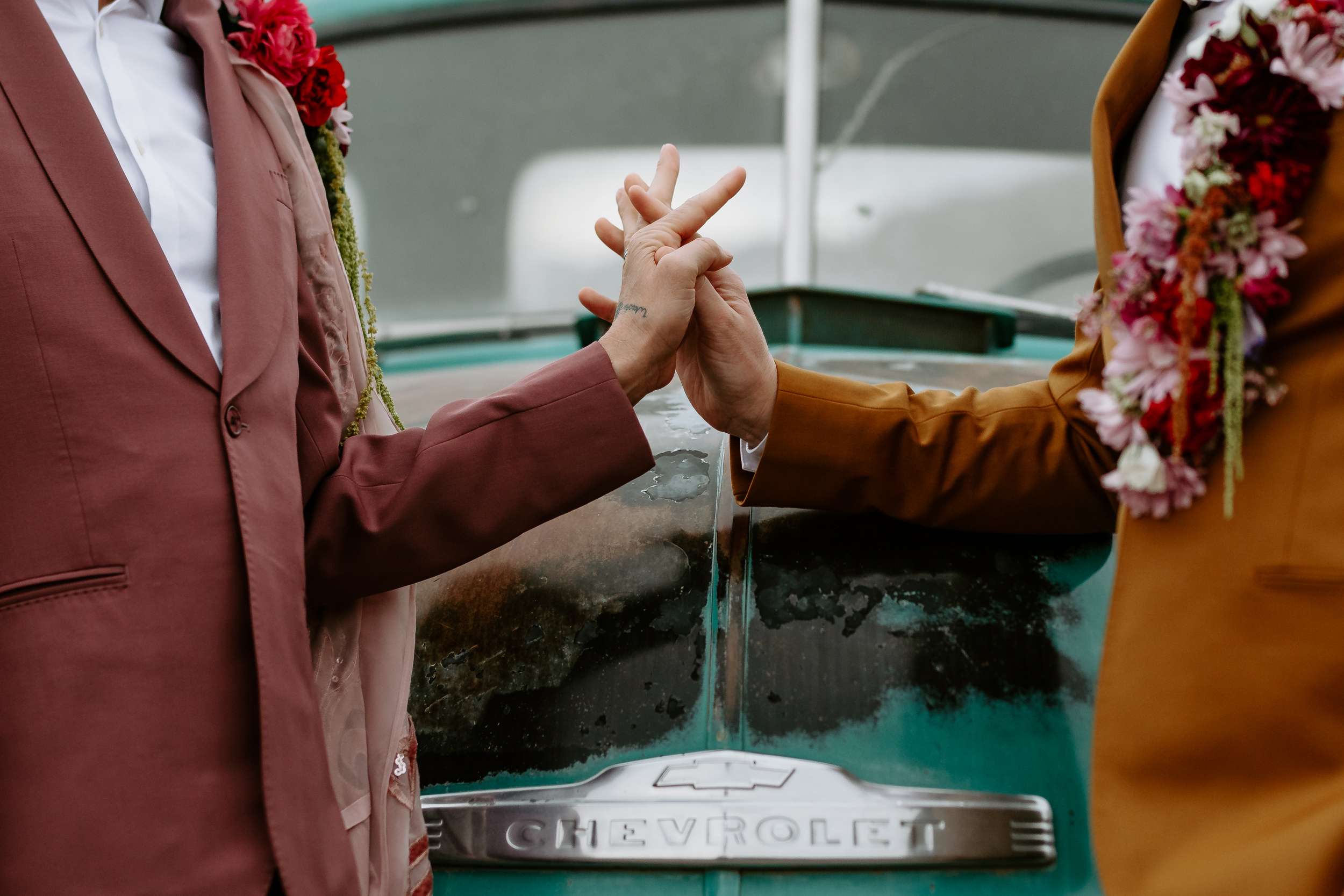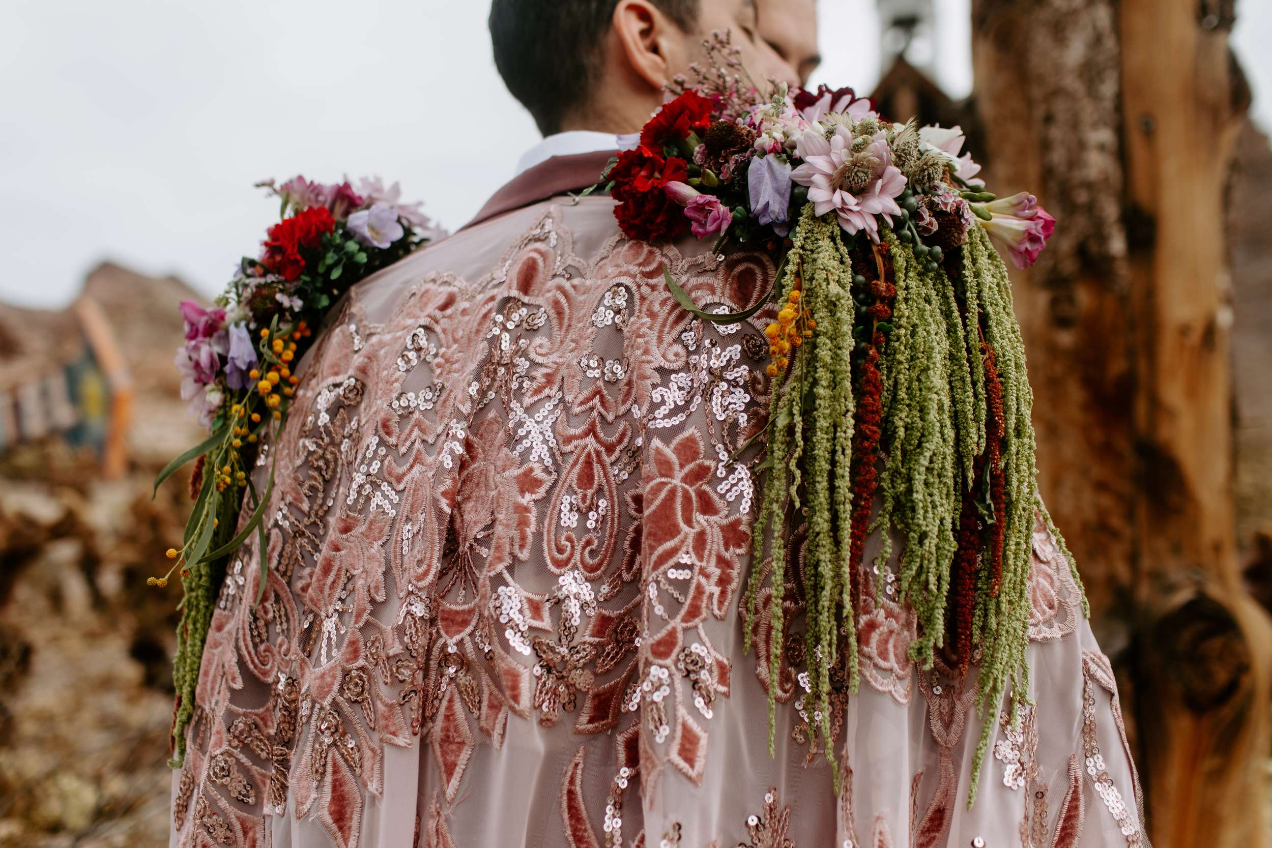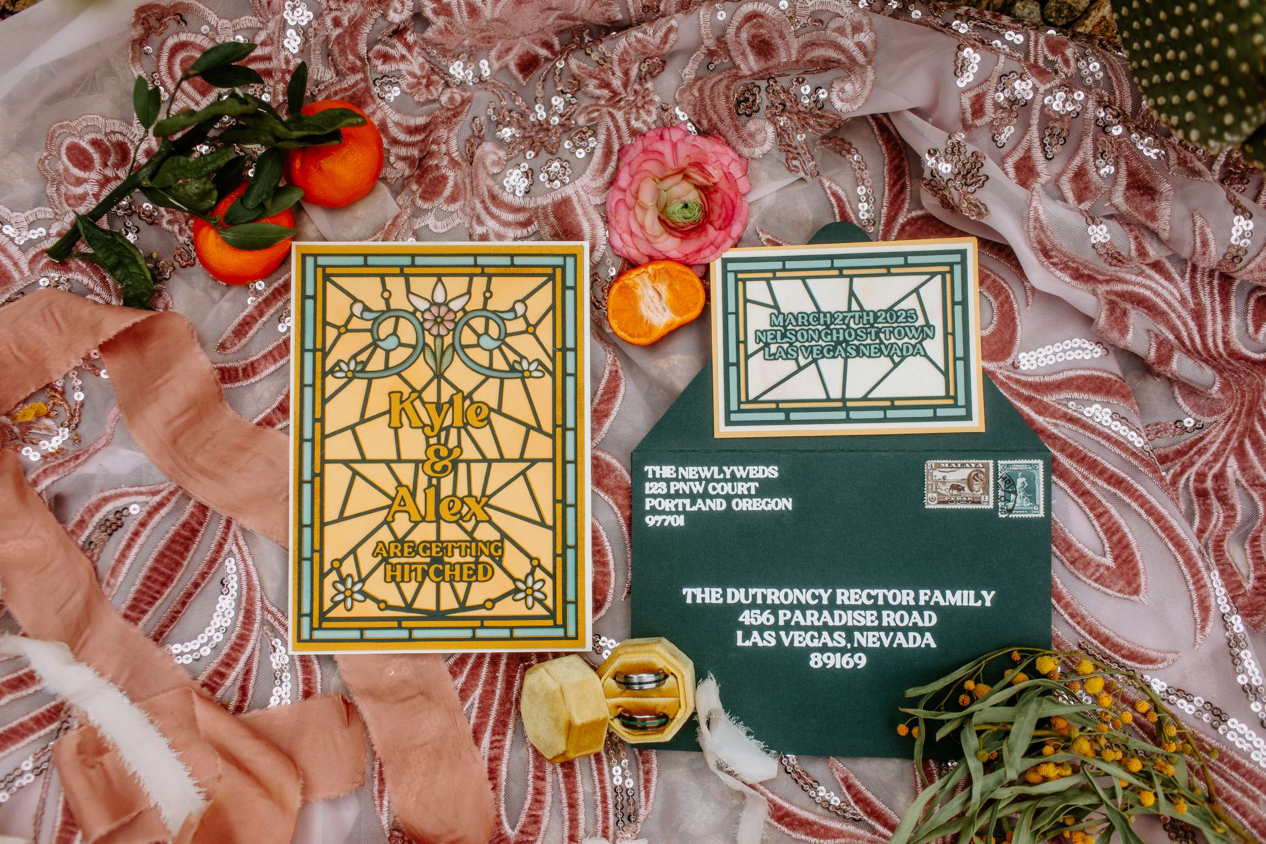 “Kyle and Alex turned an early morning in the ghost town into a stunning fashion narrative that feels both timeless and unforgettable”, photographer Cat Dossett writes. ” I wanted to use florals in a unique way paired with the colourful suits, and once we came up with the shoulder pads, the cape felt like a perfect pairing. It came together so naturally after we found the fabric, reminiscent of The Flamingo in nearby downtown Las Vegas. Each piece was cut out individually to create that cape and it adds the perfect flair, swirling amongst the cacti and dust. Alex and Kyle also read short sweet vows in a handmade notebook, paired with an invite that replicated some of the stained glass found in the ghost town.”