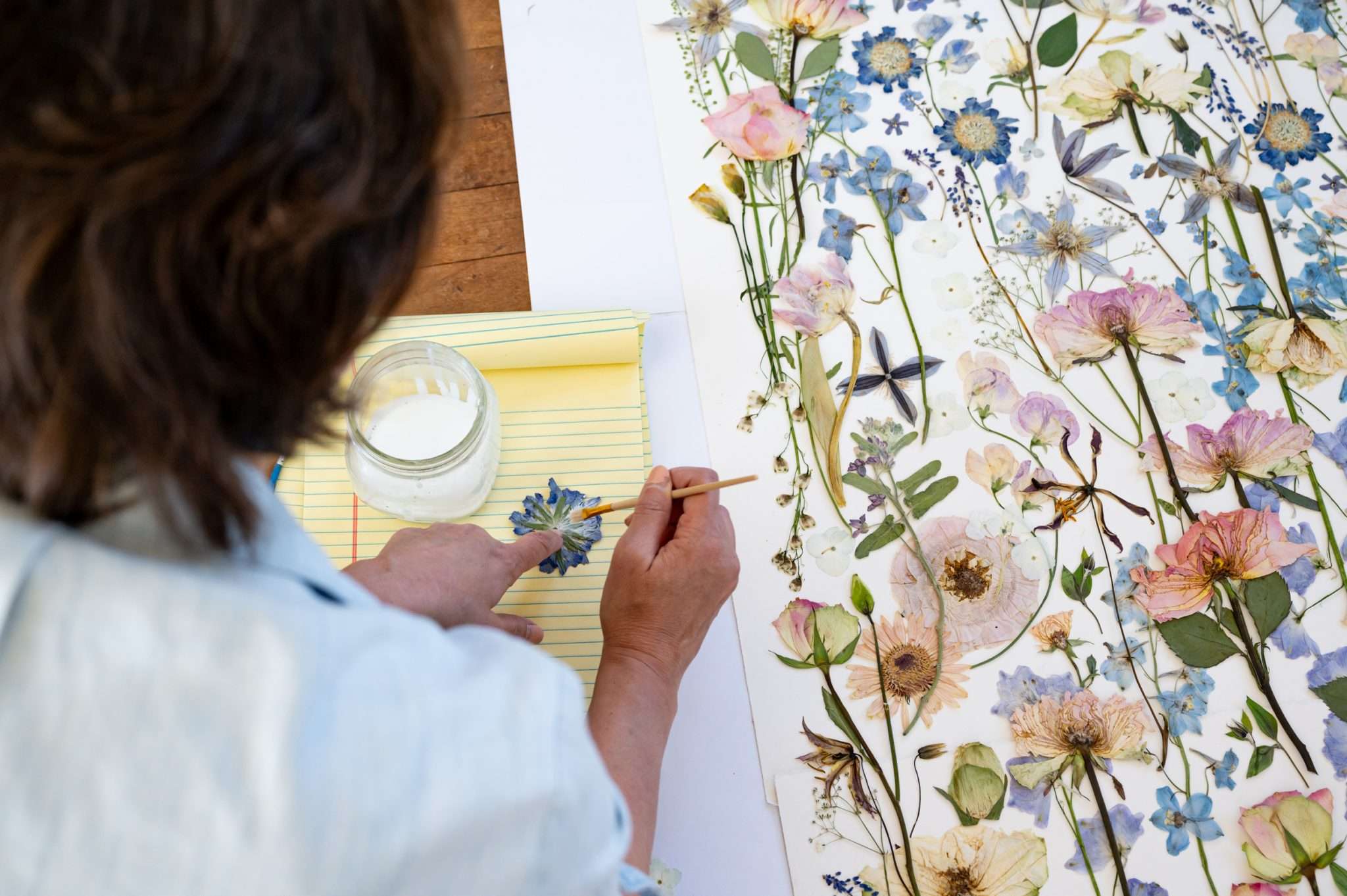 Once you have your collection of pressed flowers ready for art, now is the time to practice gluing. Gluing is its own craft, delicate and final. Use imperfect blooms, grab some paper, and give yourself the freedom of low-stakes practice.