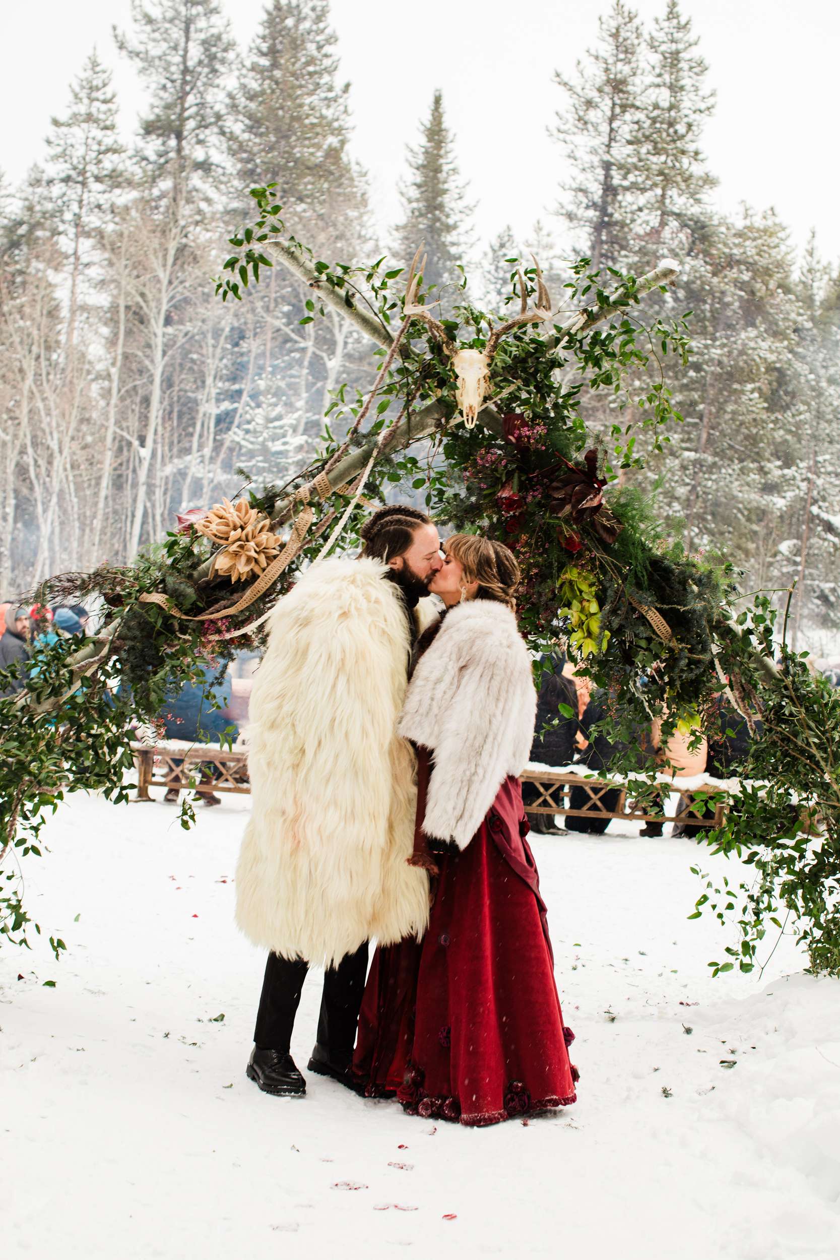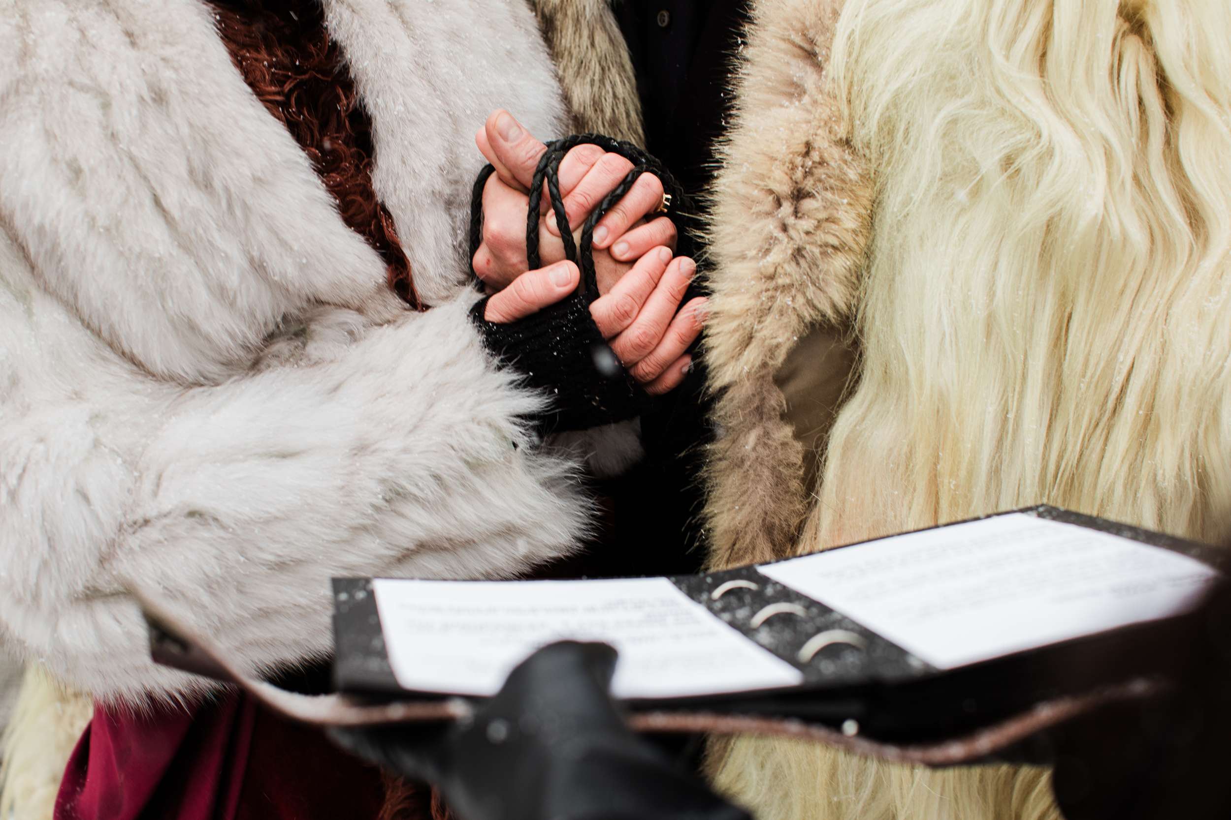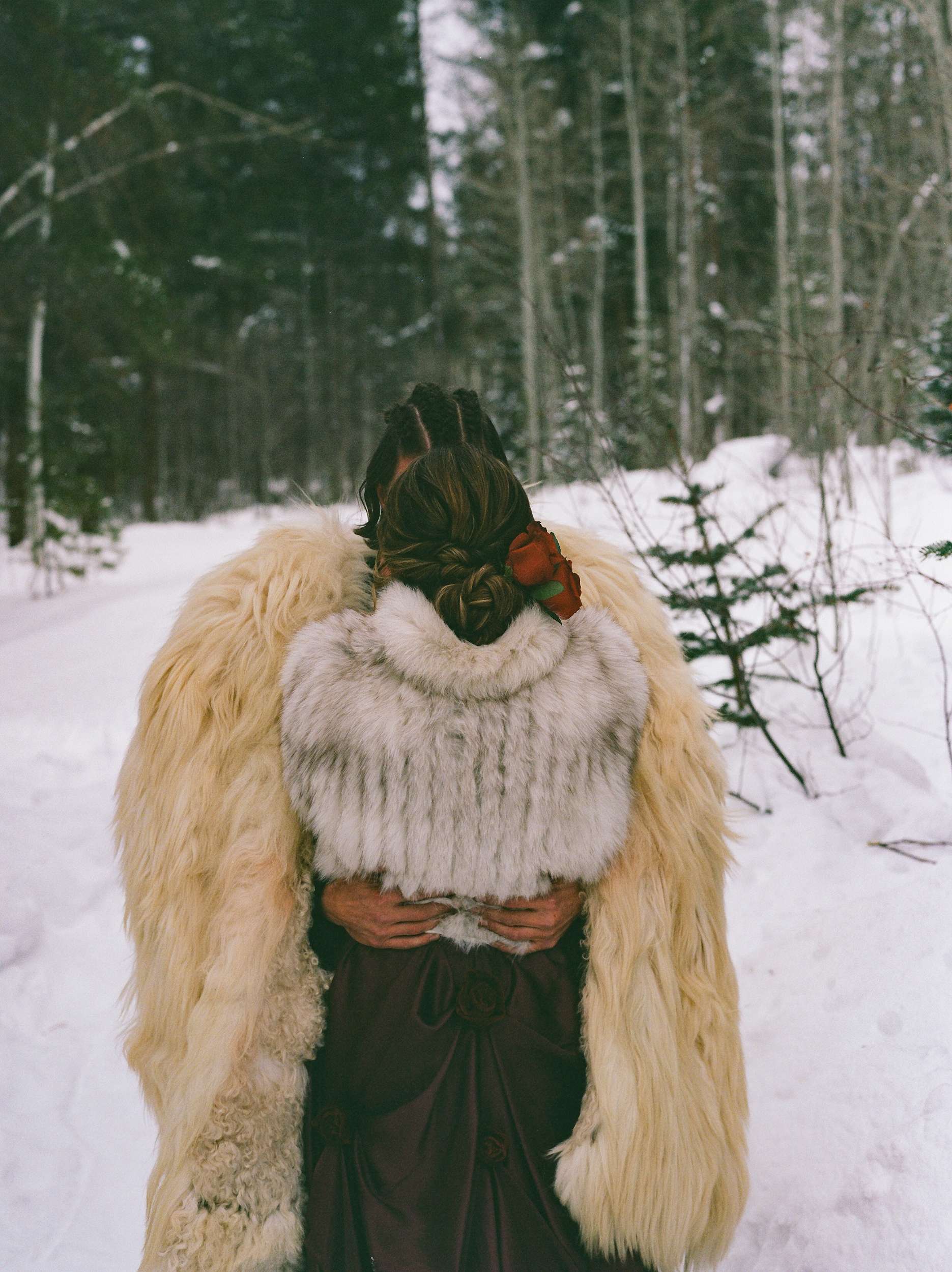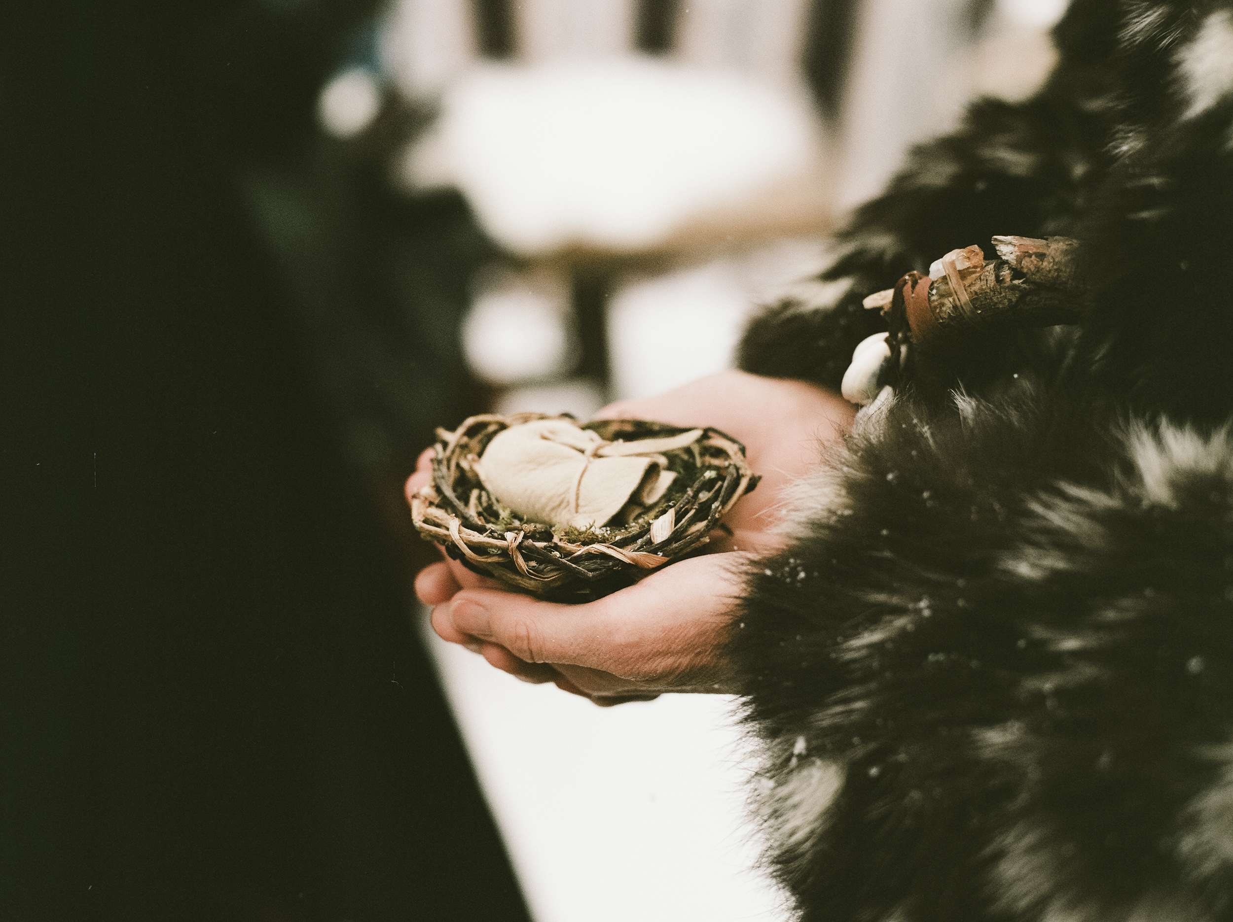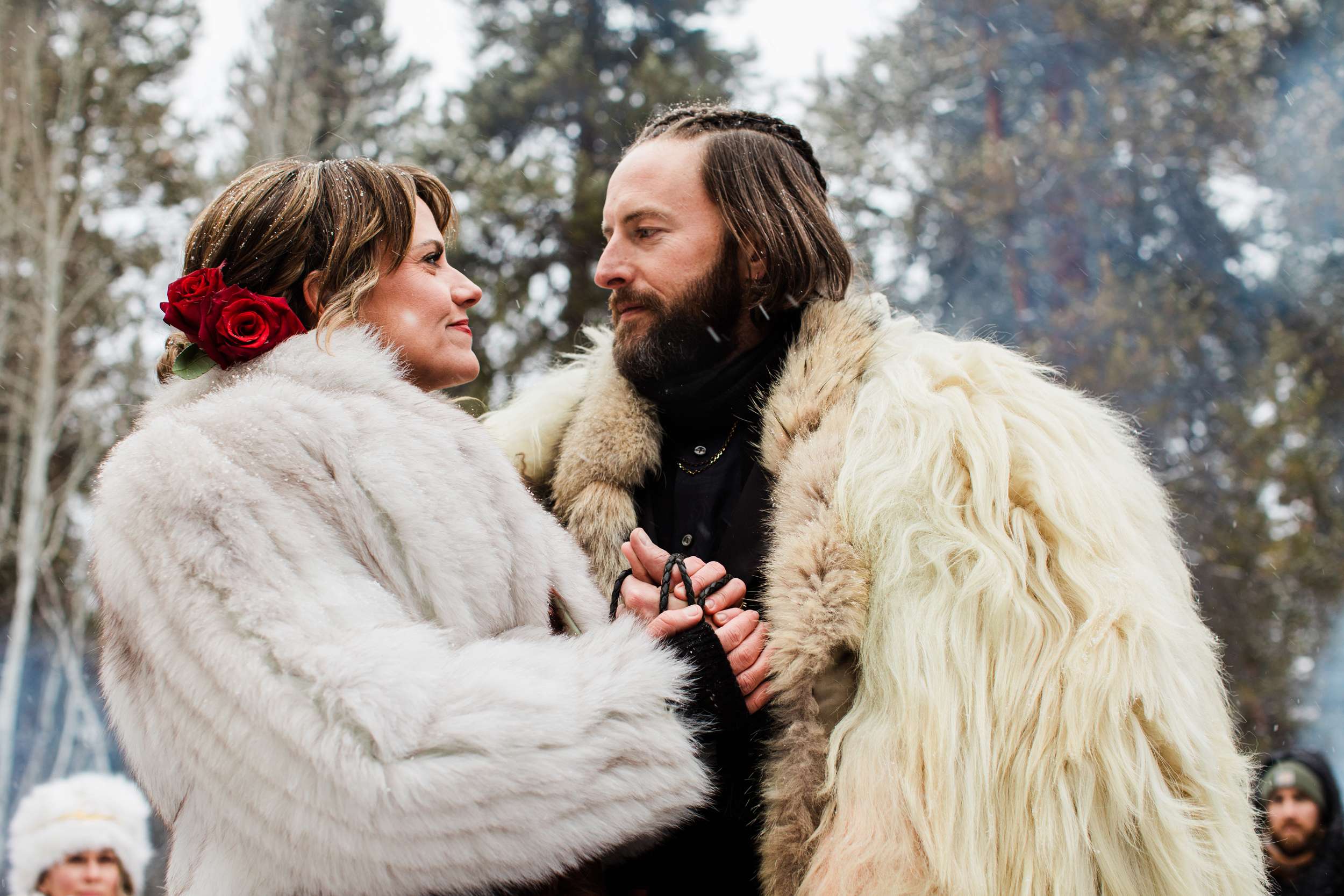 Their ceremony attire was, of course, thoughtfully chosen. Ginny’s intention was to walk with the energy of the rose, and her custom-made dress included a rich red velvet skirt dripping in roses. She also had roses in her hair for softness, earrings made of bone for strength, and a vintage fox-fur coat that brought in one of her closest animal allies. Jesse wore a giant sheepskin cape made by hand in Romania and braids in his hair, evoking his Viking essence.