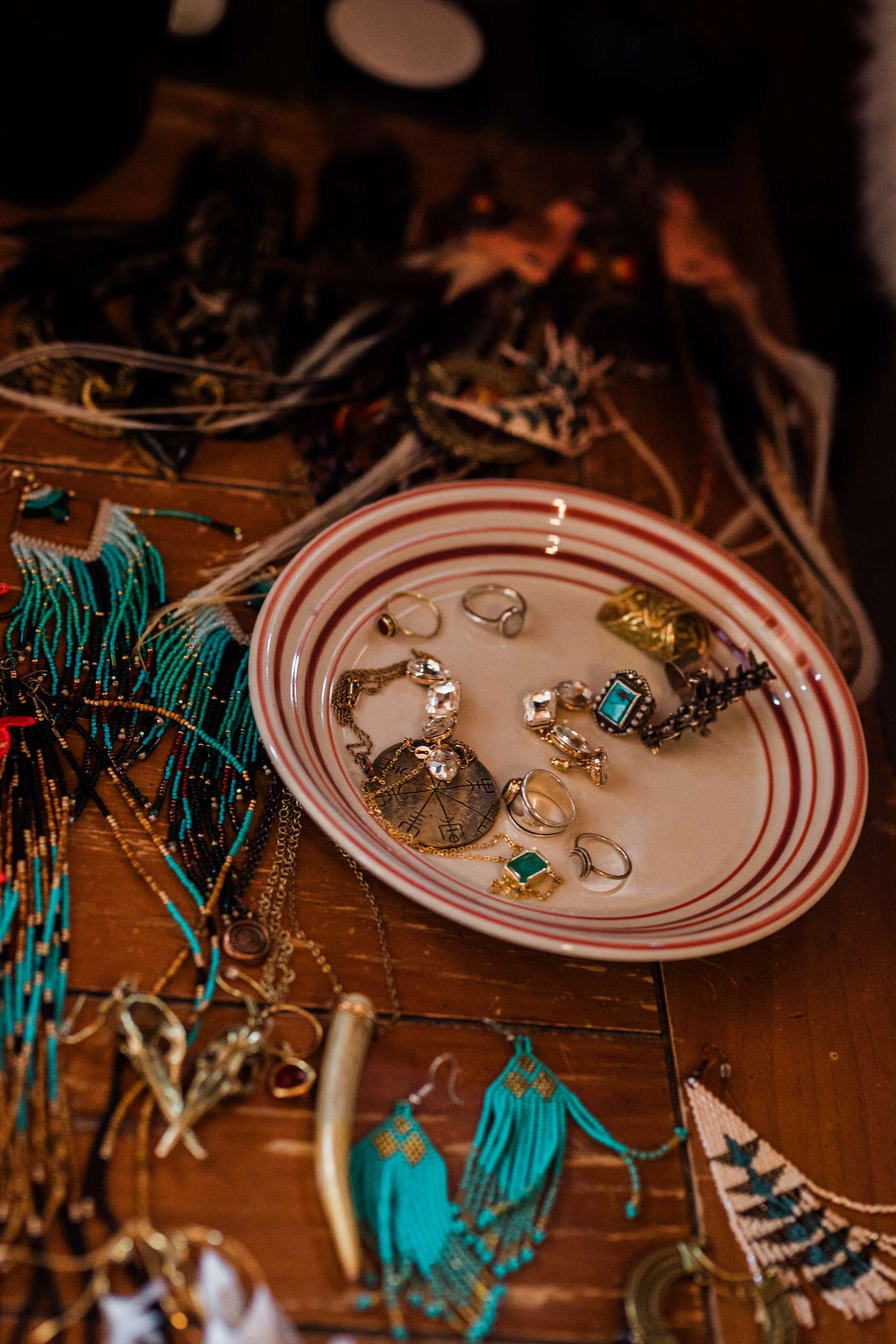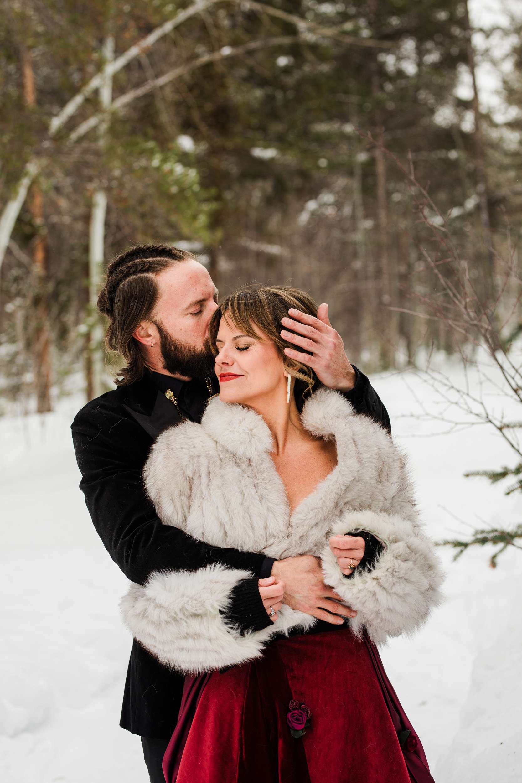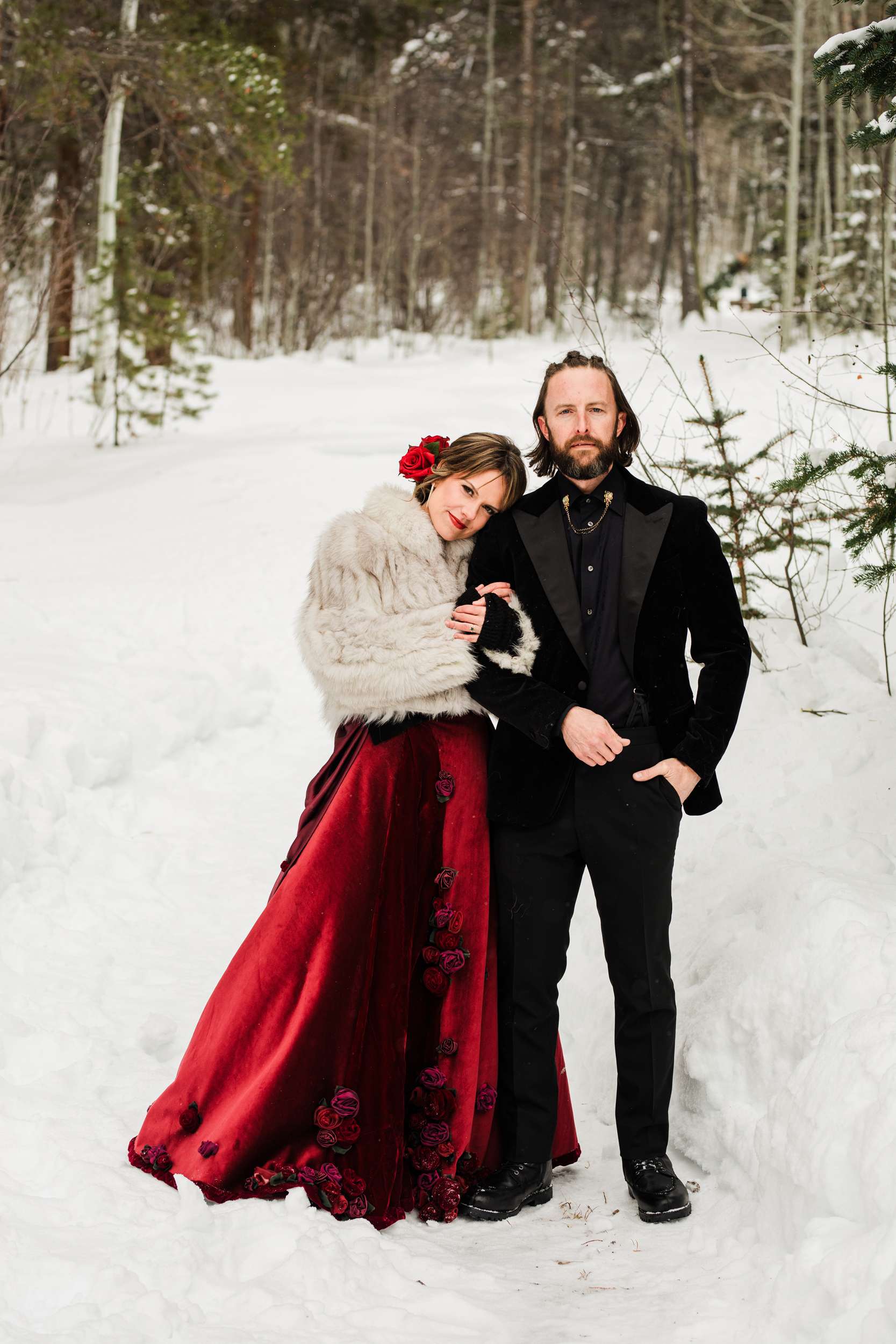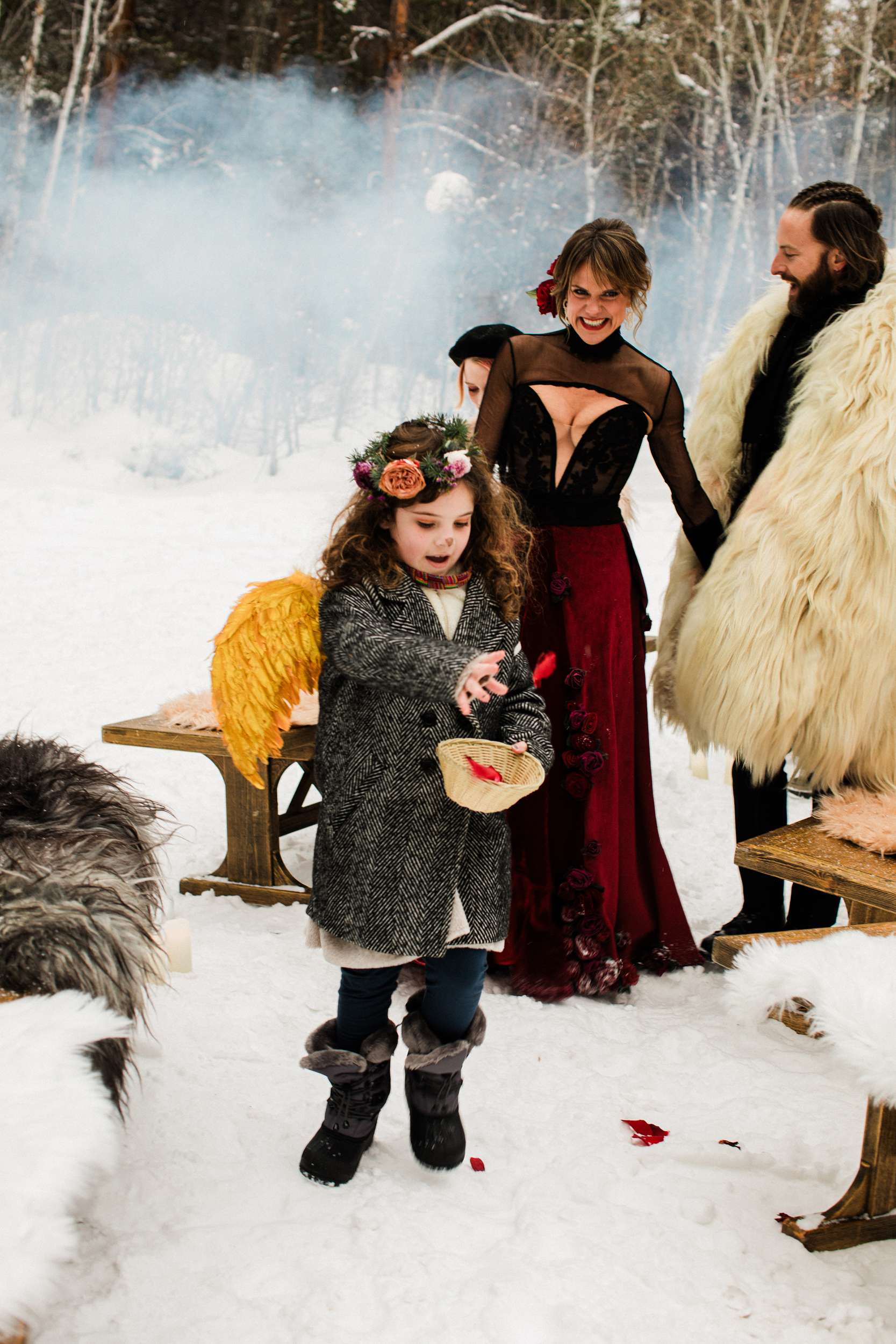 Their ceremony attire was, of course, thoughtfully chosen. Ginny’s intention was to walk with the energy of the rose, and her custom-made dress included a rich red velvet skirt dripping in roses. She also had roses in her hair for softness, earrings made of bone for strength, and a vintage fox-fur coat that brought in one of her closest animal allies. Jesse wore a giant sheepskin cape made by hand in Romania and braids in his hair, evoking his Viking essence.