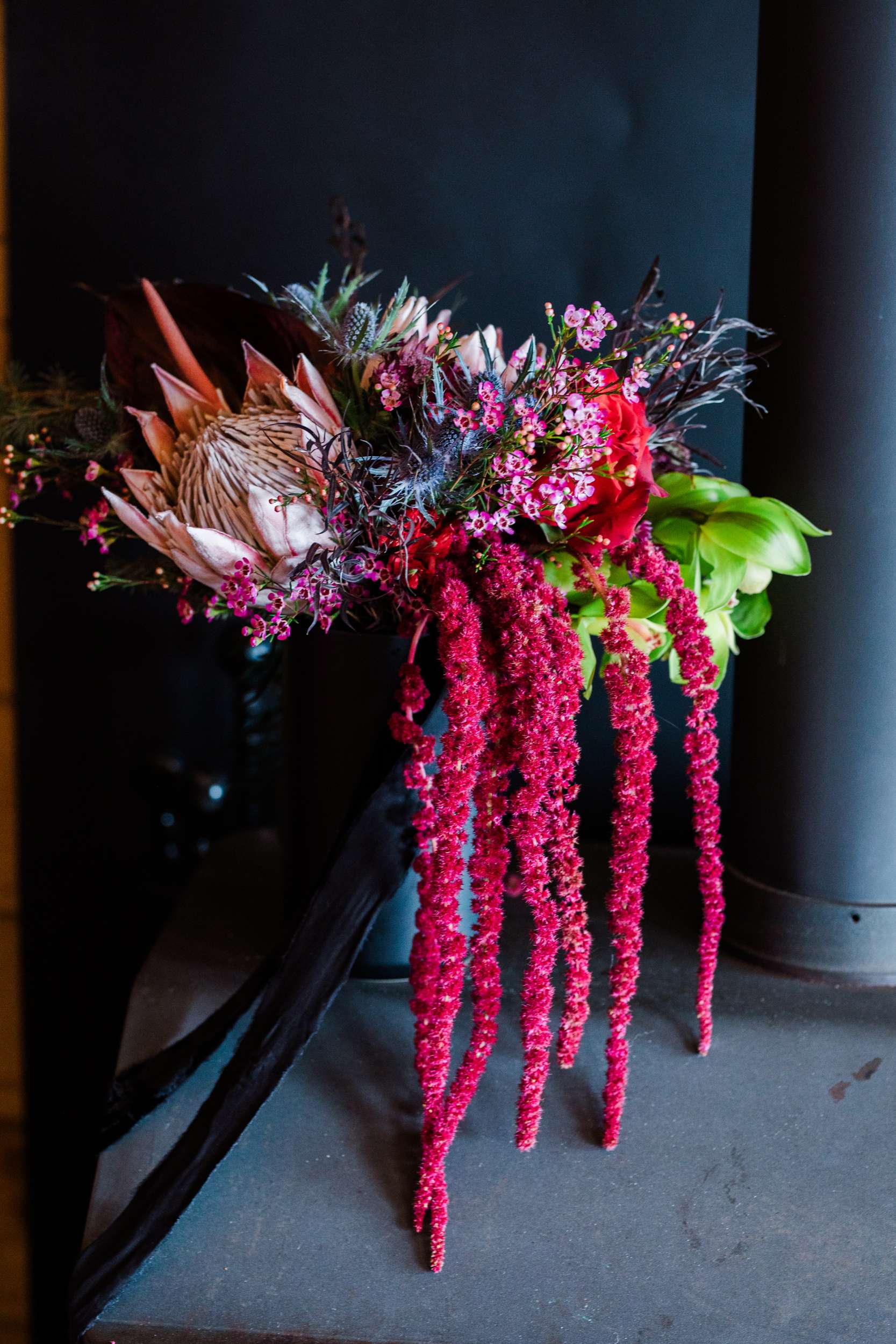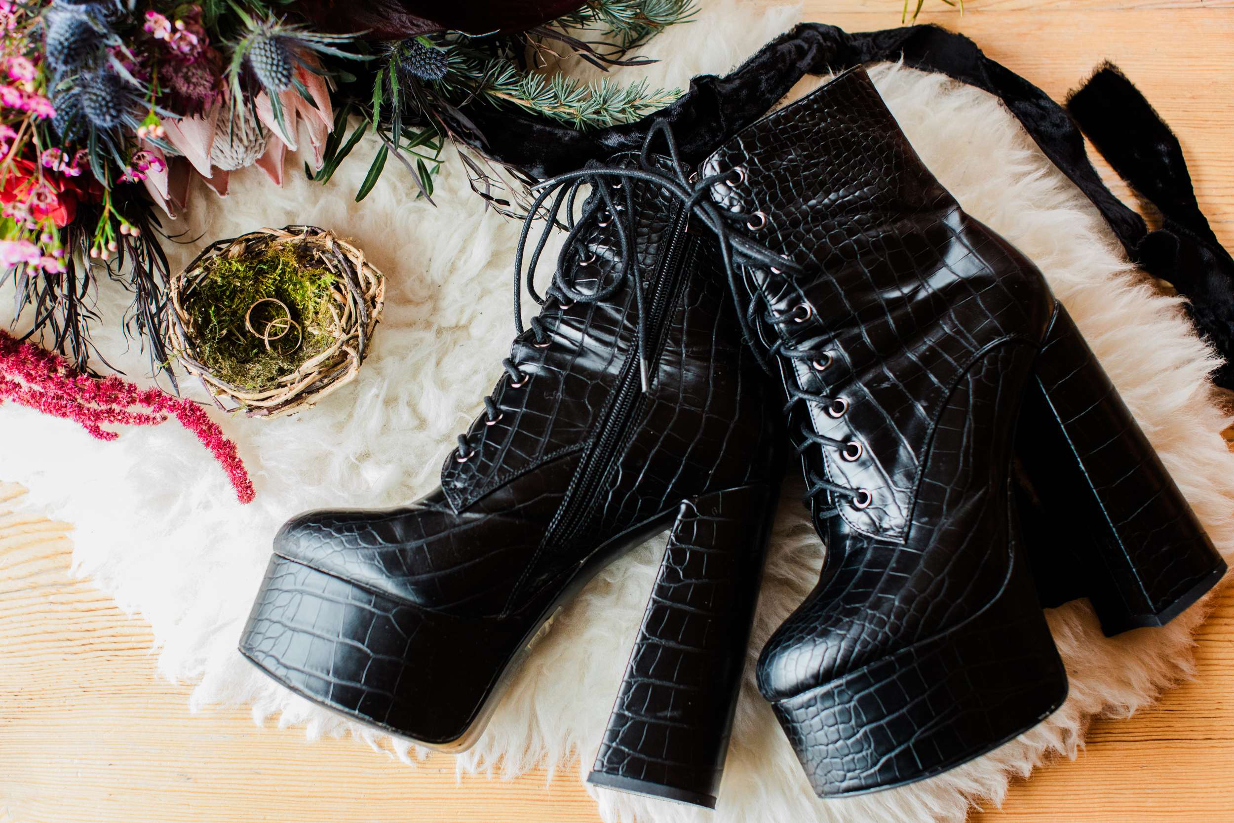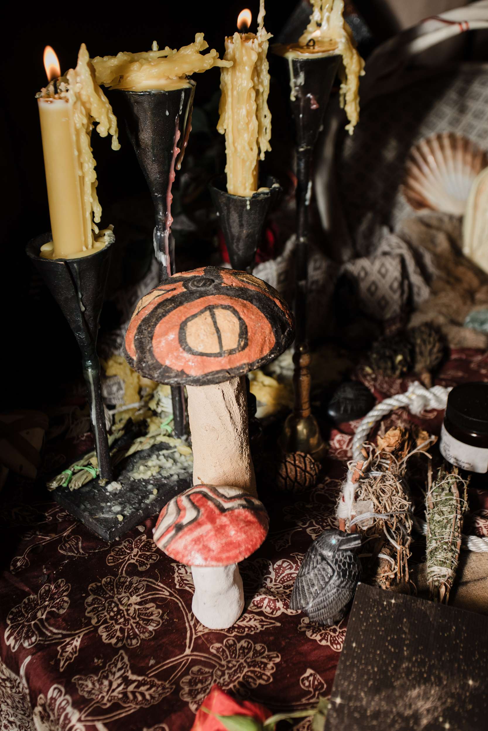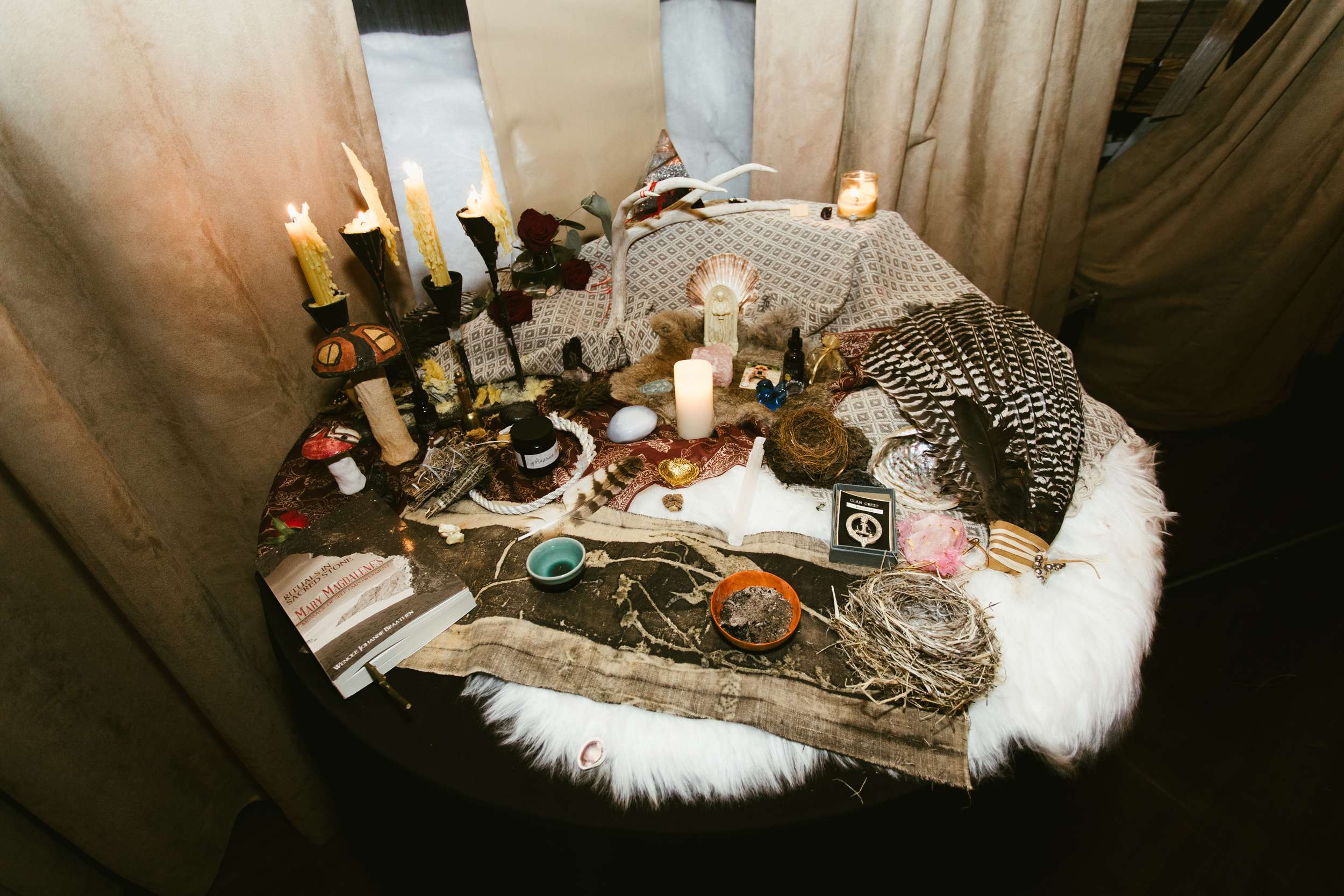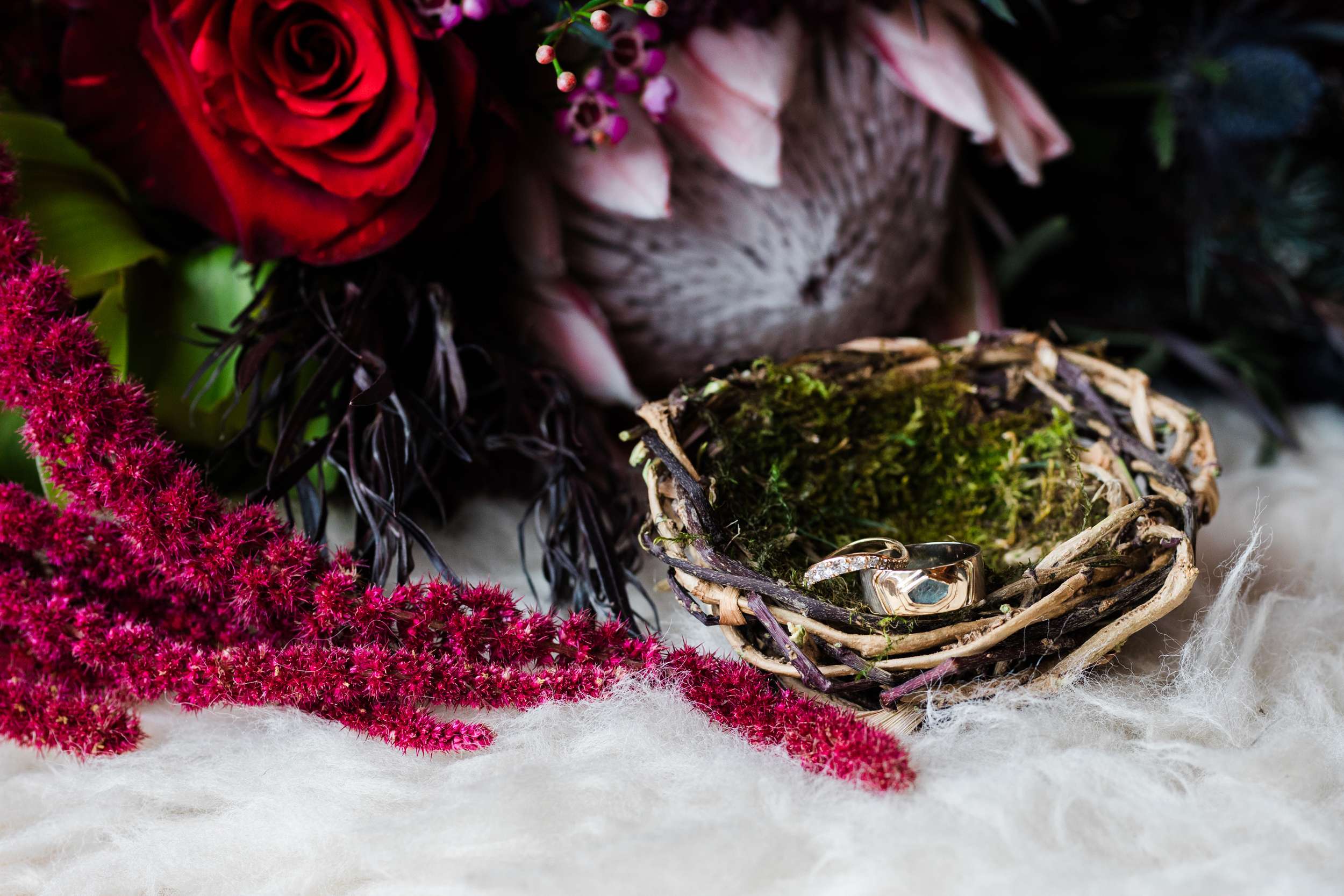Their ceremony attire was, of course, thoughtfully chosen. Ginny’s intention was to walk with the energy of the rose, and her custom-made dress included a rich red velvet skirt dripping in roses. She also had roses in her hair for softness, earrings made of bone for strength, and a vintage fox-fur coat that brought in one of her closest animal allies. Jesse wore a giant sheepskin cape made by hand in Romania and braids in his hair, evoking his Viking essence.