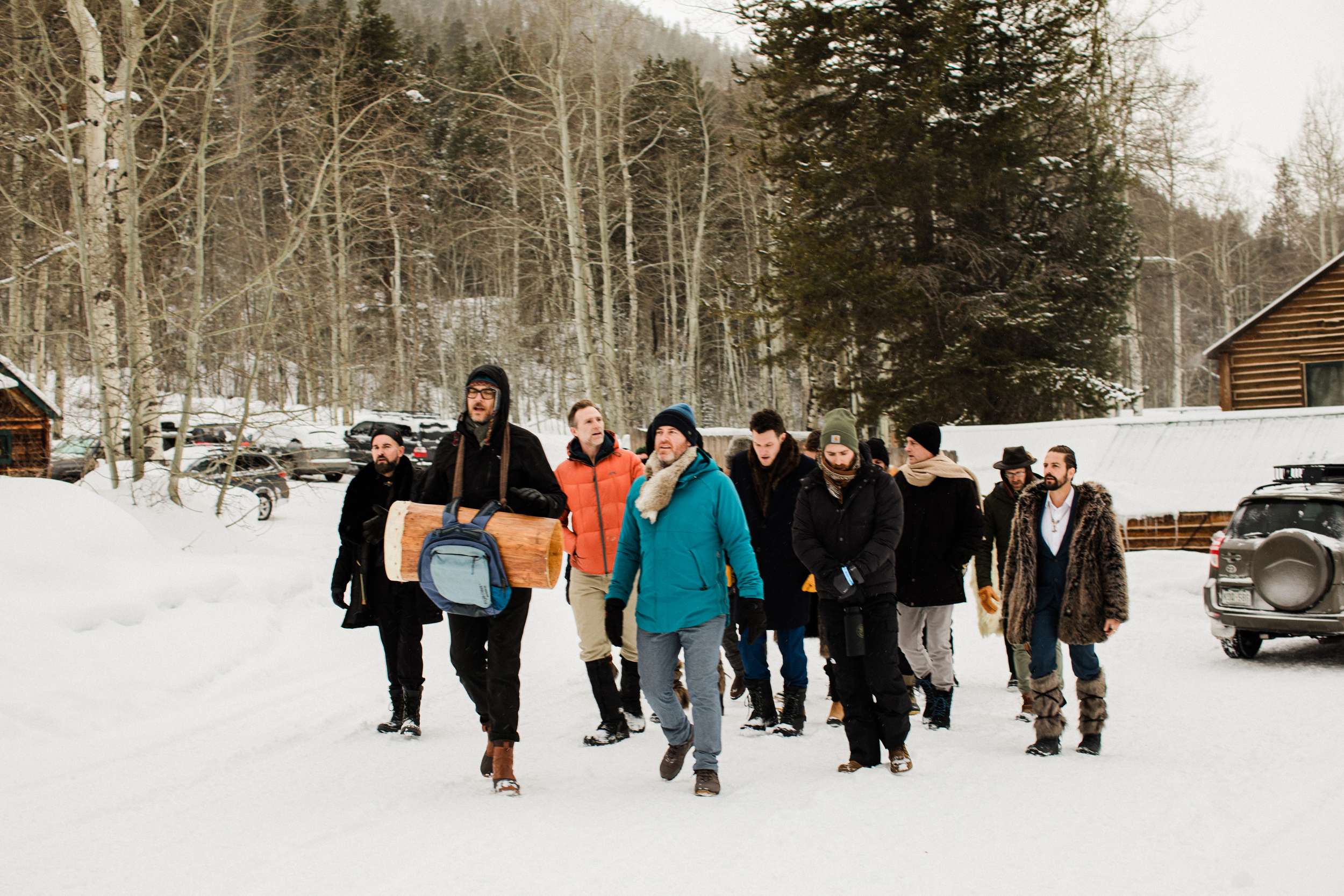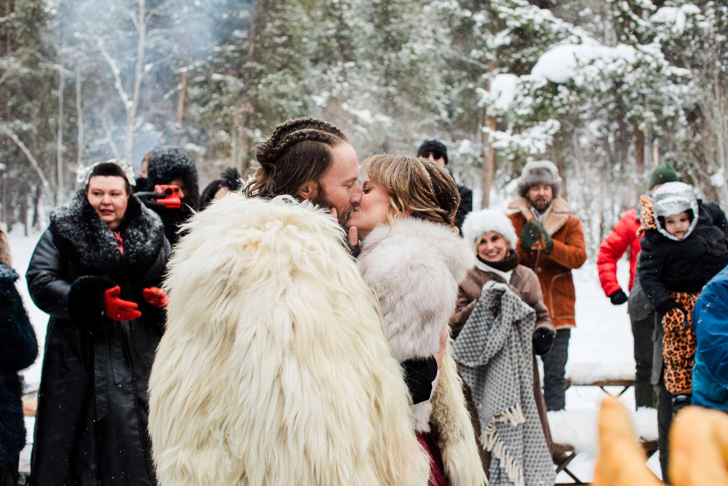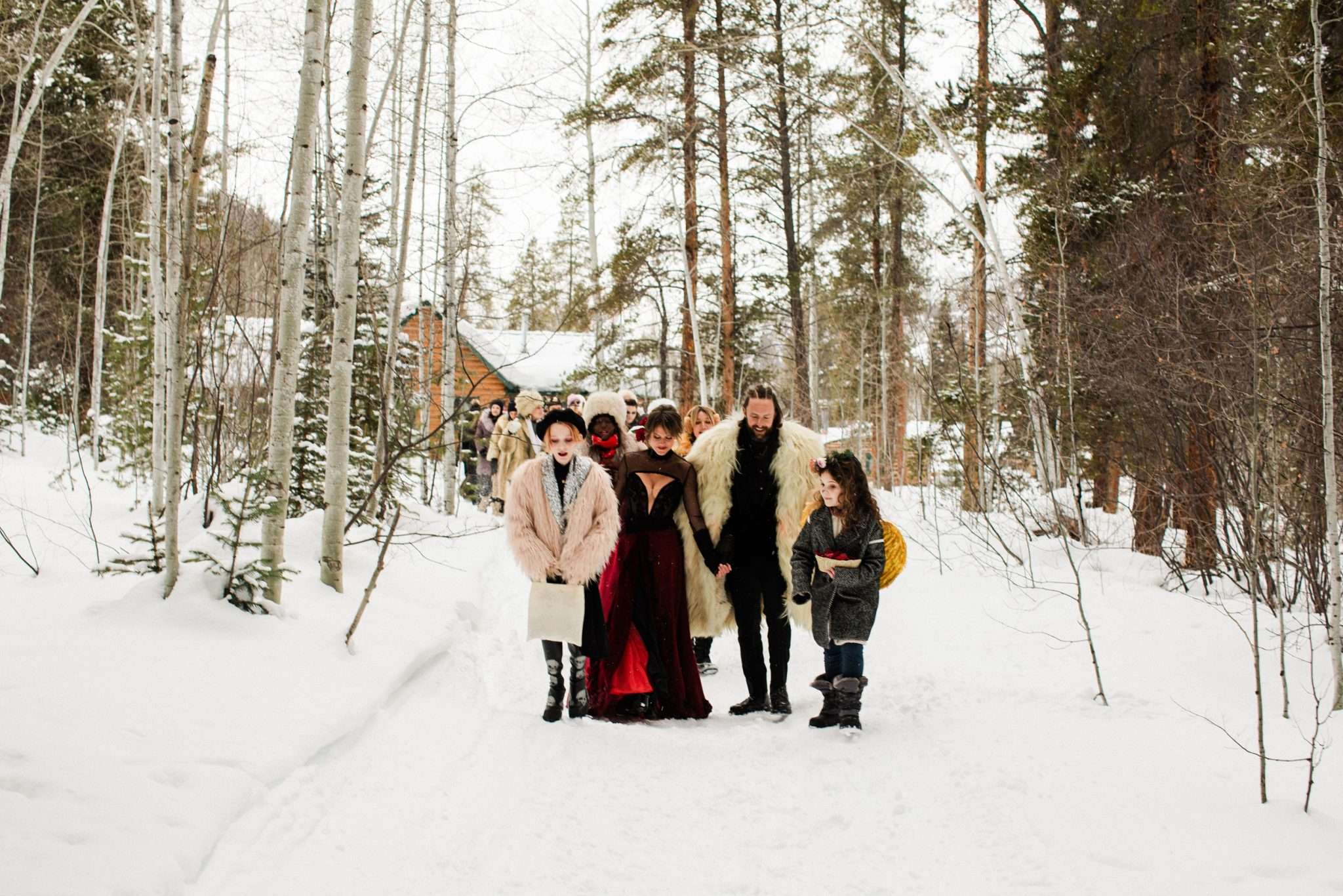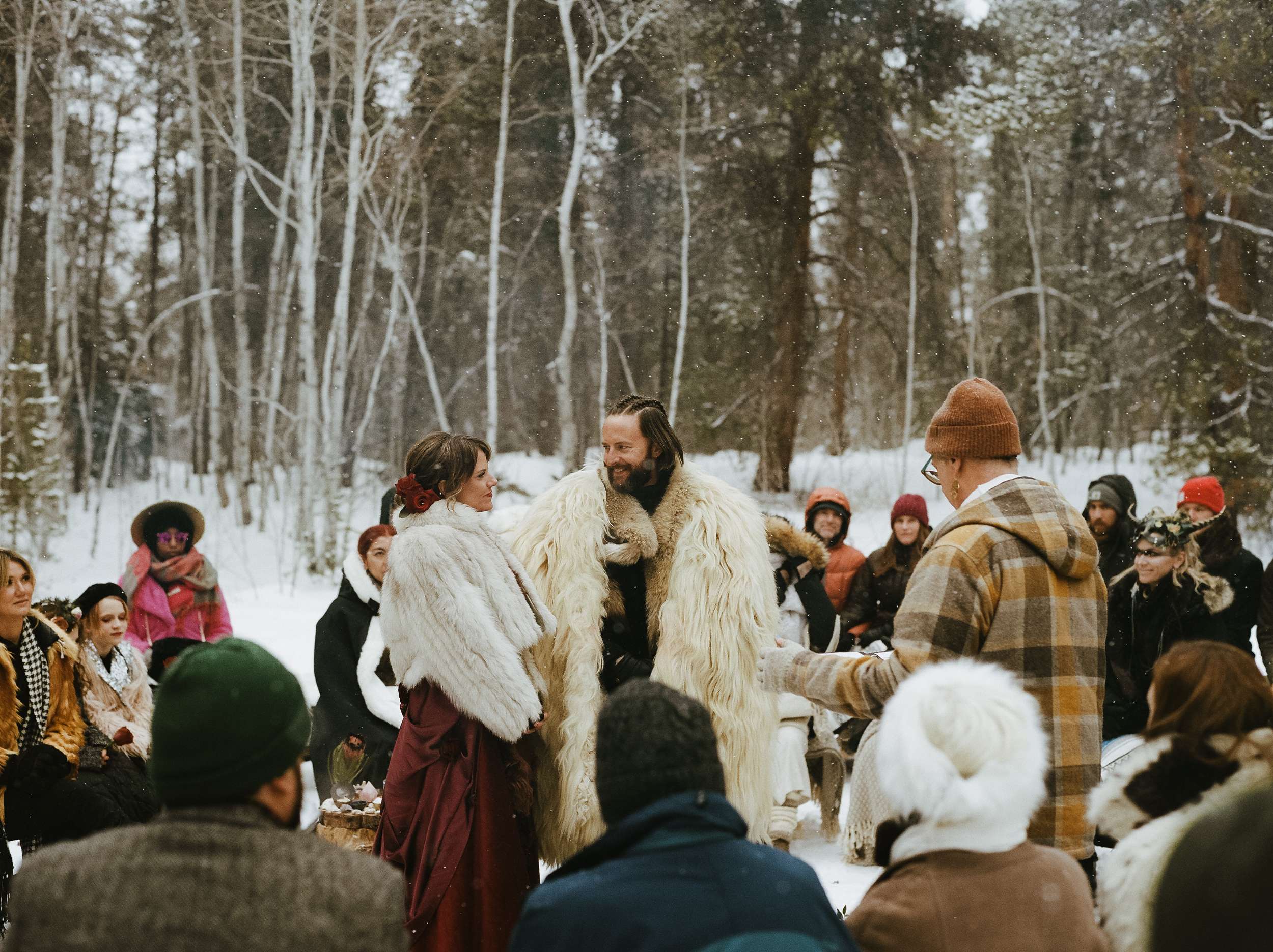 “Our processional was inspired by a dream I had one night, in which I envisioned everyone walking into the ceremony grove, singing together”, the bride continued. “Our talented friend Stevie helped realise the vision by writing a custom song, The Eye of the Rose. She taught it to everyone the night before. Before the ceremony, all the men in attendance met at the edge of the property, while the women gathered around me as I got dressed in a cabin closer to the ceremony location. The men began the procession by walking across the field, singing and drumming together, toward the women waiting to join in. I emerged from the cabin and met Jesse at the head of the procession, and then everyone walked down a snowy path through the woods into a grove of aspens and evergreens, singing together. It was magical”