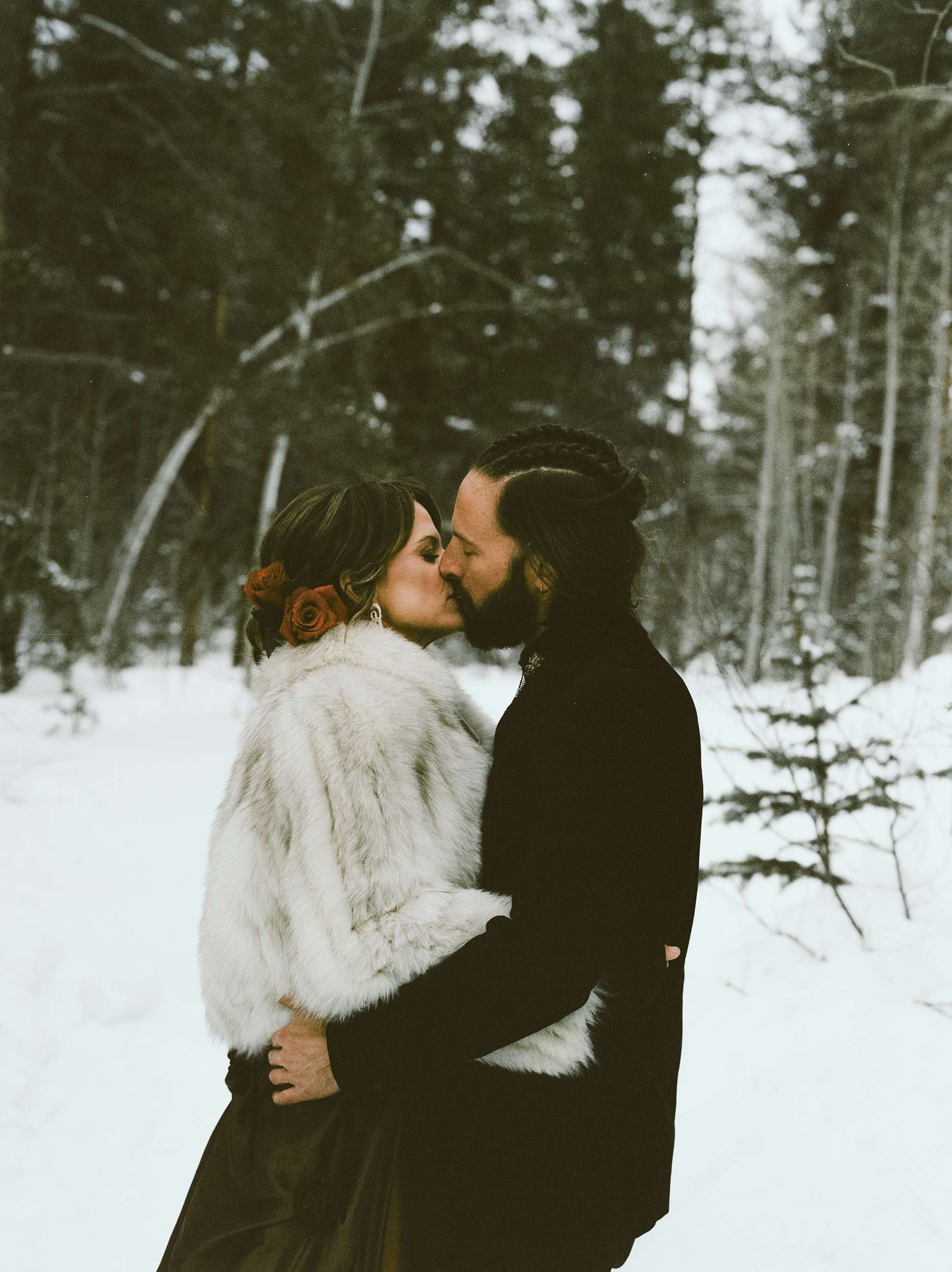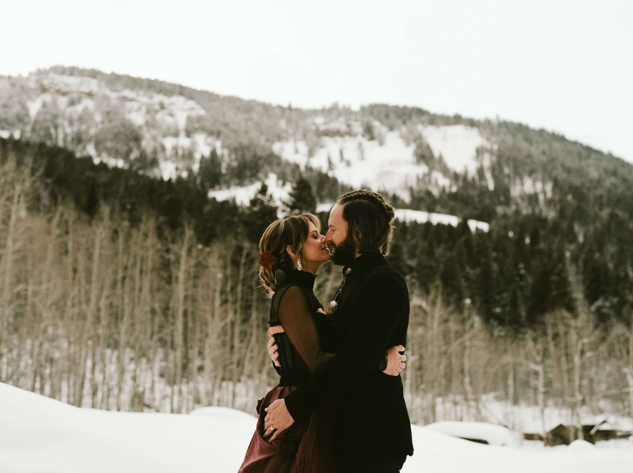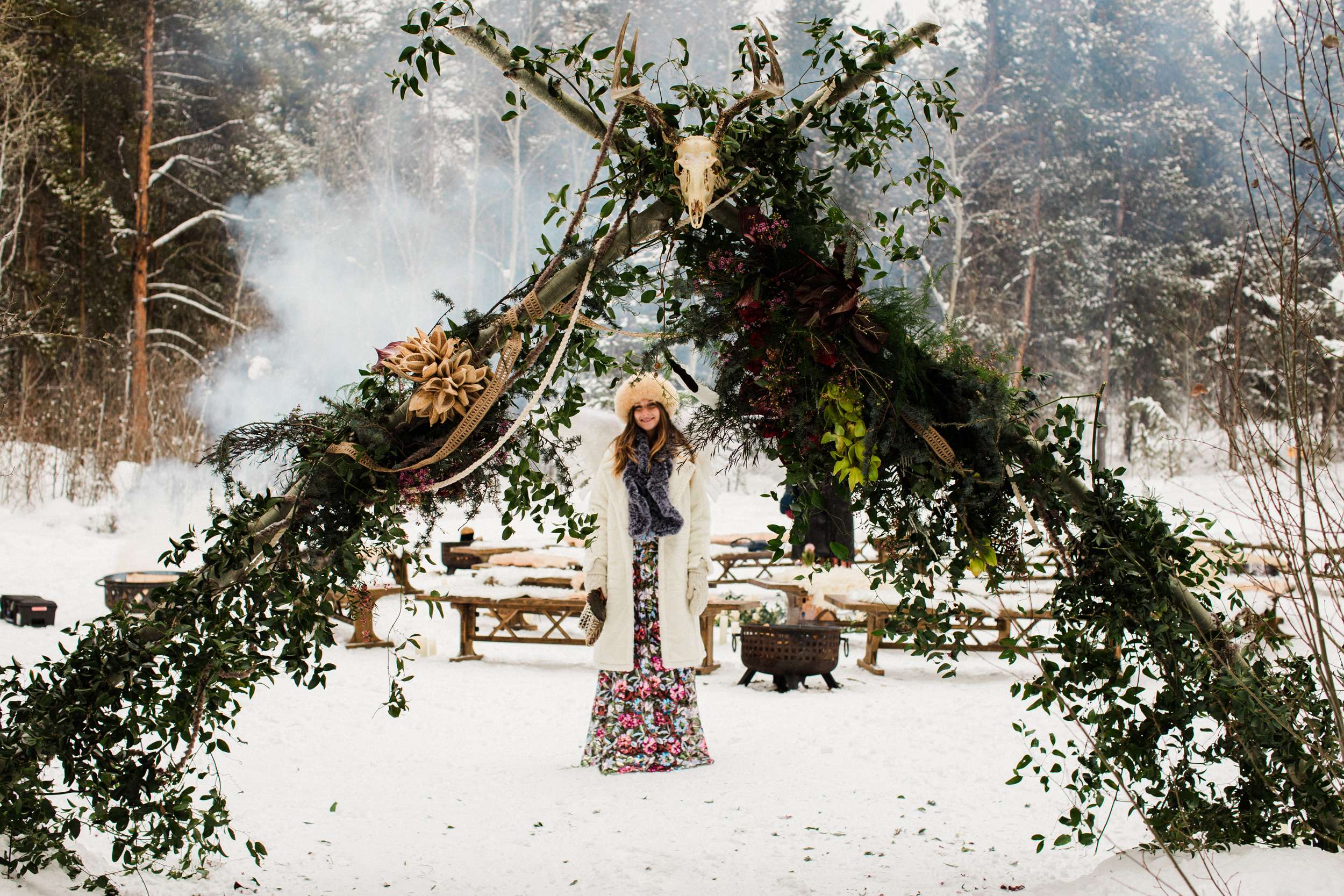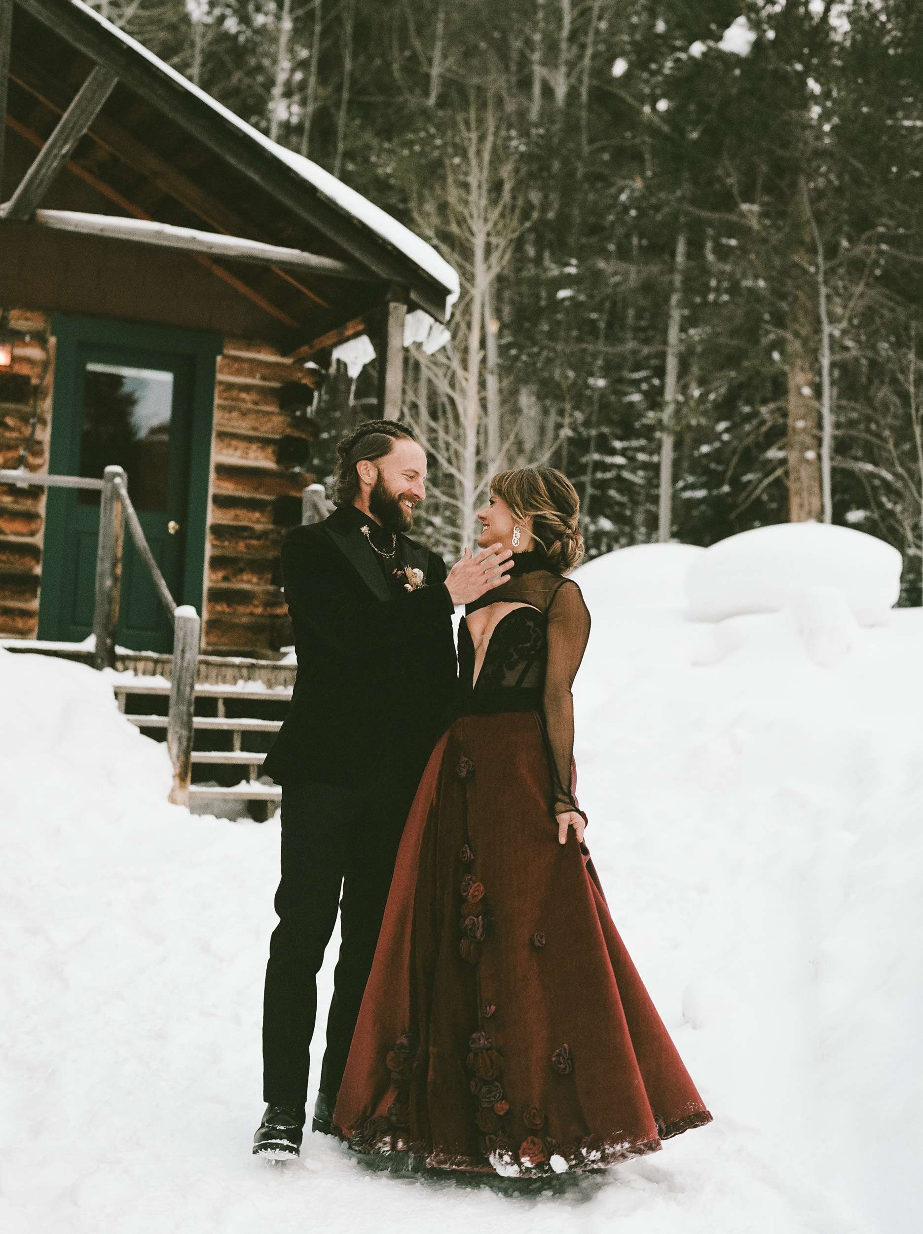 “Our processional was inspired by a dream I had one night, in which I envisioned everyone walking into the ceremony grove, singing together”, the bride continued. “Our talented friend Stevie helped realise the vision by writing a custom song, The Eye of the Rose. She taught it to everyone the night before. Before the ceremony, all the men in attendance met at the edge of the property, while the women gathered around me as I got dressed in a cabin closer to the ceremony location. The men began the procession by walking across the field, singing and drumming together, toward the women waiting to join in. I emerged from the cabin and met Jesse at the head of the procession, and then everyone walked down a snowy path through the woods into a grove of aspens and evergreens, singing together. It was magical”