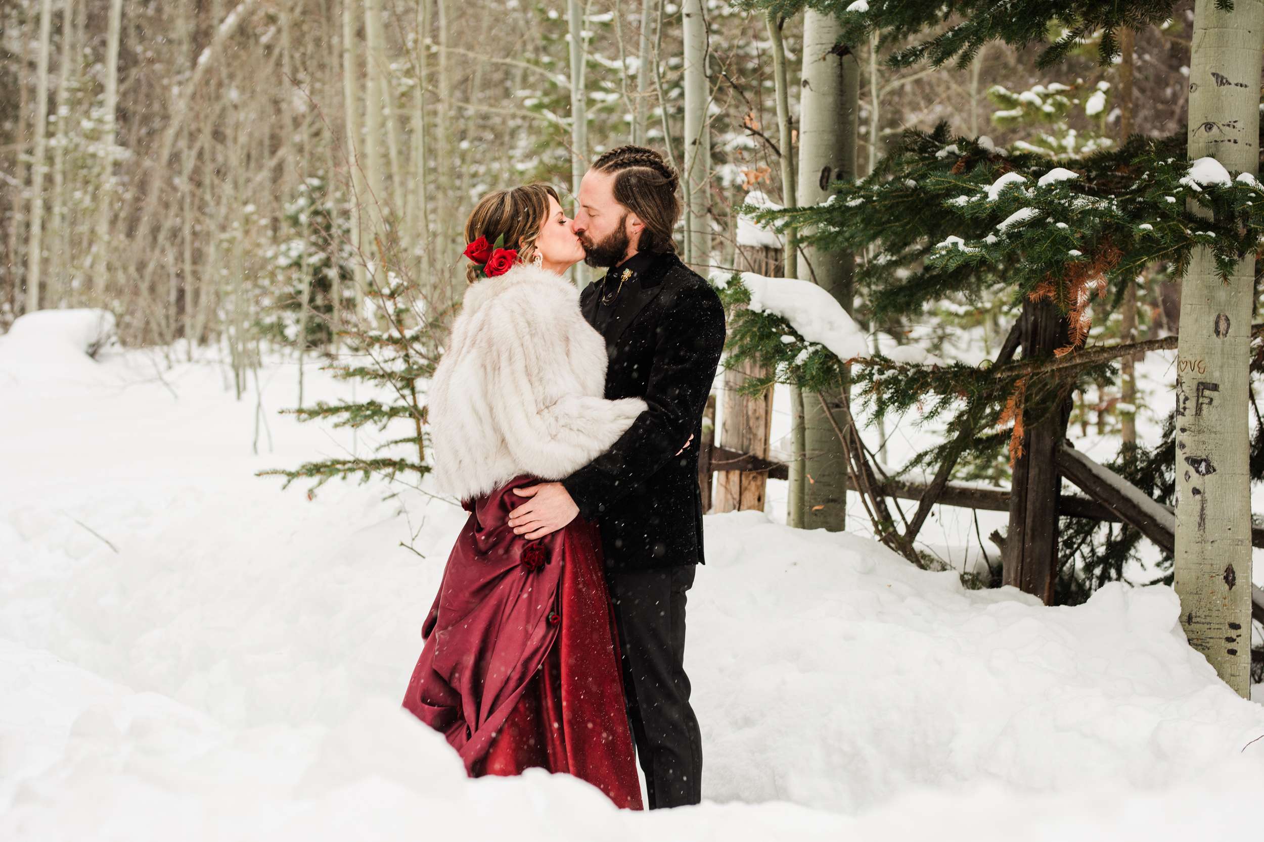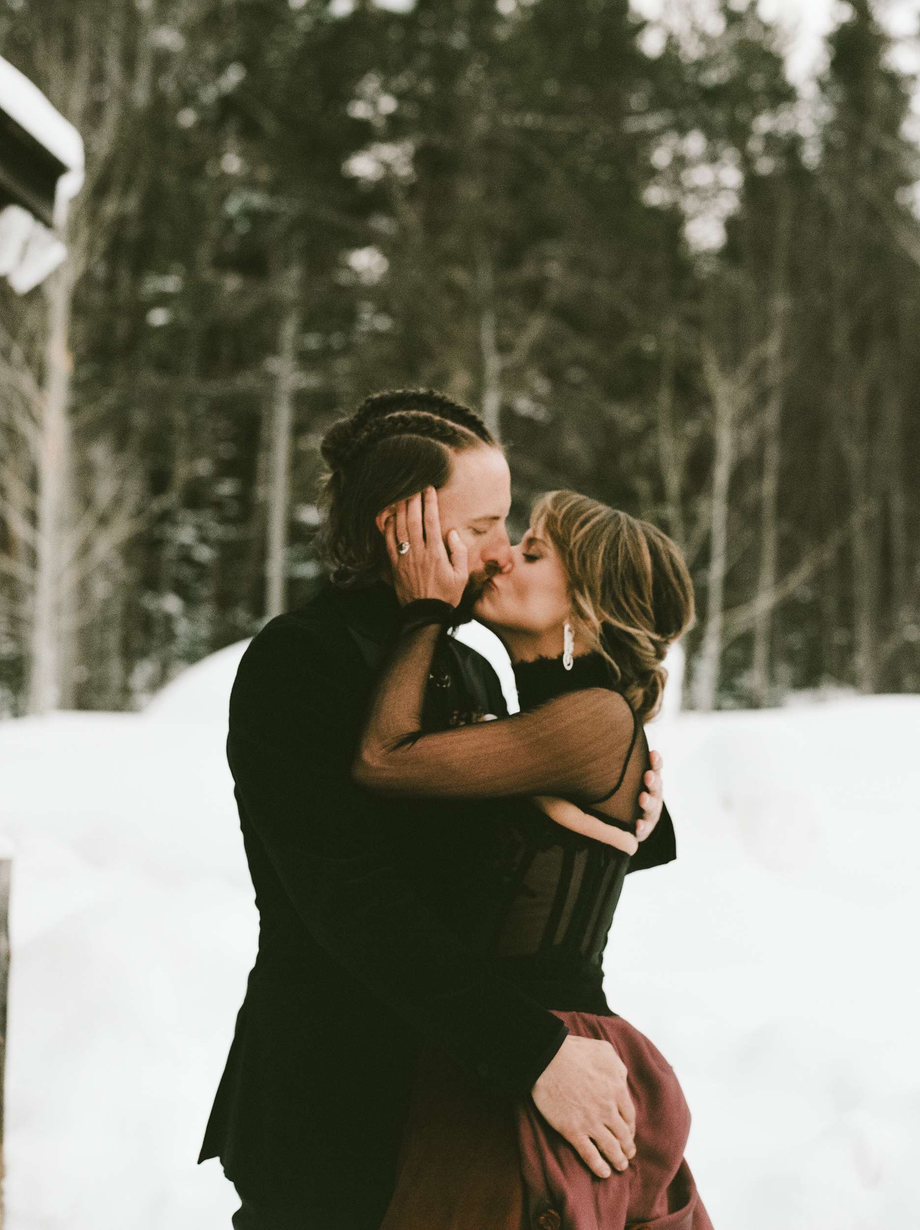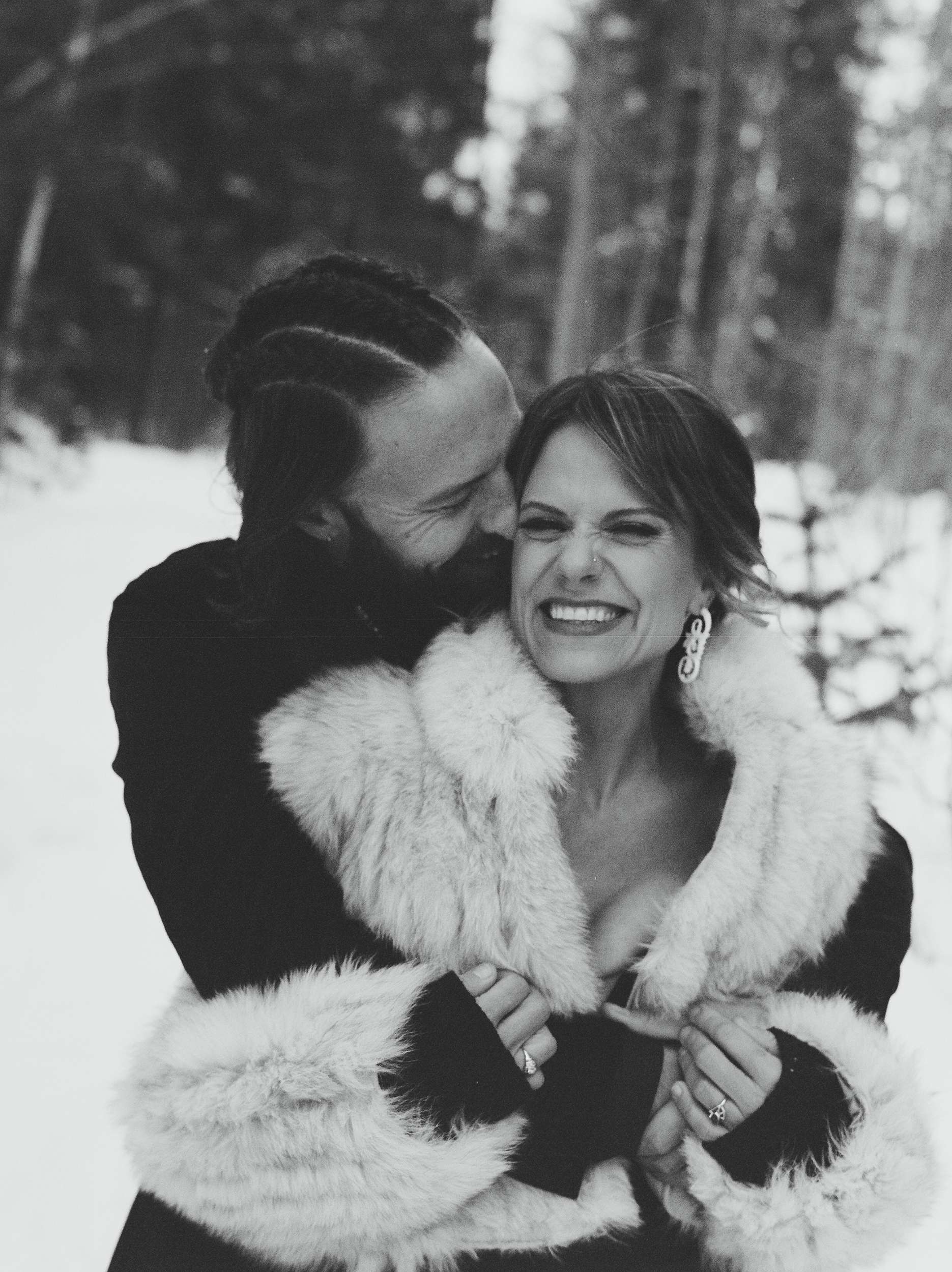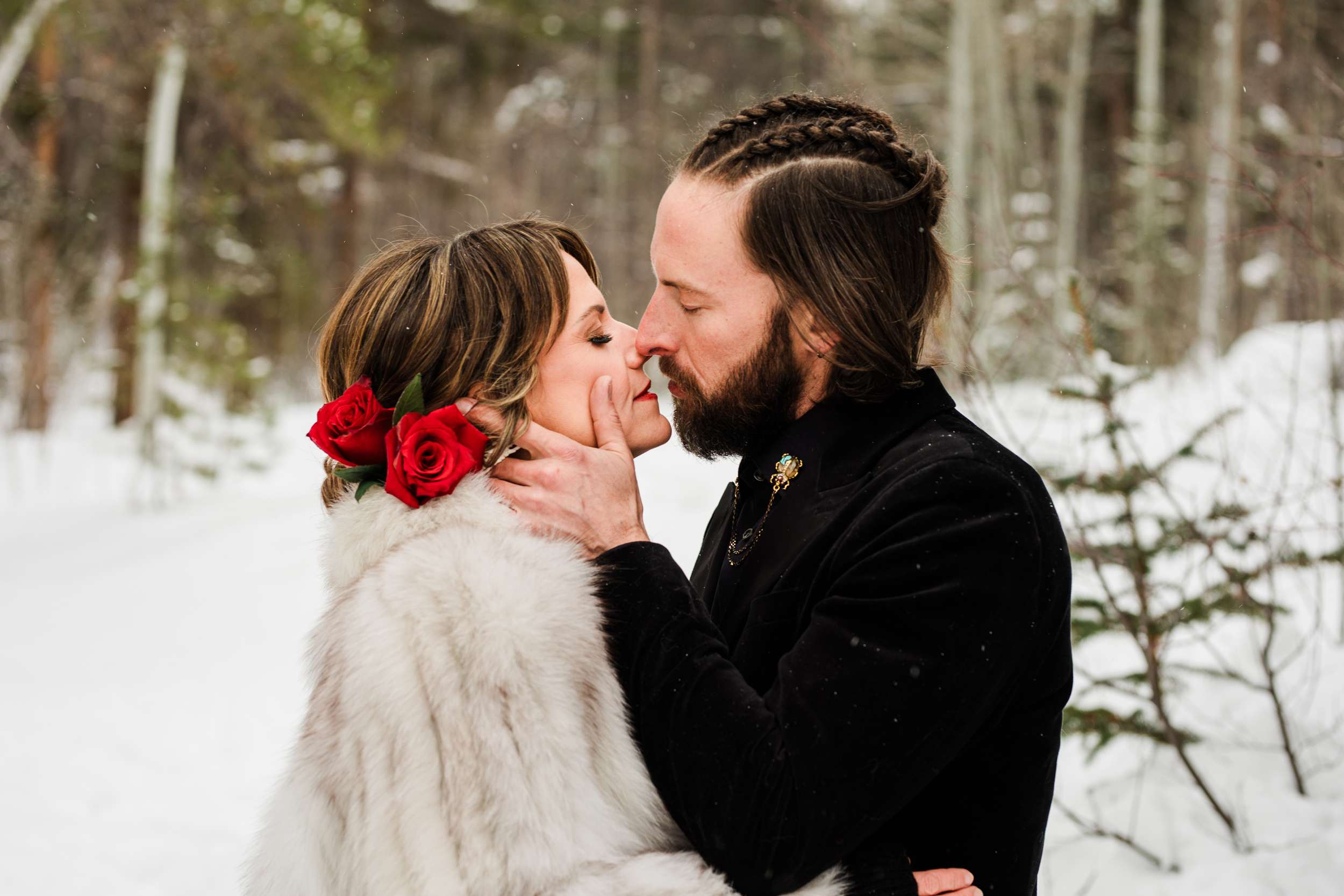 “Our processional was inspired by a dream I had one night, in which I envisioned everyone walking into the ceremony grove, singing together”, the bride continued. “Our talented friend Stevie helped realise the vision by writing a custom song, The Eye of the Rose. She taught it to everyone the night before. Before the ceremony, all the men in attendance met at the edge of the property, while the women gathered around me as I got dressed in a cabin closer to the ceremony location. The men began the procession by walking across the field, singing and drumming together, toward the women waiting to join in. I emerged from the cabin and met Jesse at the head of the procession, and then everyone walked down a snowy path through the woods into a grove of aspens and evergreens, singing together. It was magical”