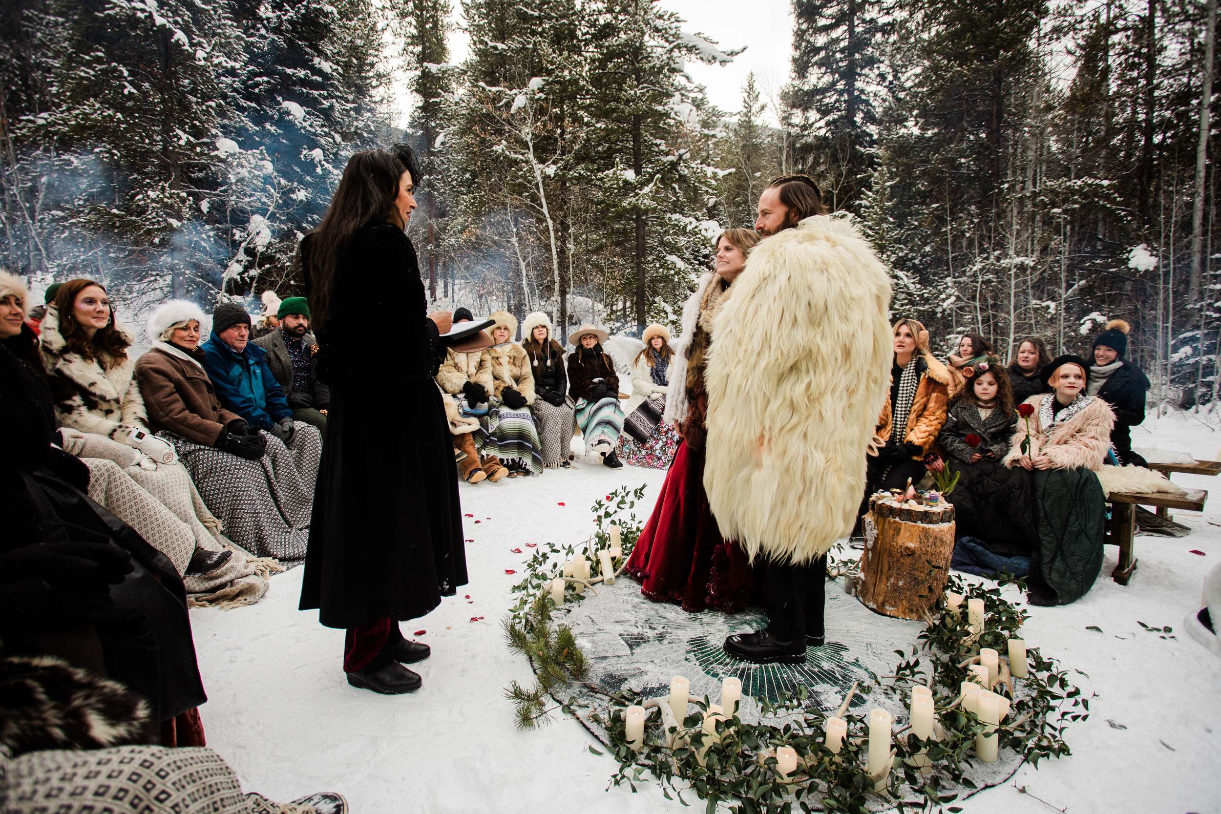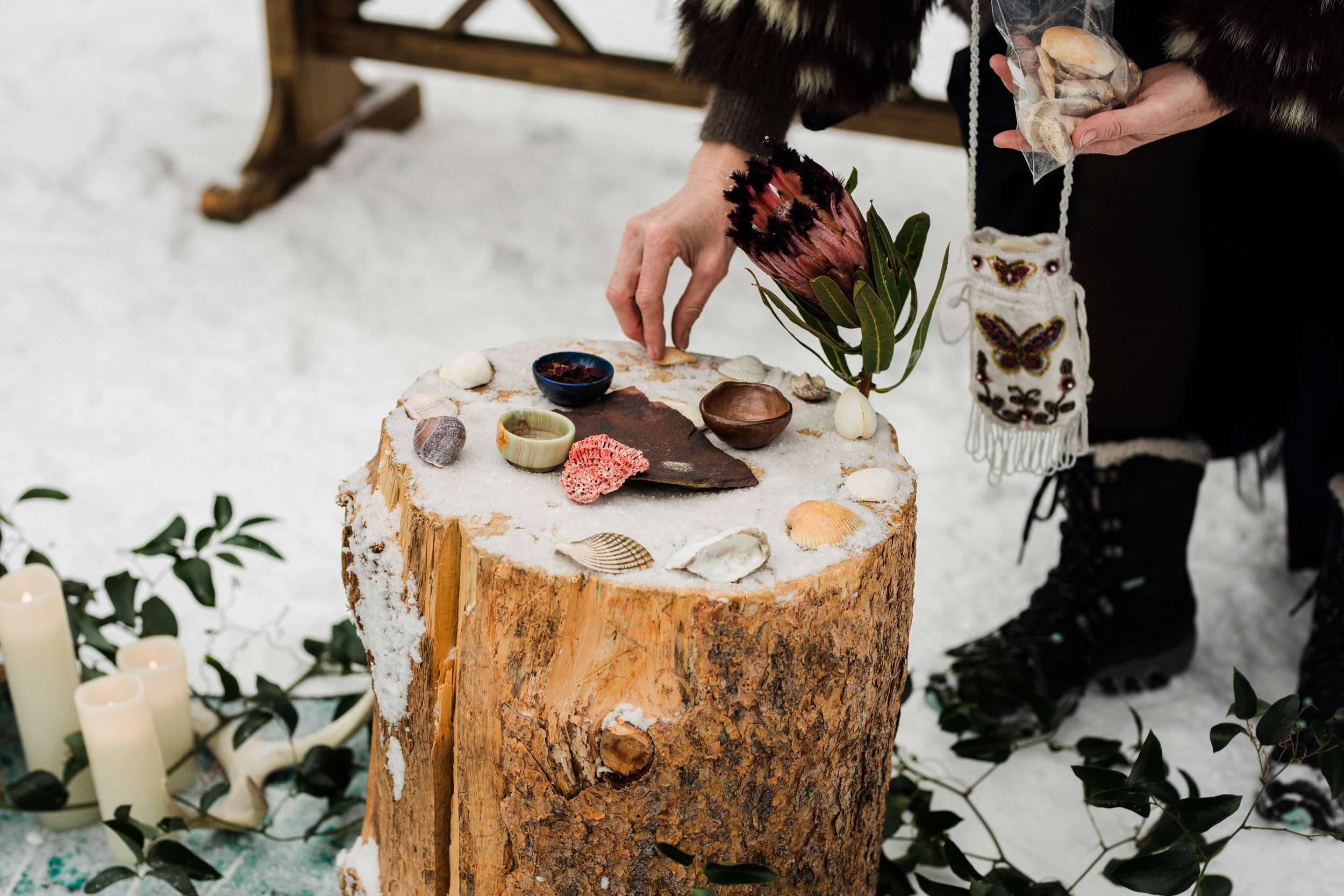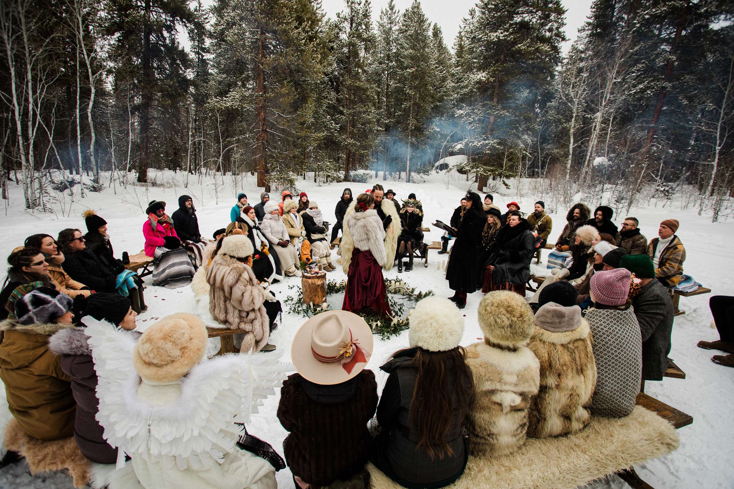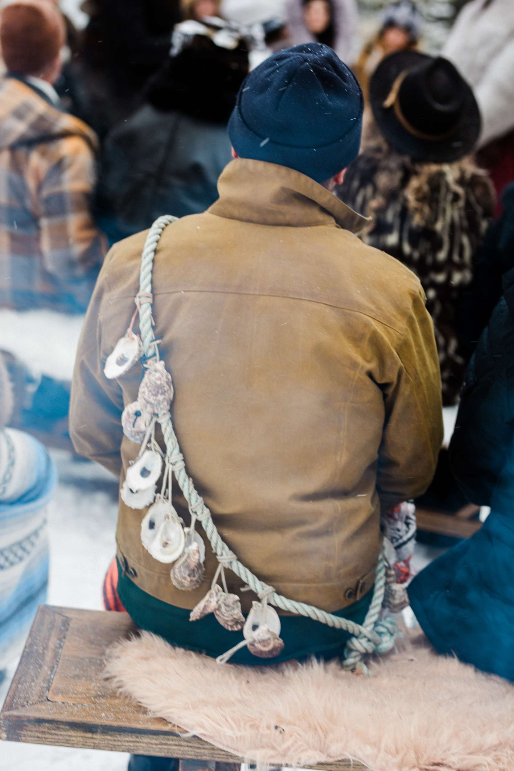 They set the date in January, both a practical and symbolic choice. “We decided to fully embrace the winter, choosing a high mountain location guaranteed to be blanketed in snow”, Ginny told us. “Winter belongs to the direction of the North on the medicine wheel of the indigenous traditions we have both studied. It is the direction of the ancestors and the place where all dreaming begins. We envisioned the whole ceremony as a dream we got to weave, together with our community, our ancestors and the land.”
