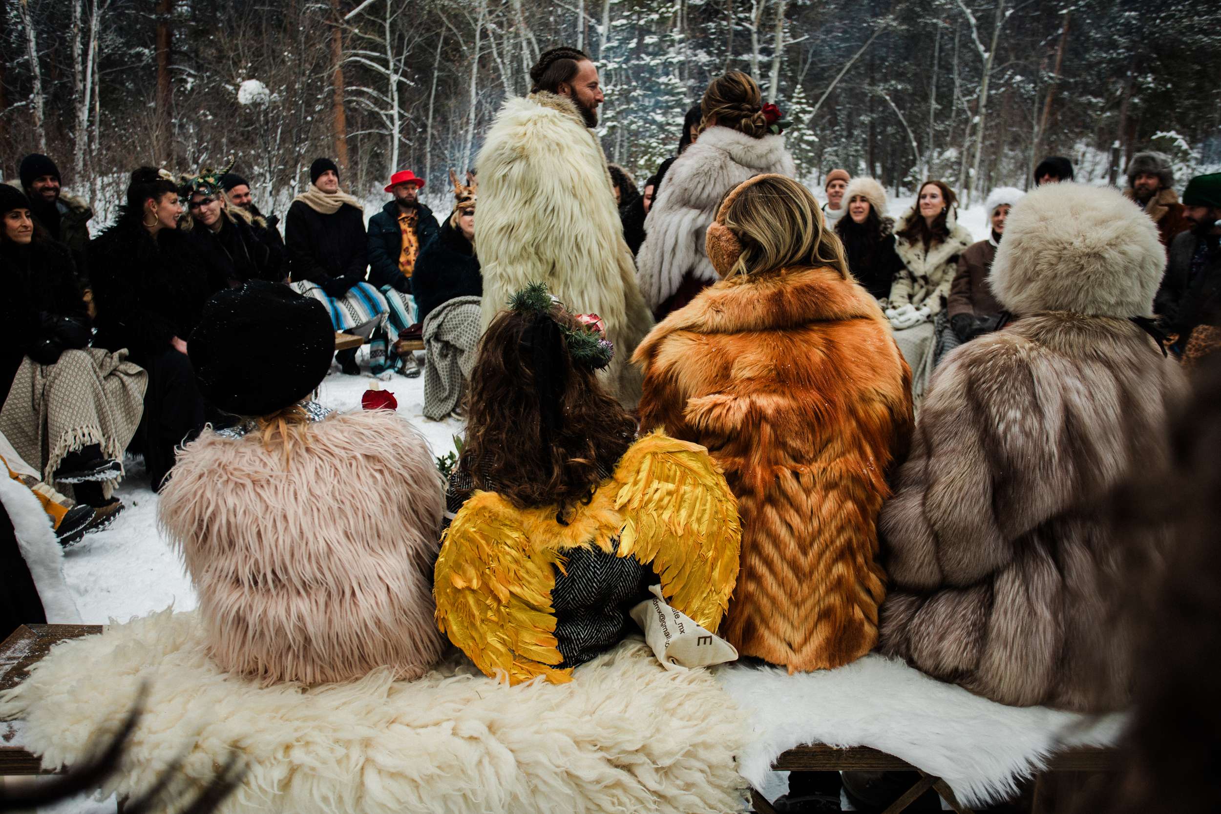 Guests were asked not only to dress warmly, but to embody their connection with the natural world through their outfits. Guests wore fur, bone, feathers, and plants. Hand warmers, sheepskin-covered benches and fire pits made the snow-filled grove bearable, but the point was never comfort. It was the kind of temporary discomfort that becomes a memory worth carrying.