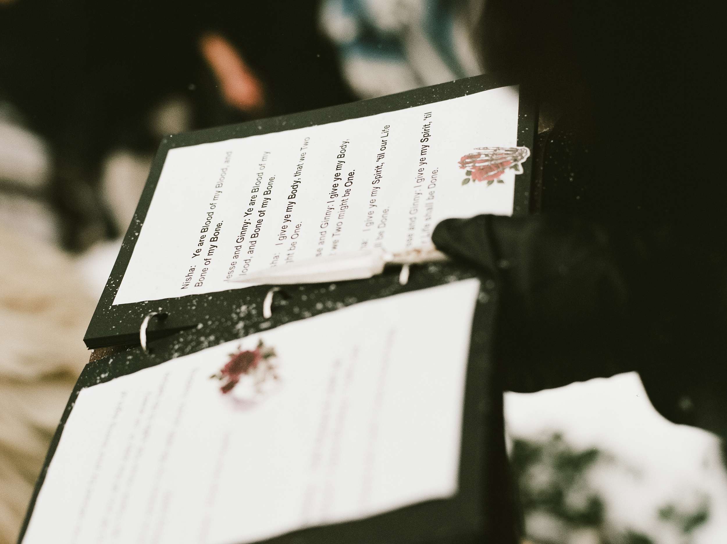 “We designed our ceremony ourselves with the leadership of our two incredible officiants, both friends and gifted ceremonialists. It included blessings delivered to each of us from dear friends, to remind us of who we are as individuals. It included communal howls. It pulled elements from our ancestral traditions, including a blood oath (cutting each other’s thumbs with a special blade and pressing them together to seal our vows) as well as a binding of the hands with a leather cord by two friends who have a marriage we admire. We wrote our vows ourselves. When we exchanged rings, we spoke the words: ‘With this ring, I devote myself to our union. With this ring, I set you free.’ The ceremony completed with a multidimensional blessing from our friend and teacher Kelly, then we kissed and processed out of the spiral, the whole community singing our custom song.”