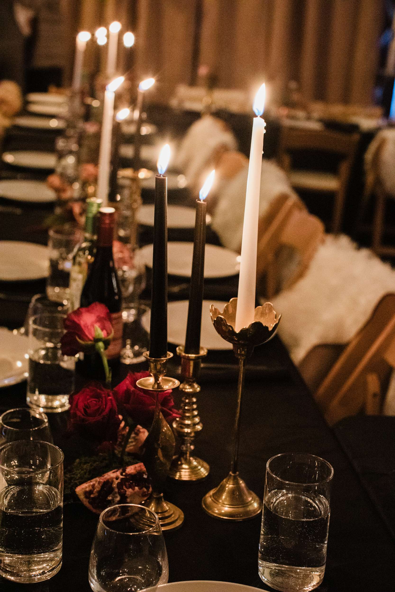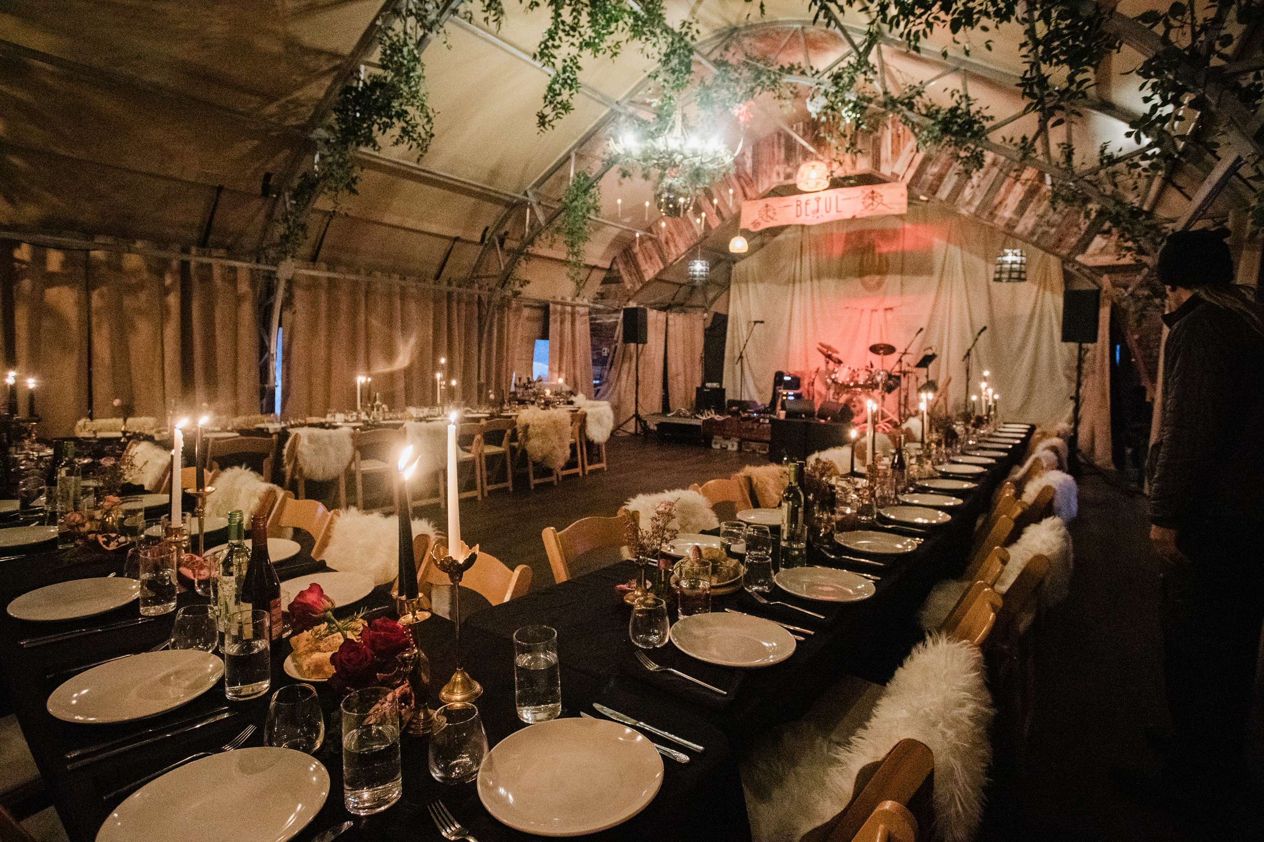 Instead of cake, there was a gourmet s’mores bar by the fire. Instead of a wedding party, everyone was invited to show up in their own chosen expression. In the barn tent, long tables were covered in candles, roses, greenery and sheepskins. Food was served family style, echoing the feeling of an ancestral feast. Speeches and toasts became their own performances. People read poems, sang, drummed and told stories that had everyone laughing, crying or both.