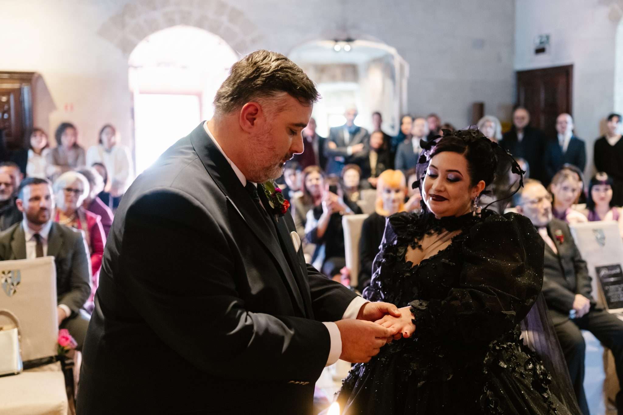 Marialaura and Fausto’s wedding unfolded inside a 15th century castle in Southern Italy. The couple filled it a botanical soft goth atmosphere where black, jewel tones, greenery, and autumn shades set the mood. They walked into their planning armed with the Rock n Roll Bride as their guide, which they said they literally shared with suppliers as a visual manifesto! Their aim was a balance of dark romance, inclusivity, and natural beauty.