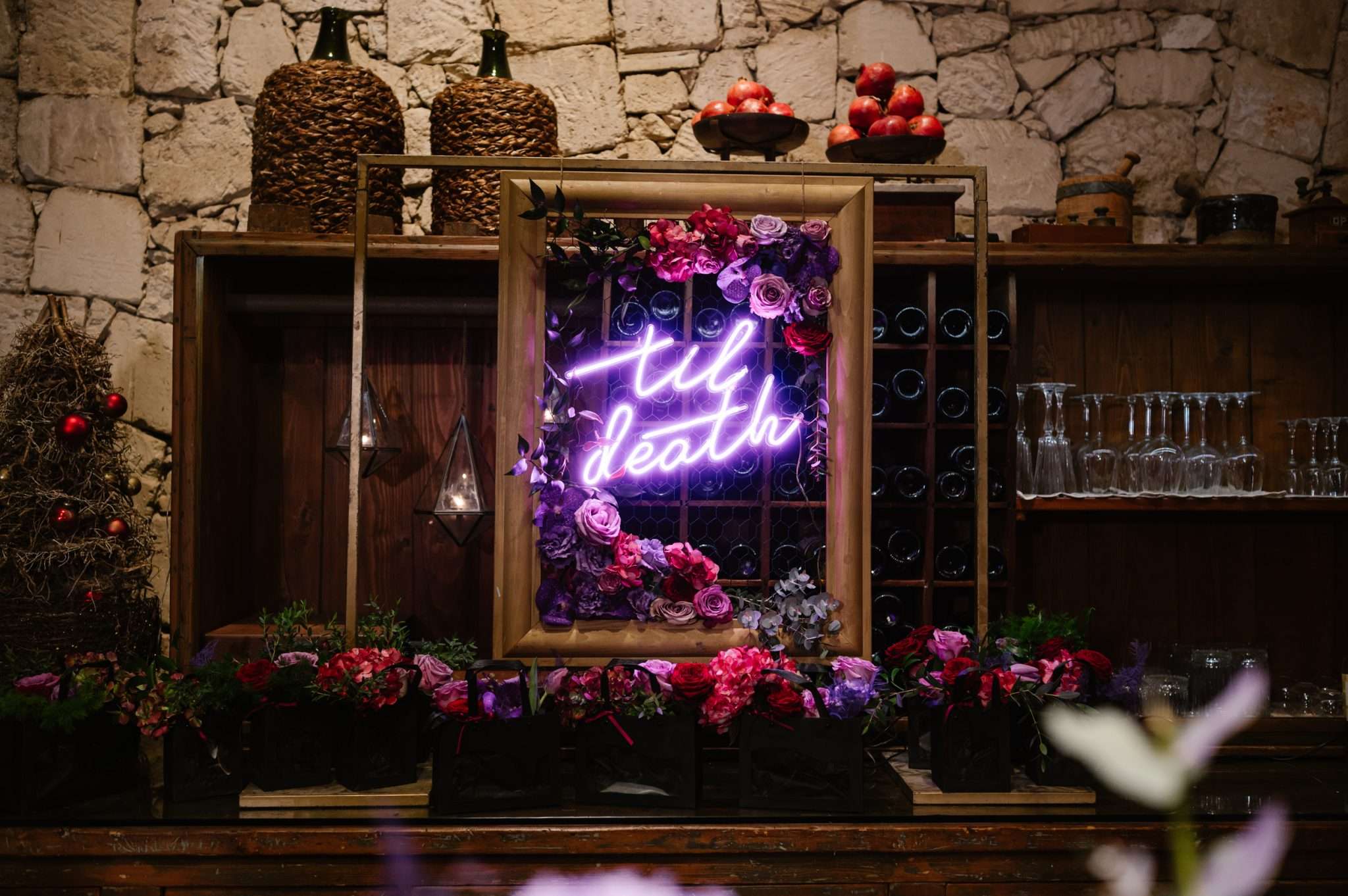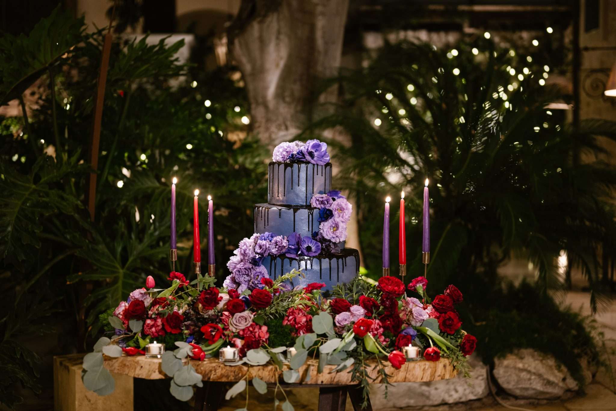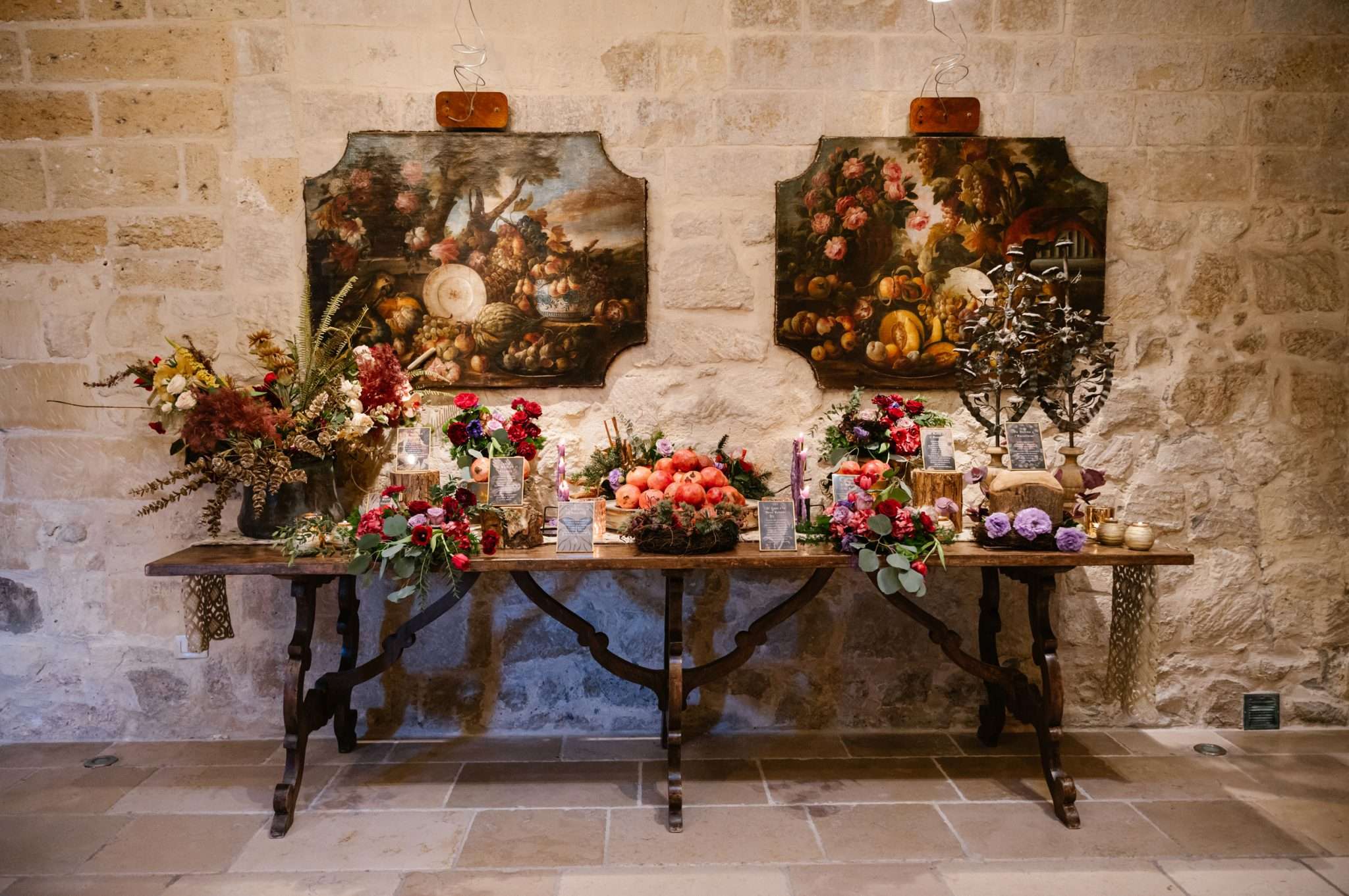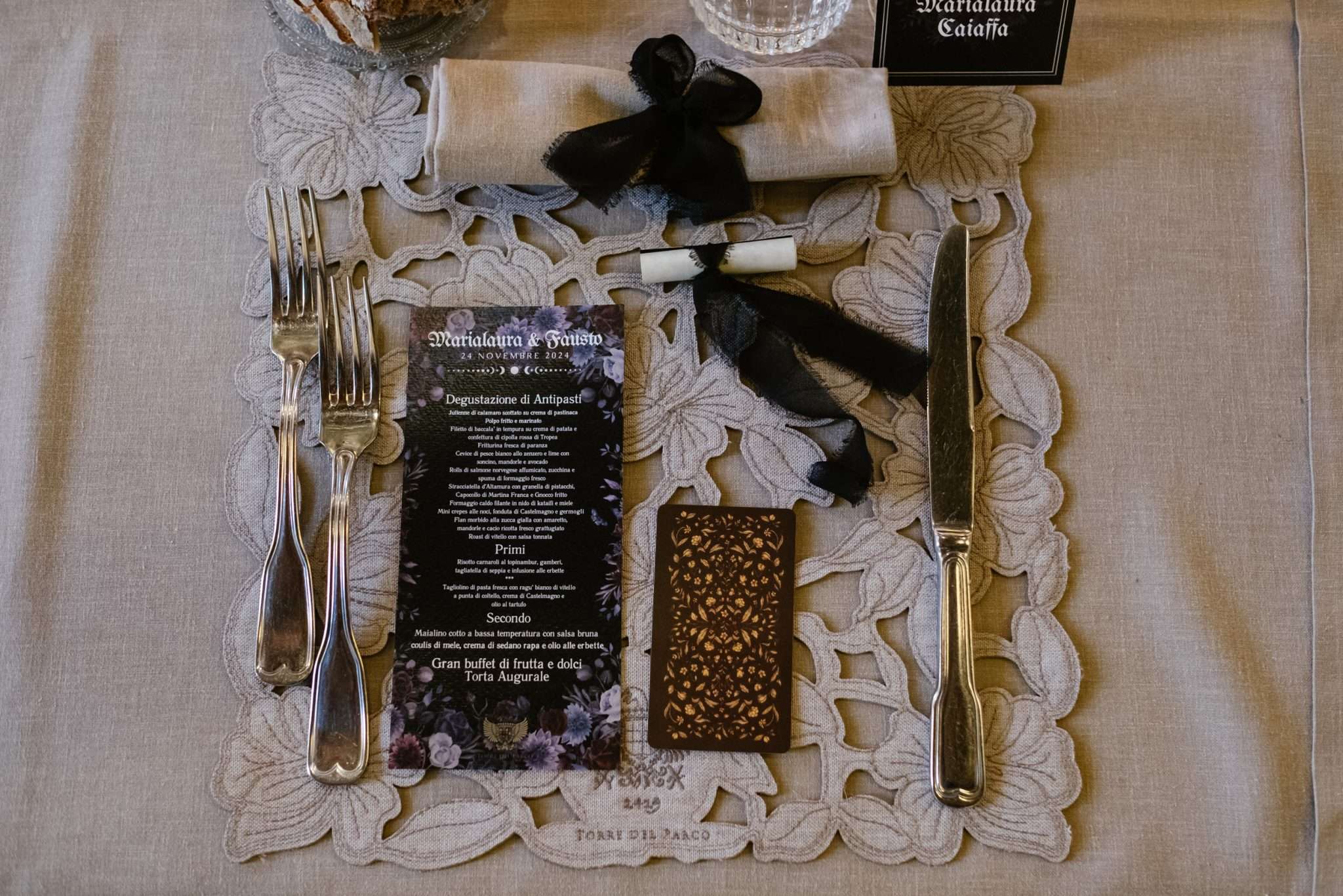 The reception leaned into soft gothic romance with colours of deep teal, wine red, violet, and antique gold. Marialaura designed the stationery herself. Favours combined incense, a crescent moon holder, and scrolls explaining both the symbolism of the gift and a donation to AIGlico, the Italian association for GSD 1b, the rare disease she lives with.