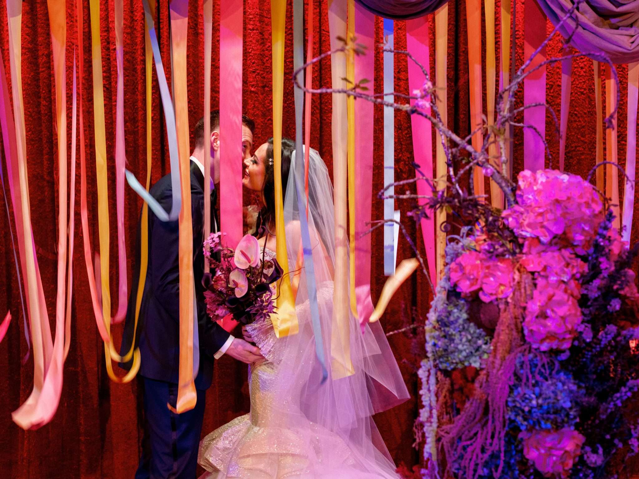 The couple leaned hard into what the theatre already was: colourful, odd, and dripping with creativity. Mandy is a visual artist, Matt is a screenwriter, and they both wanted vendors who could play with the venue’s eccentric spirit instead of sanding it down into something generic. “We weren’t trying to fit any standard wedding aesthetic”, Mandy told us. “We just wanted to be true to what makes us happy and what represents us as a couple, and at the heart of that is creativity.”