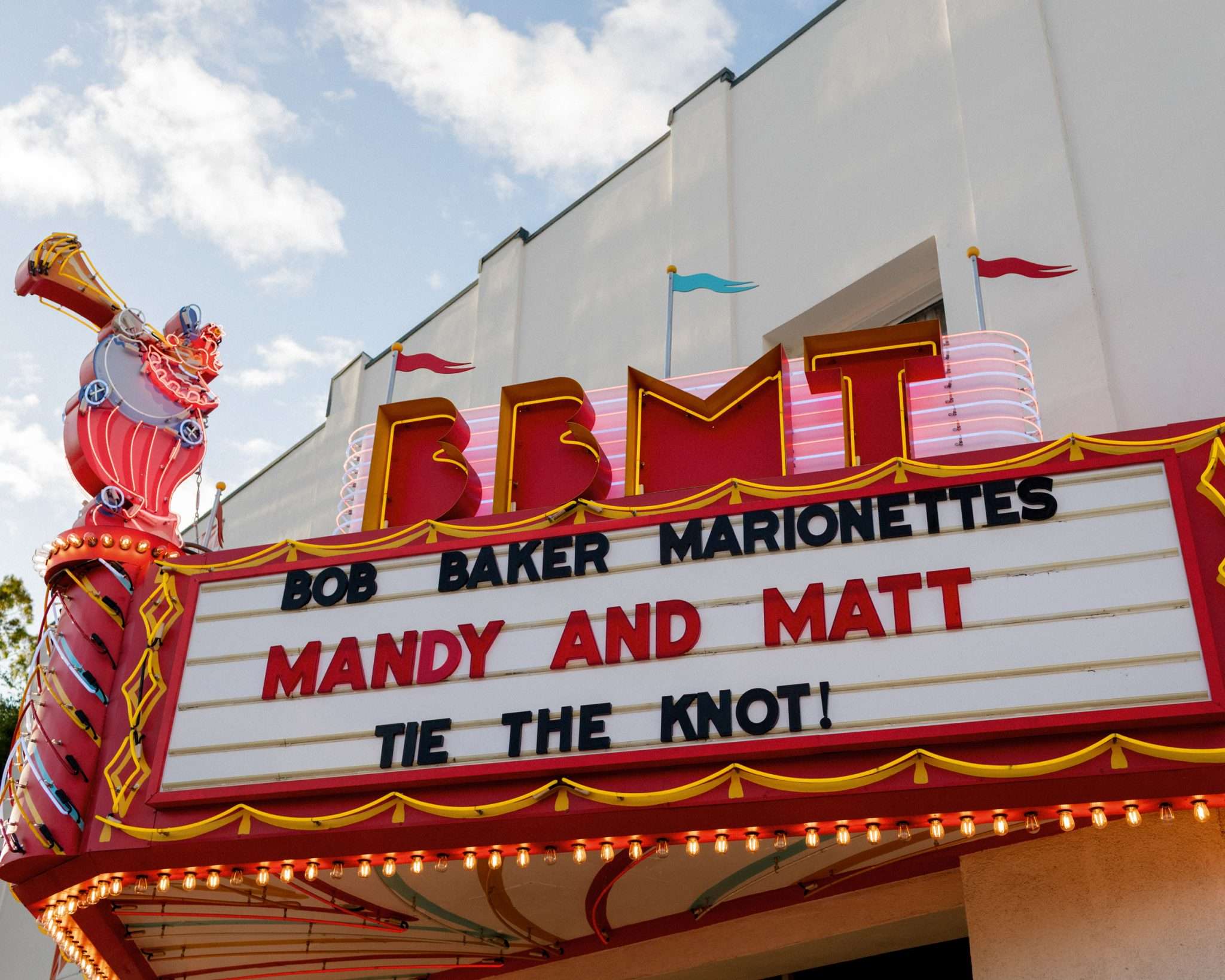 Mandy and Matt’s wedding was staged at one of Los Angeles’ strangest and most iconic spots, the Bob Baker Marionette Theatre. Known for its puppets, velvet curtains, and surreal history, it was the only choice once Mandy discovered it doubled as a wedding venue.