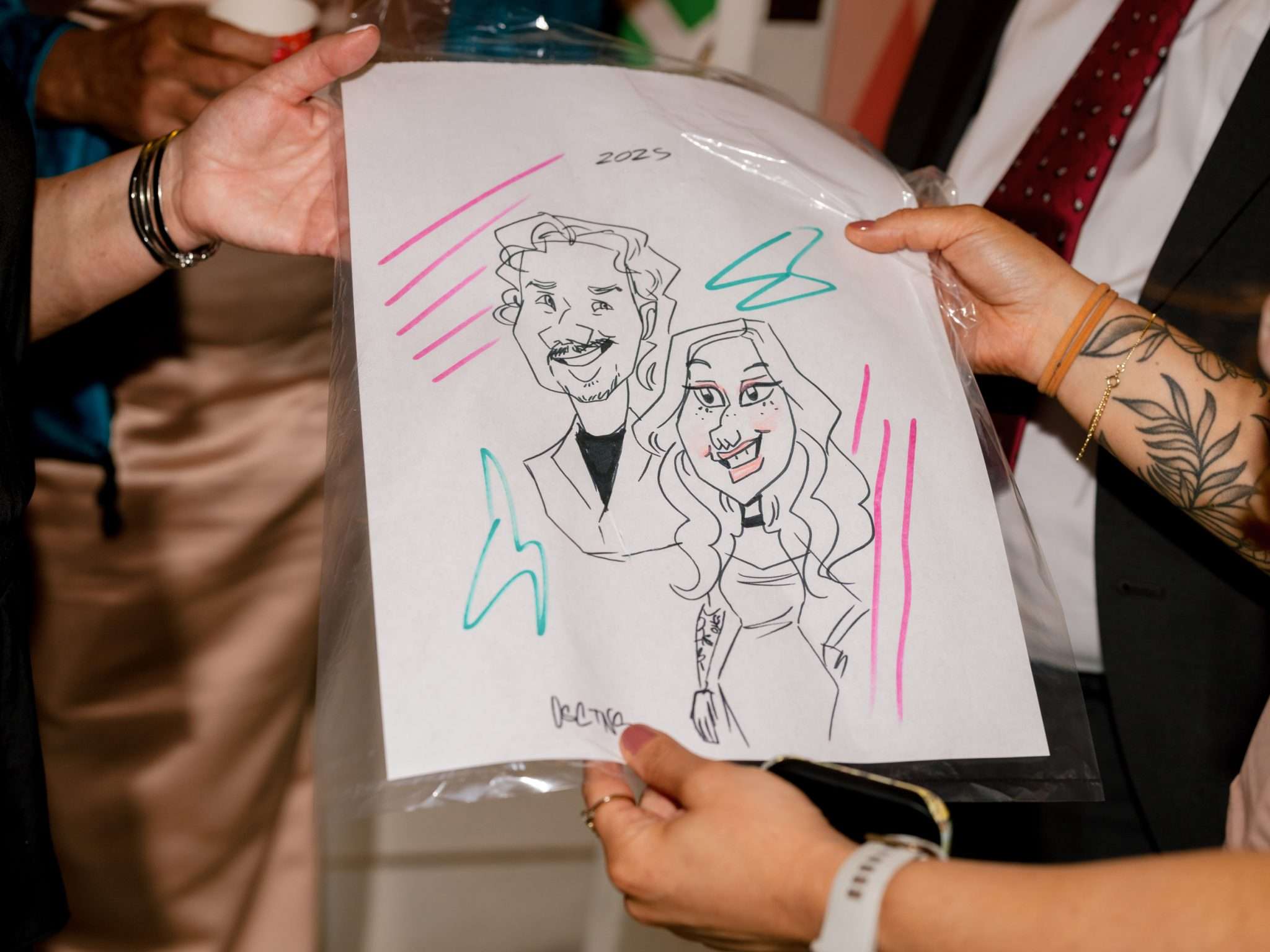 The reception matched the playful energy of the ceremony. A caricature artist sketched every guest. On top of the cake was a topper which the bride has sculpted featuring both of them in their wedding outfits and their two dogs, Zero and Doralee. “Our guests really got a kick out of those,” she said. “We would have loved for them to be at the wedding but they were simply not having it with our photographer, who is one of the loveliest humans ever. They would not stop barking at her and her cameras, so we had to nix the idea of bringing them down the street to join for the sake of everyone!”