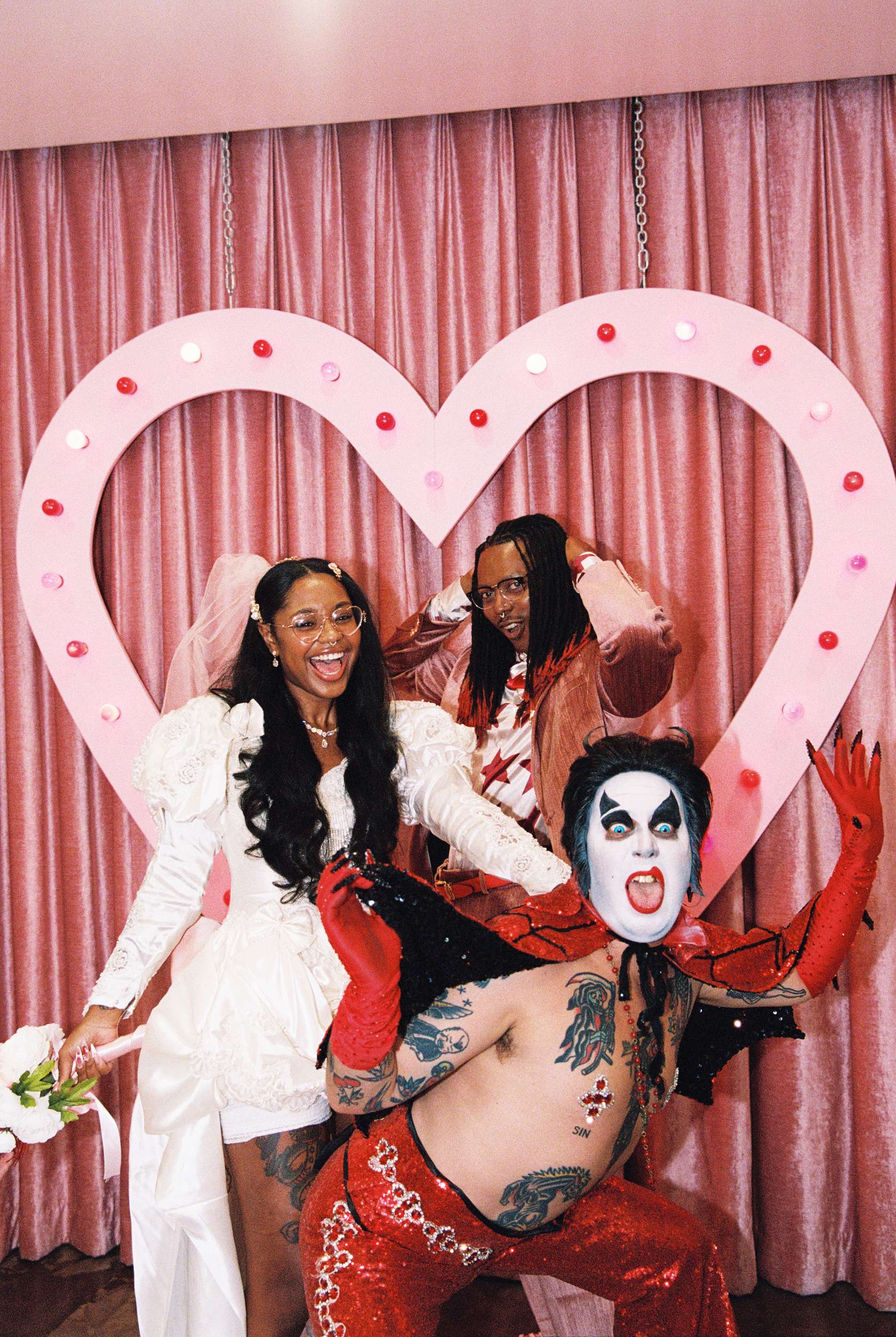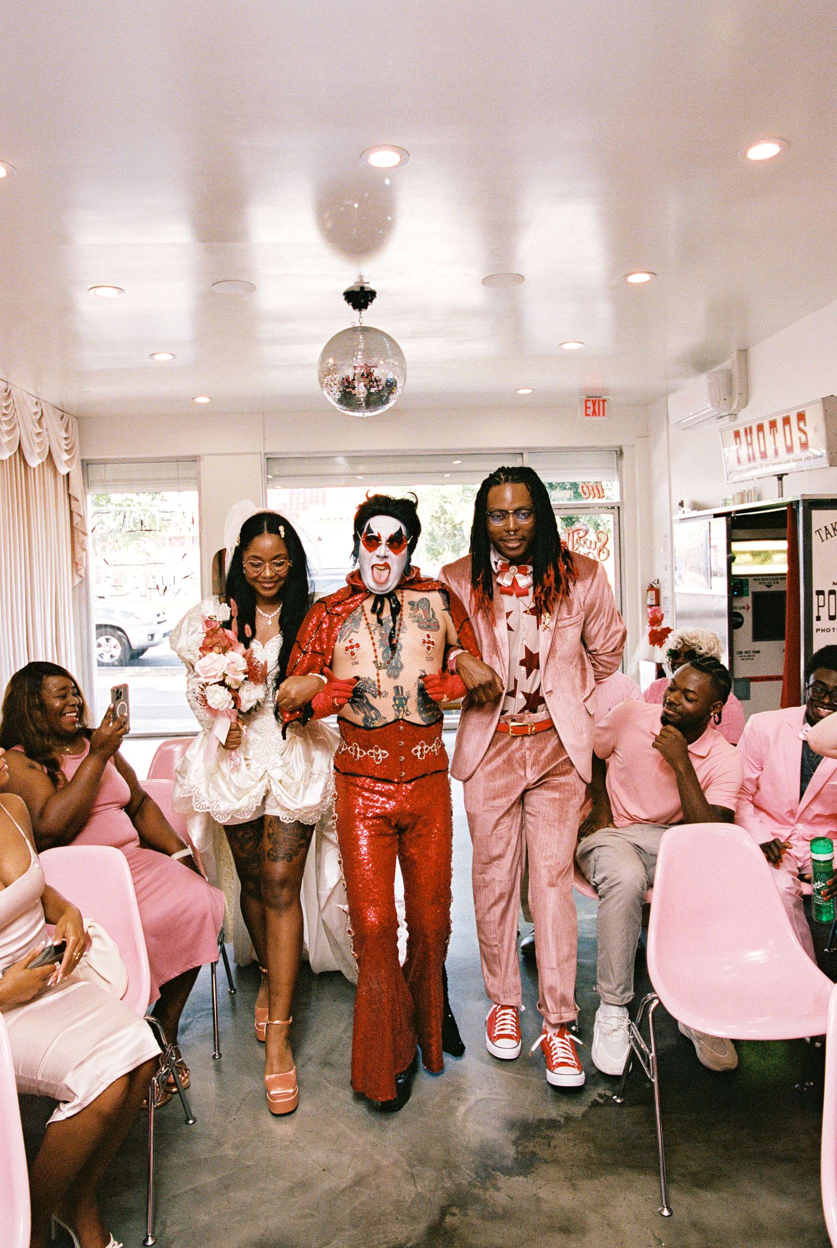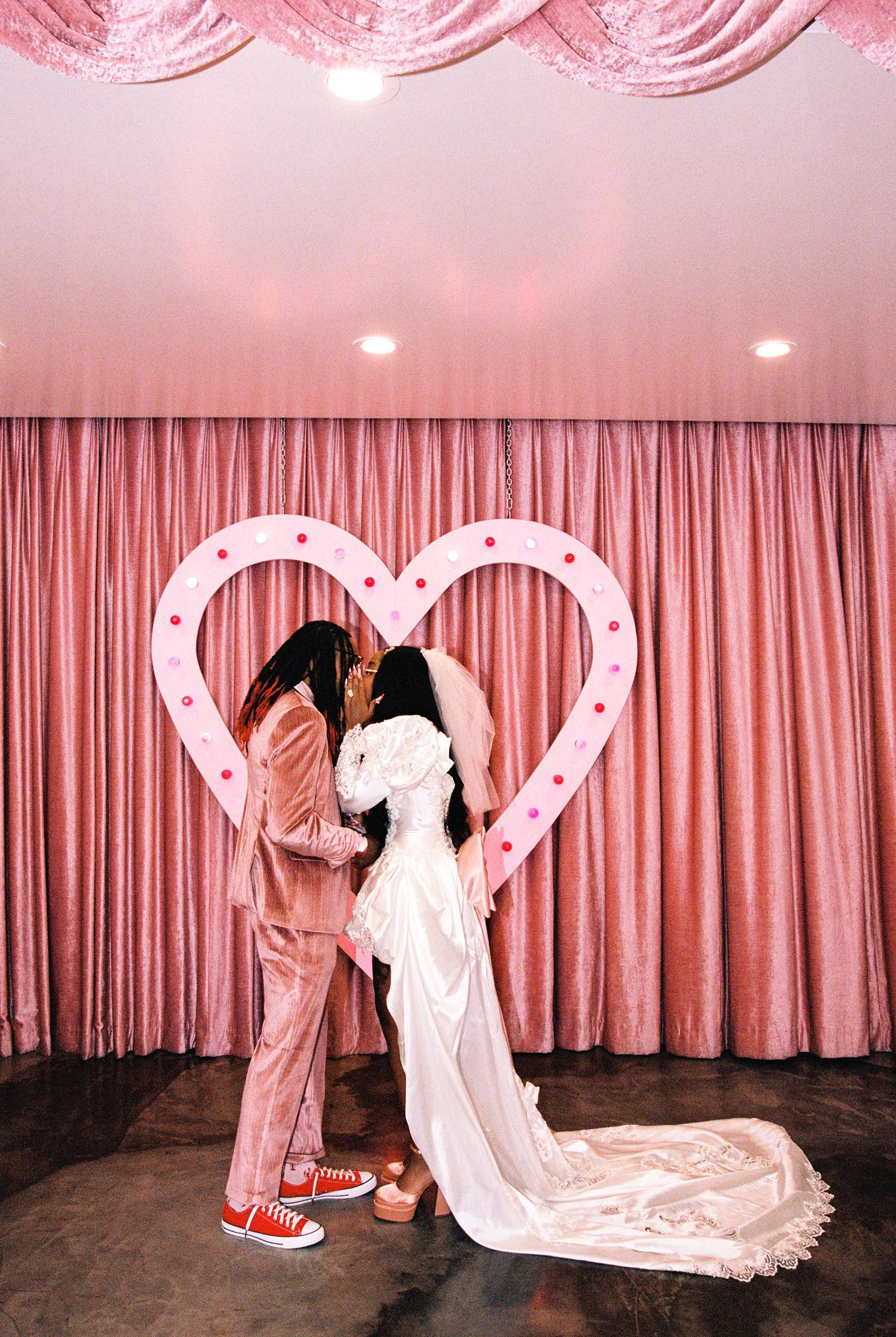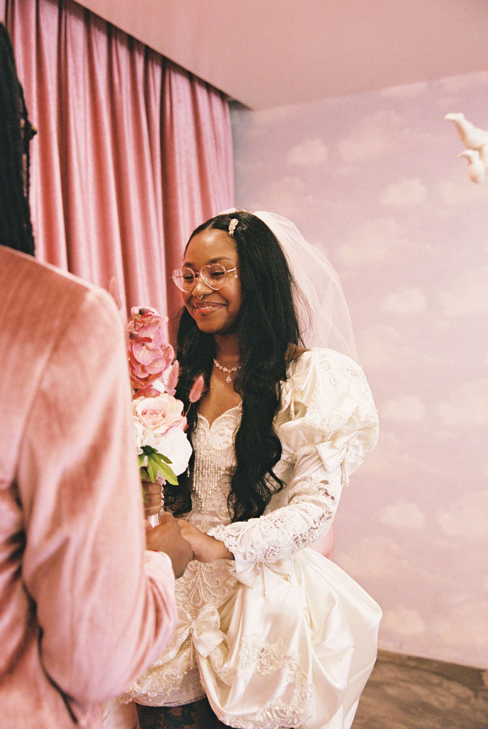 The guest list was short, and attendees were all asked to dress in pink or red. The bride and groom’s outfits were bold and totally them. Keshaun wore grillz and a pink velvet tux he scored for $70 on Amazon. Alyssa found her vintage gown by chance. “My best friend randomly pointed out a vintage bridal store while we were driving, and I immediately knew my dress was the one as soon as I saw it.” The gown cost $350 with another $180 in alterations, making it one of the biggest wins of the day.