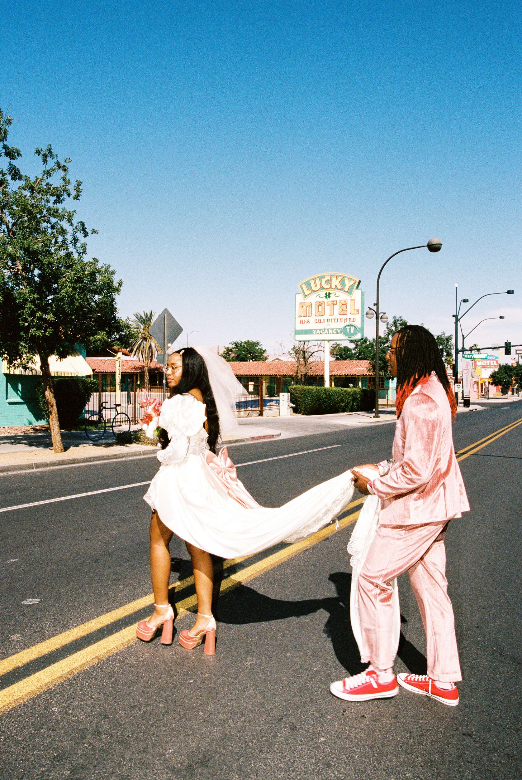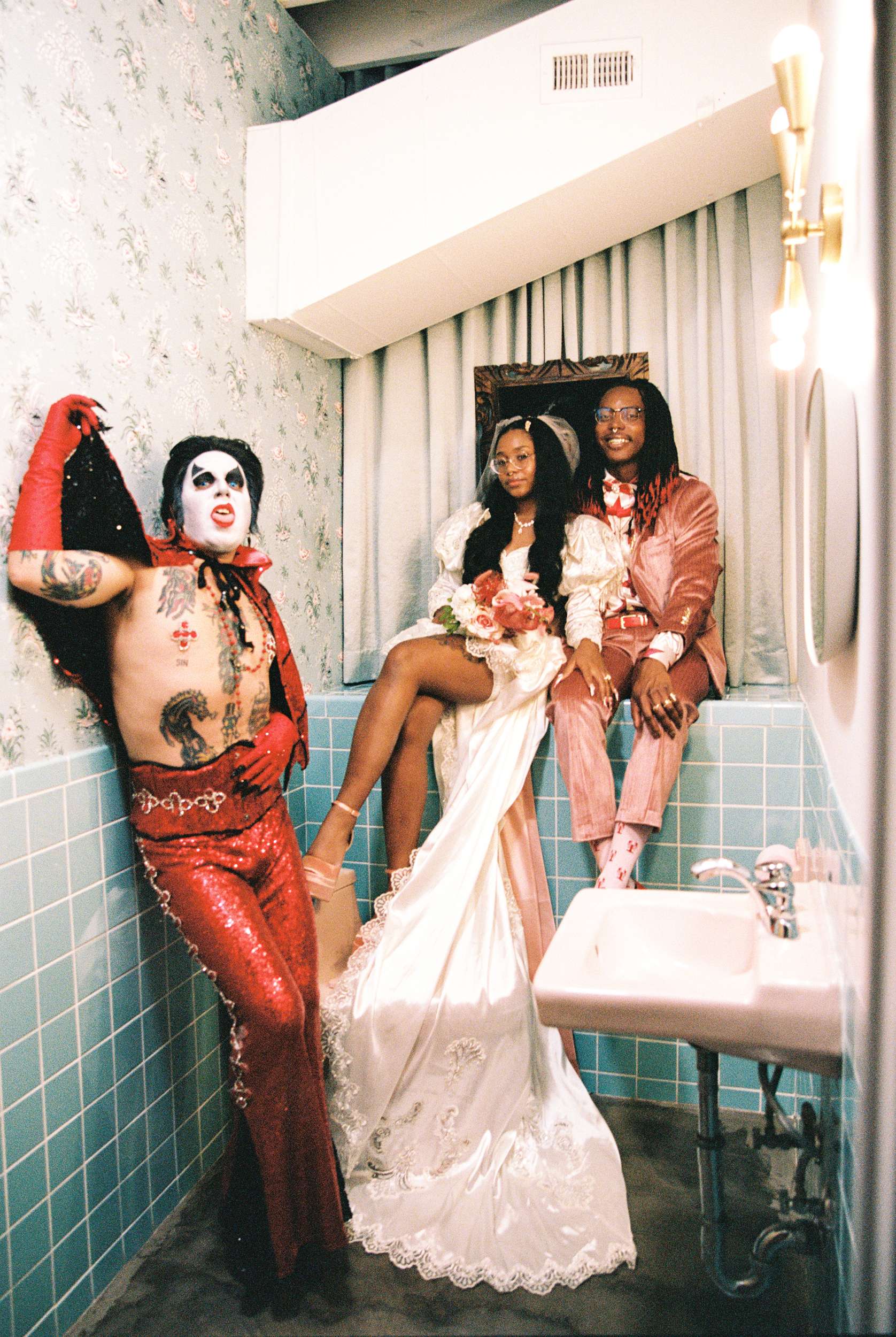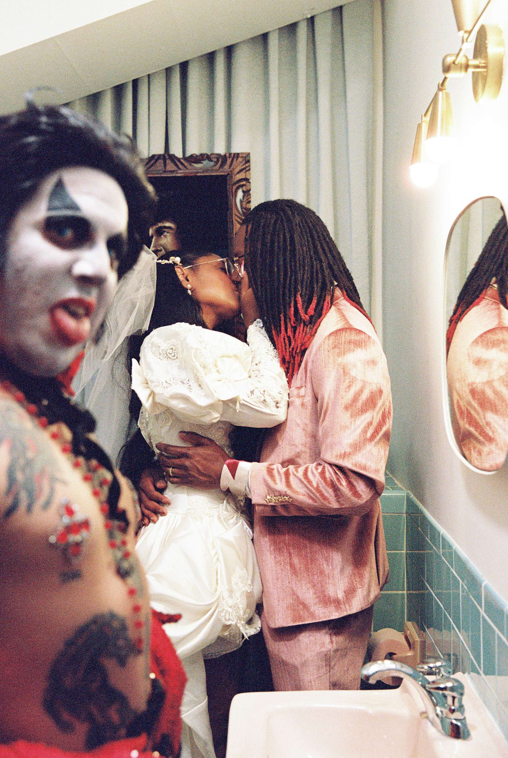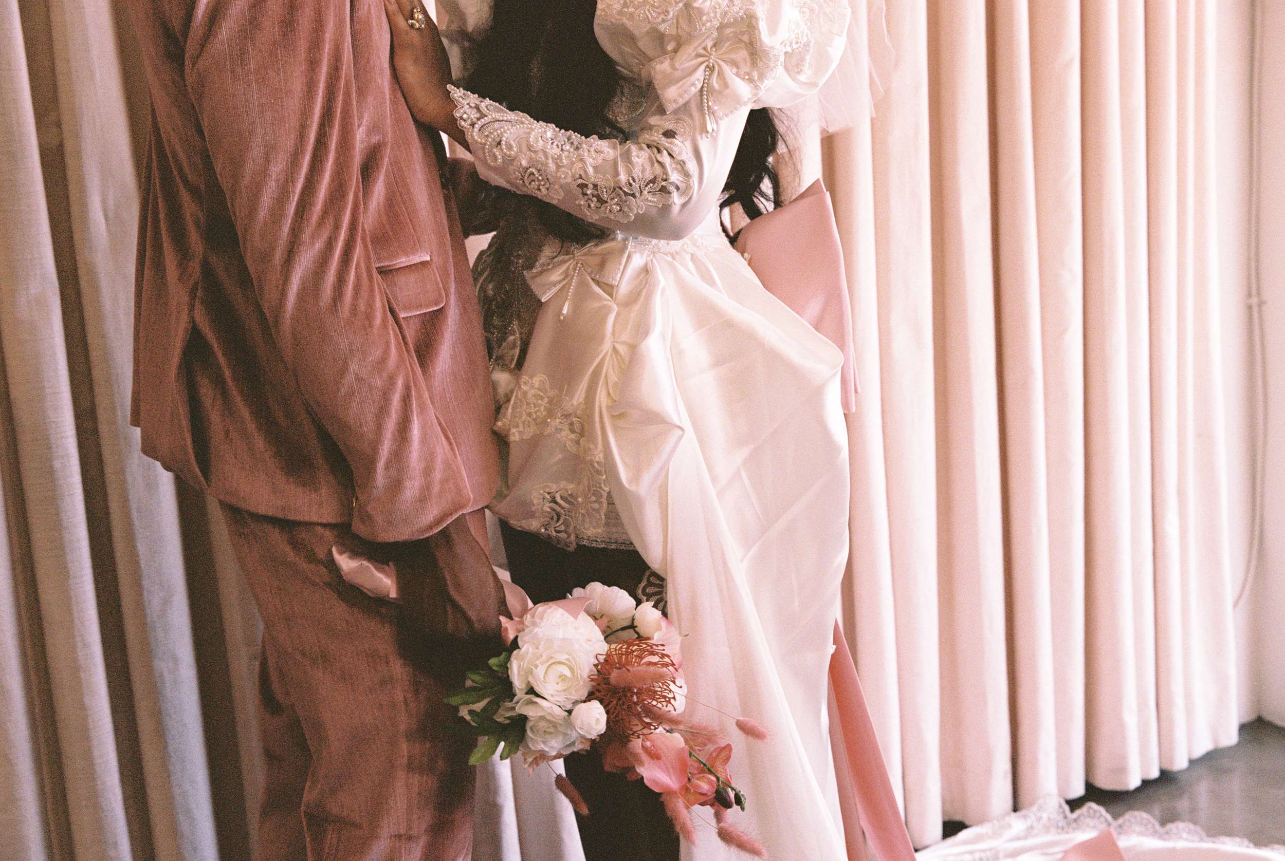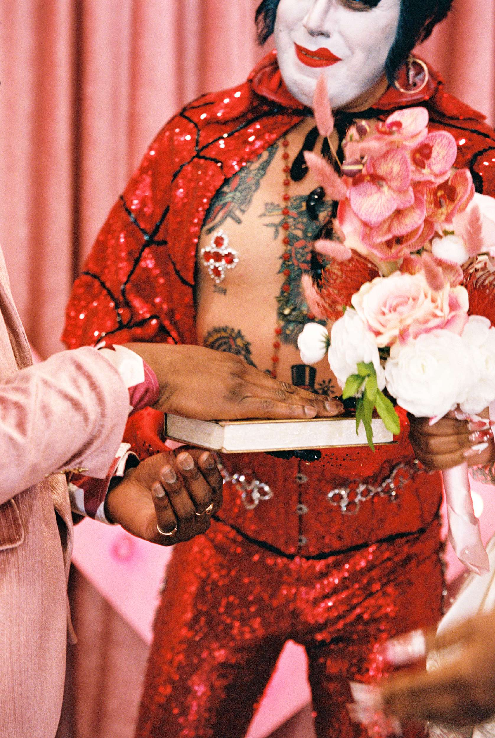 The guest list was short, and attendees were all asked to dress in pink or red. The bride and groom’s outfits were bold and totally them. Keshaun wore grillz and a pink velvet tux he scored for $70 on Amazon. Alyssa found her vintage gown by chance. “My best friend randomly pointed out a vintage bridal store while we were driving, and I immediately knew my dress was the one as soon as I saw it.” The gown cost $350 with another $180 in alterations, making it one of the biggest wins of the day.