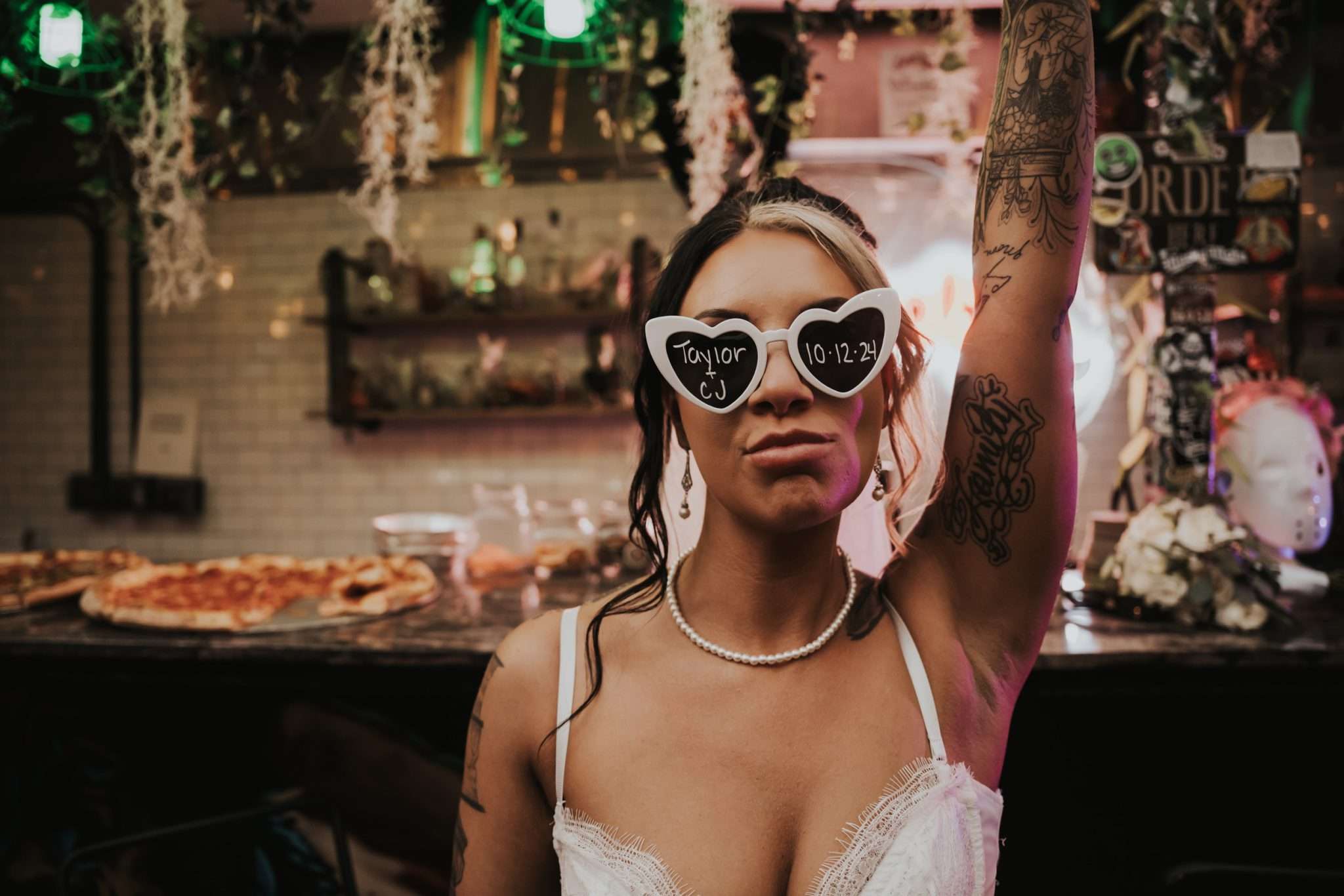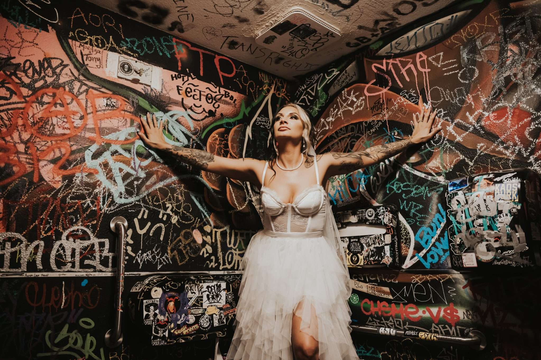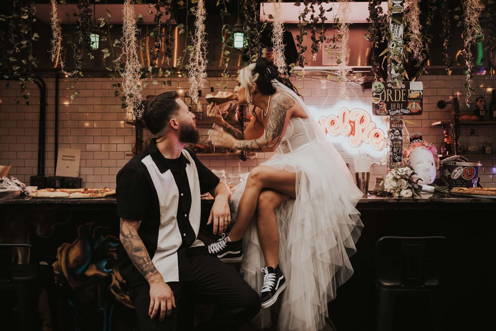 Forget a sit-down dinner with chargers and matching napkins. They rented out Evel Pie, one of downtown’s most notorious dive pizza joints, for their reception. “I can’t decide what I loved more; the iconic bathroom graffiti photo or sharing laughs, pizza, and memories with our favourite people,” she said. “We just loved that there was no fluff, no stress, and no regrets. Just love, tattoos, and the most unforgettable day of our lives. The Rock N Romance Elopement team had it all handled. We’d do it all over again – exactly the same!”